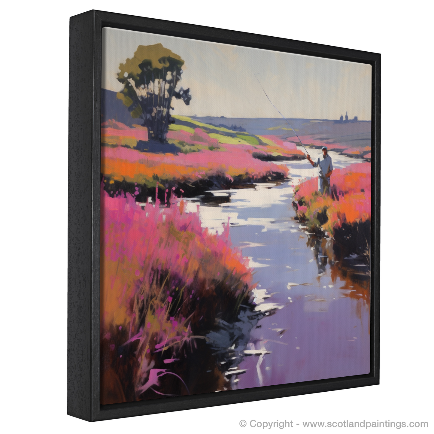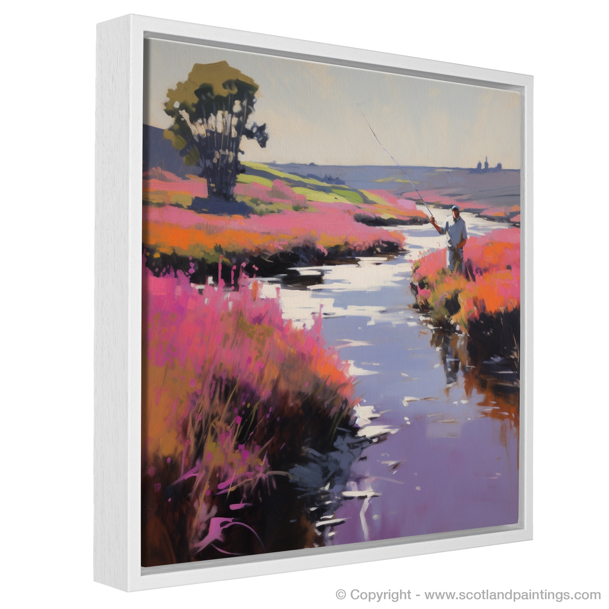 Encircling the angler, the heathland comes alive with a flourish of heather; its blooms paint a vivacious tapestry in shades of pink and mauve, a testament to the wild beauty of Scotland's countryside. The plants dance with the gentle caress of the unseen breeze, their vivid hues enriched by the gentle glow of sunlight.