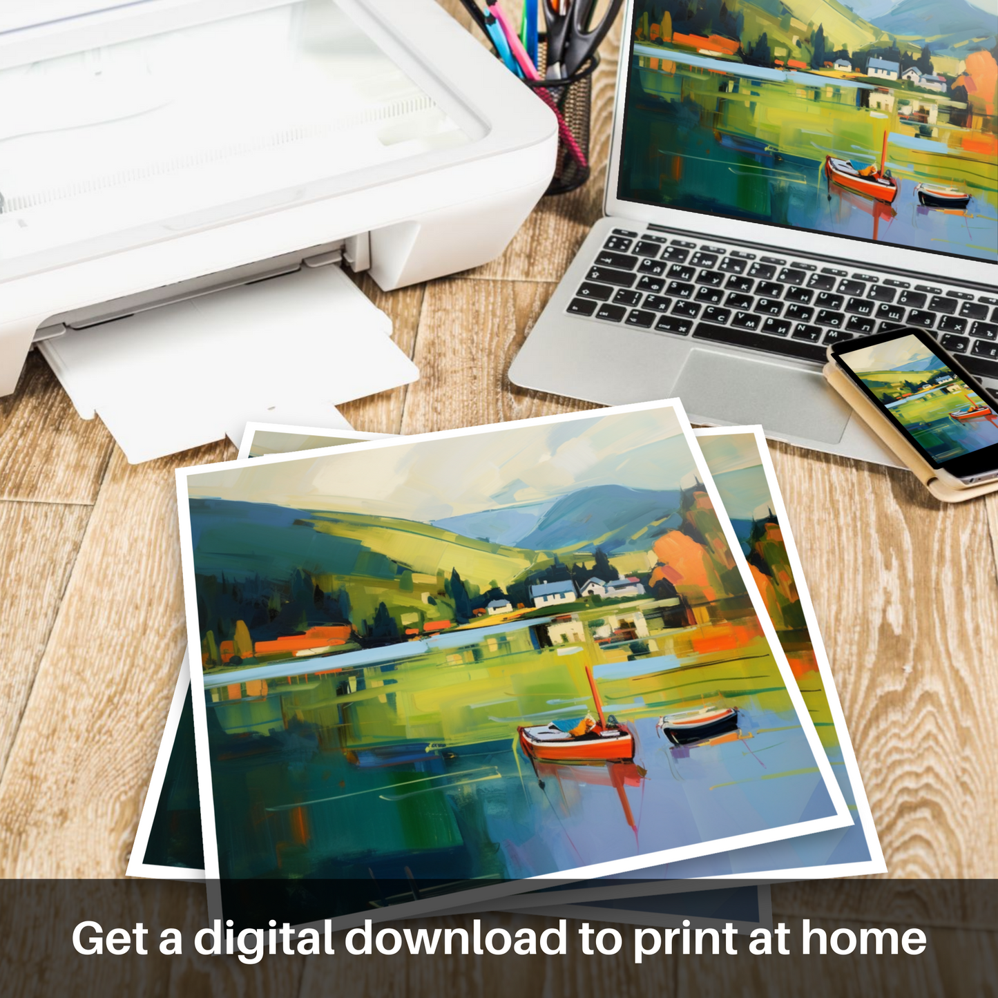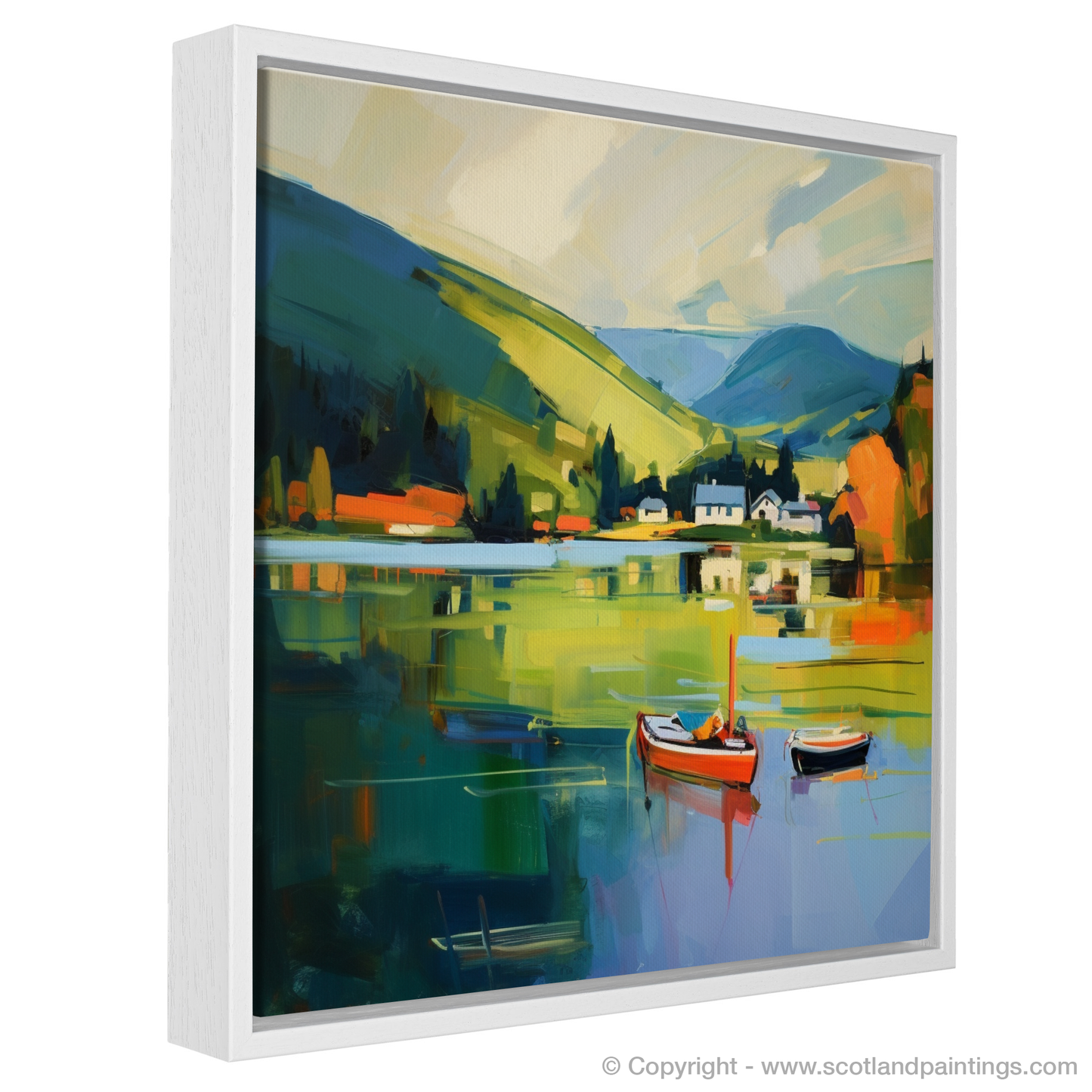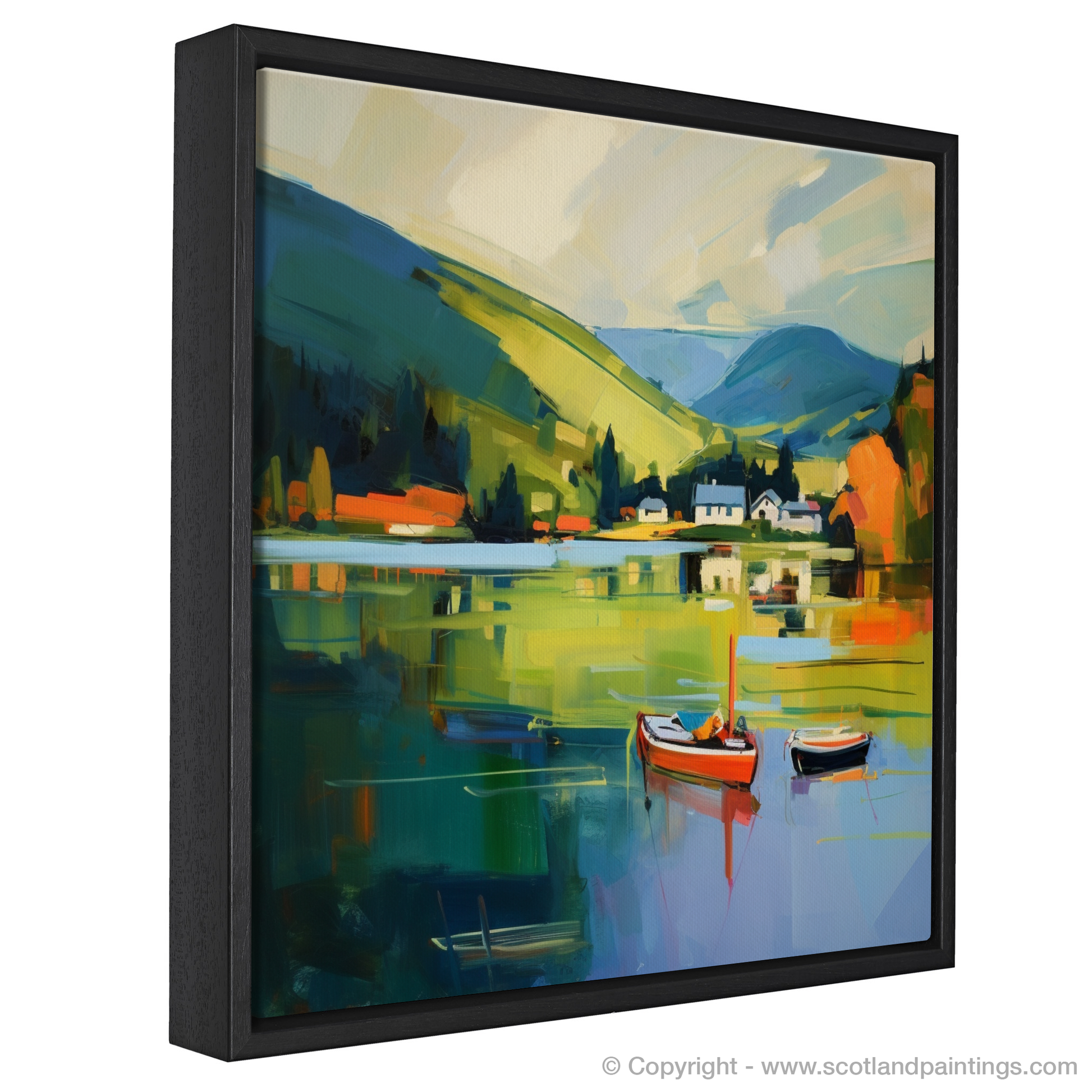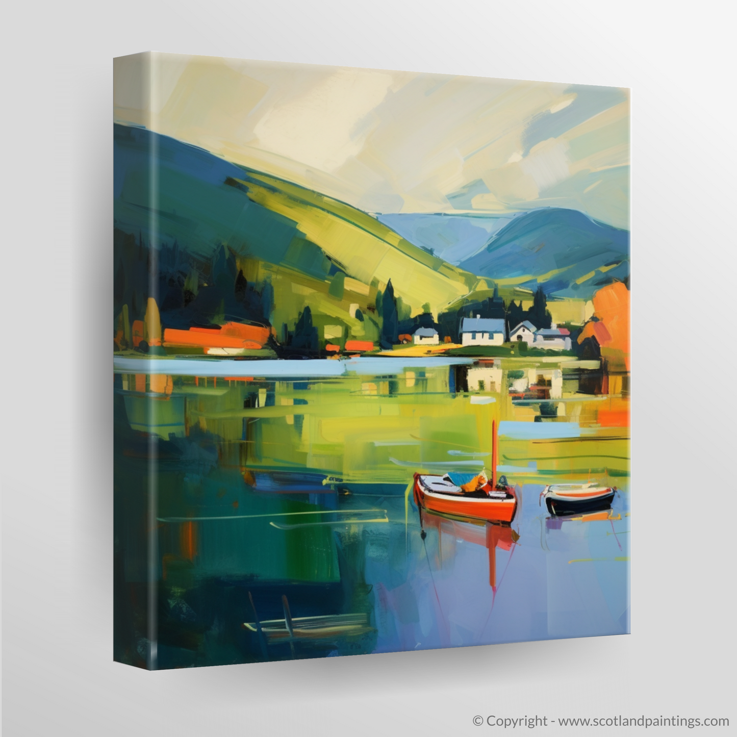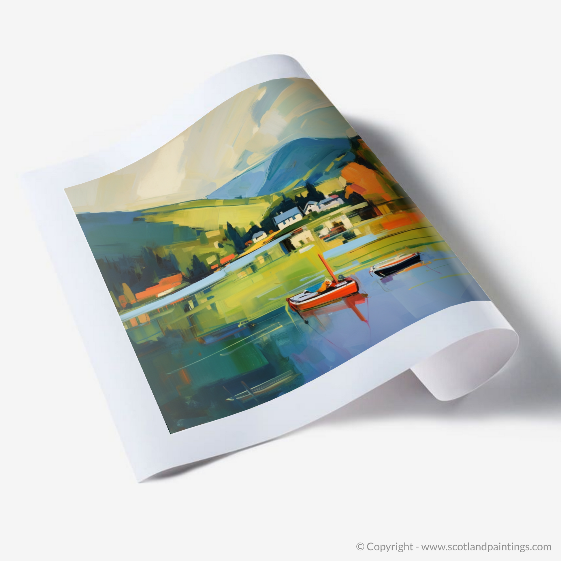 Captured in a cascade of vibrant hues and sweeping brushstrokes, this evocative print brings the serene majesty of Loch Tay to life. Through a contemporary lens, the dynamic interplay of colour conveys the loch's tranquil waters, reflecting a harmonious blend of sky and land with painterly sophistication. Resting upon the glassy surface, two small boats provide a charming focal point, their solid forms a stark contrast to the fluidity that surrounds them. A smattering of quaint white houses nestle amidst the rolling hills, embraced by verdant swaths of countryside that accentuates the peaceful solitude of Perthshire's natural grandeur.