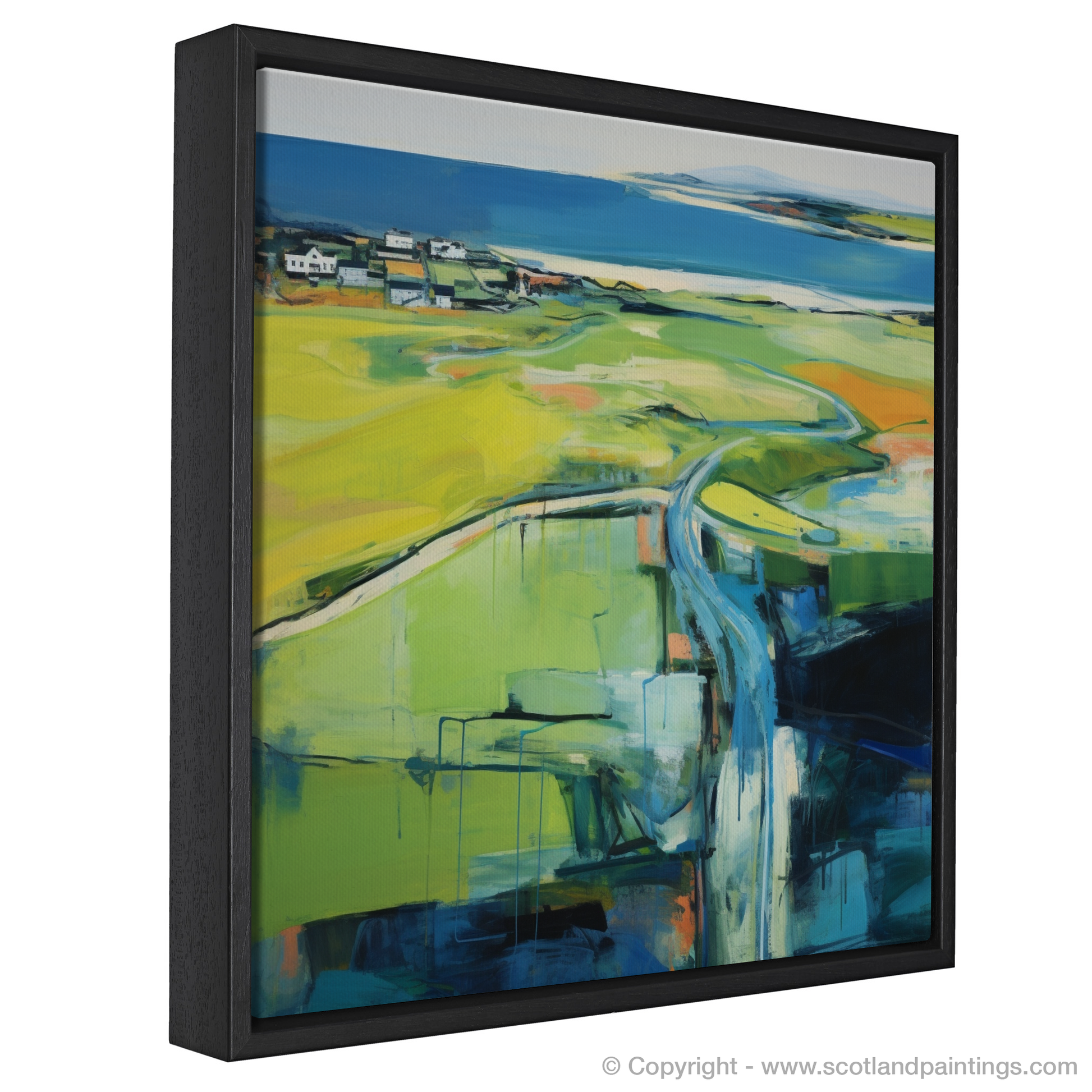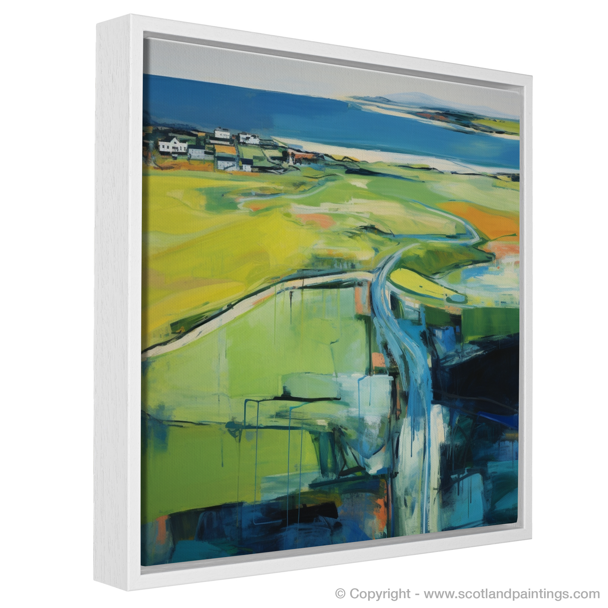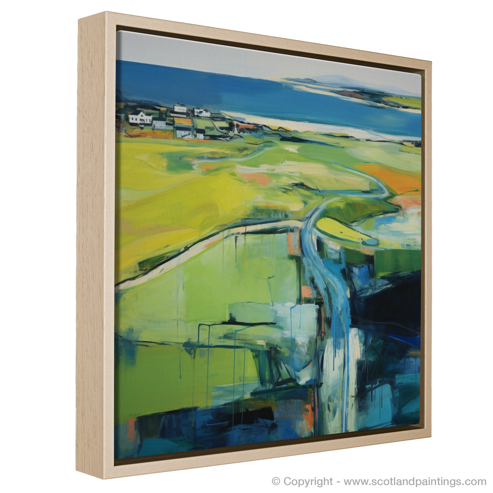 An amalgamation of greens, from lime to olive, dance across the canvas, intermingling with splashes of cobalt blue, suggesting the sea kissing the horizon. Yellows and oranges burst forth, reminiscent of the fields and links that characterise this landscape, suffused with light that seems to be both part of the sky and the land itself.