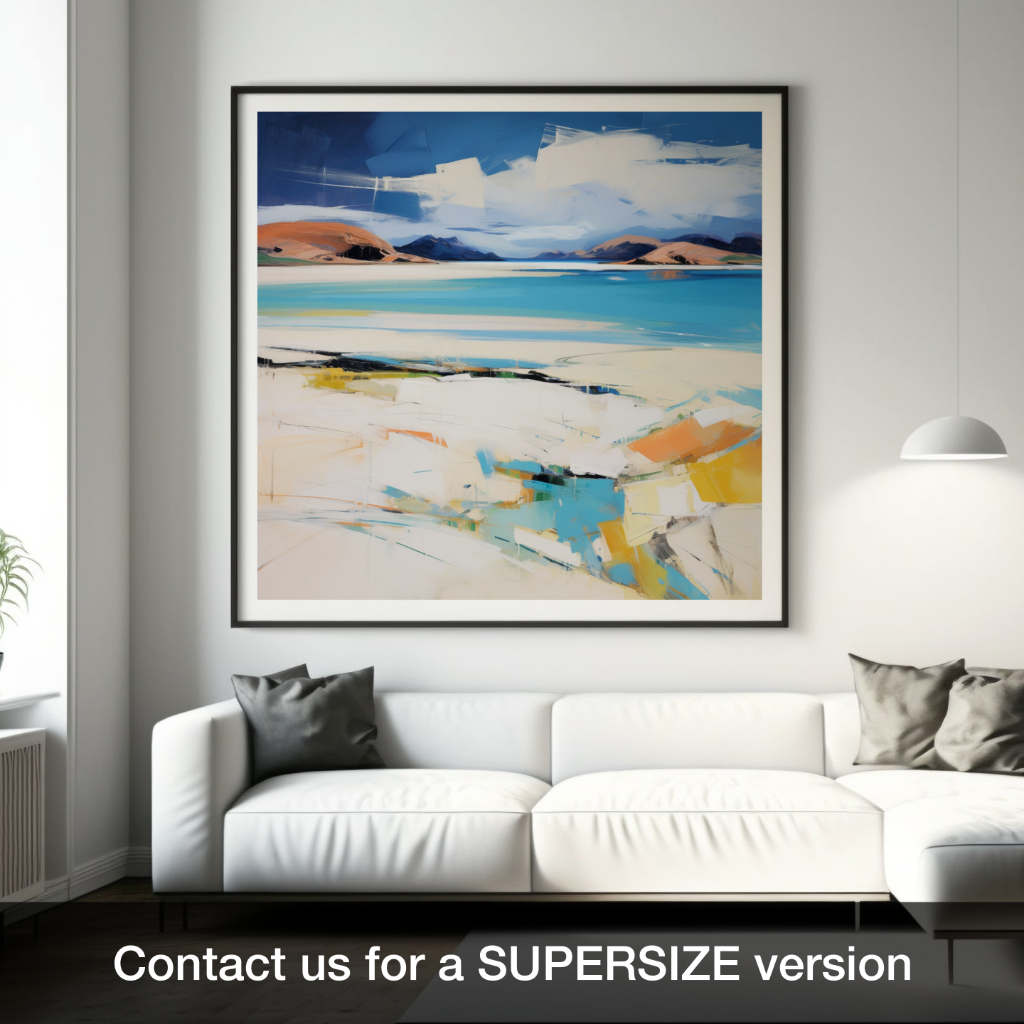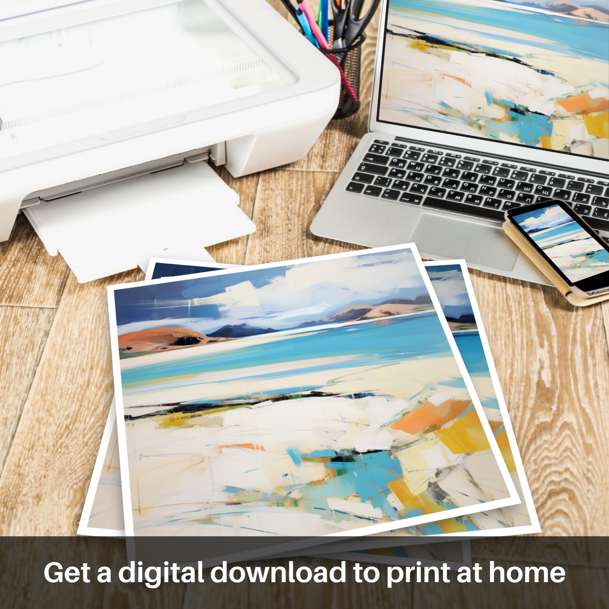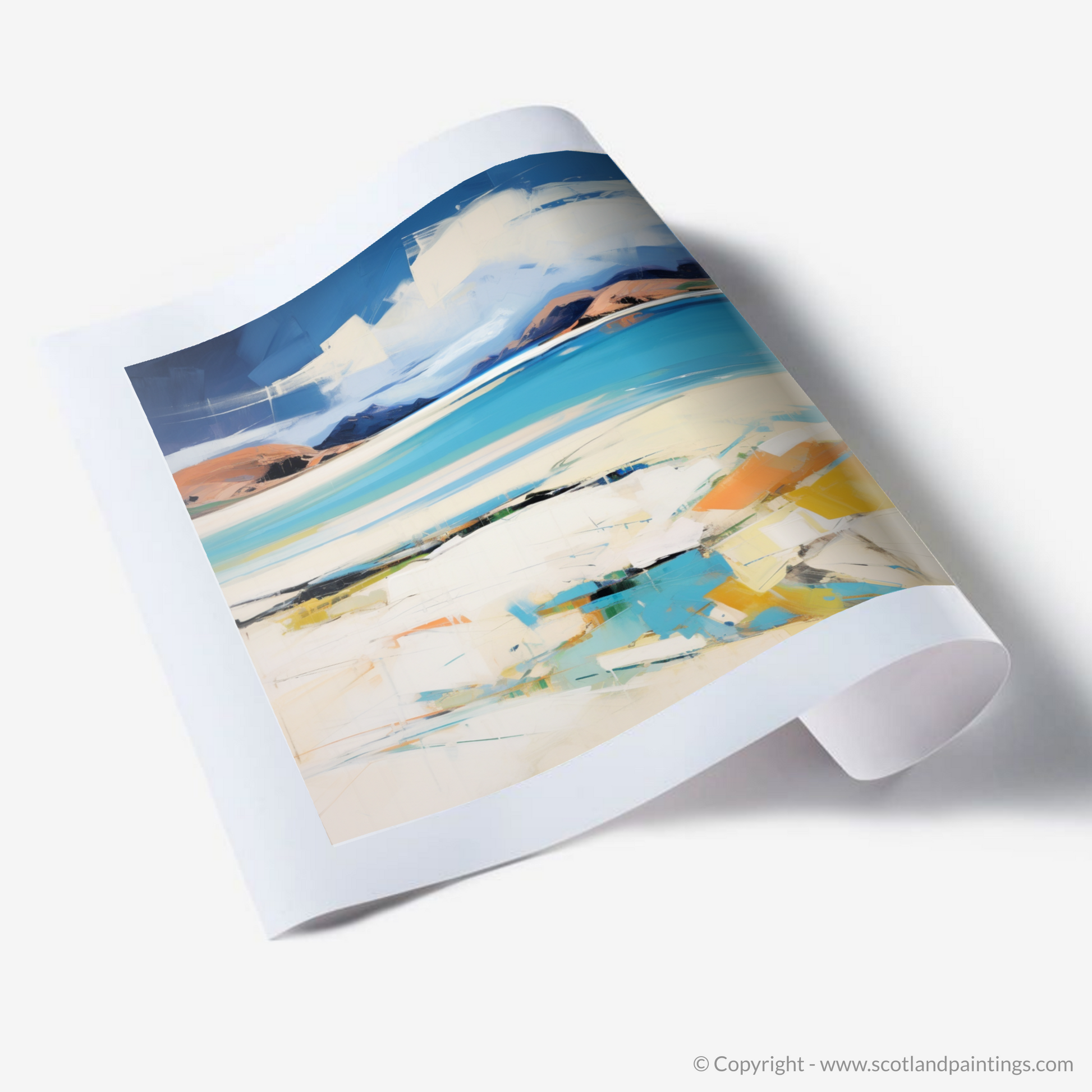 Immerse yourself in the fluid dynamics of land and sea with this mesmerising print inspired by Mellon Udrigle Beach in the serene Scottish Highlands. Swirls of azure and cerulean blues converge, evoking the gentle lapping of waves against a secluded cove, while the distant, rolling hills are rendered in earthy tones that suggest the soft glow of the afternoon sun. The precious sands seem to shimmer in a symphony of golden yellows and creamy whites, capturing the fleeting moment of sunlight dancing across the shore.