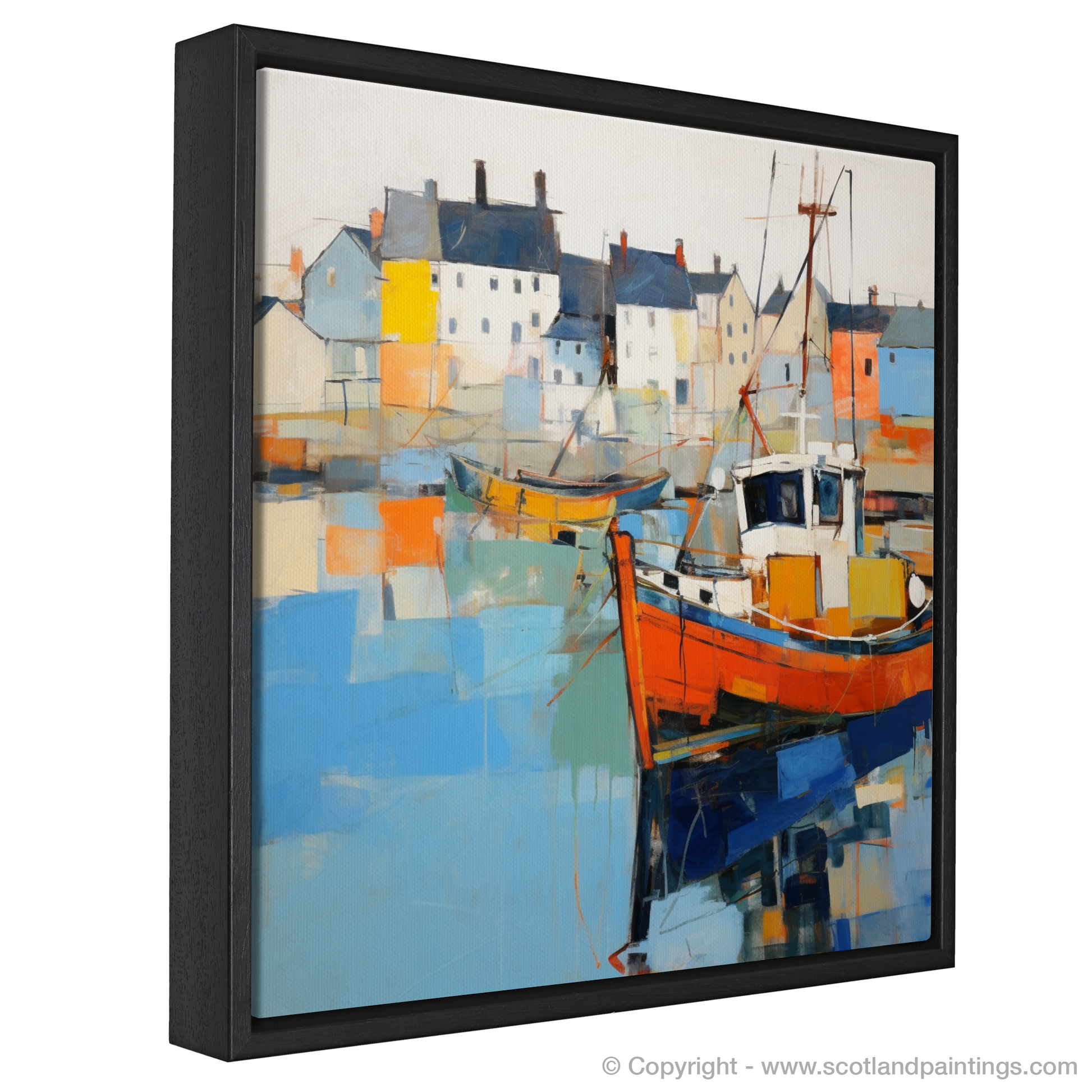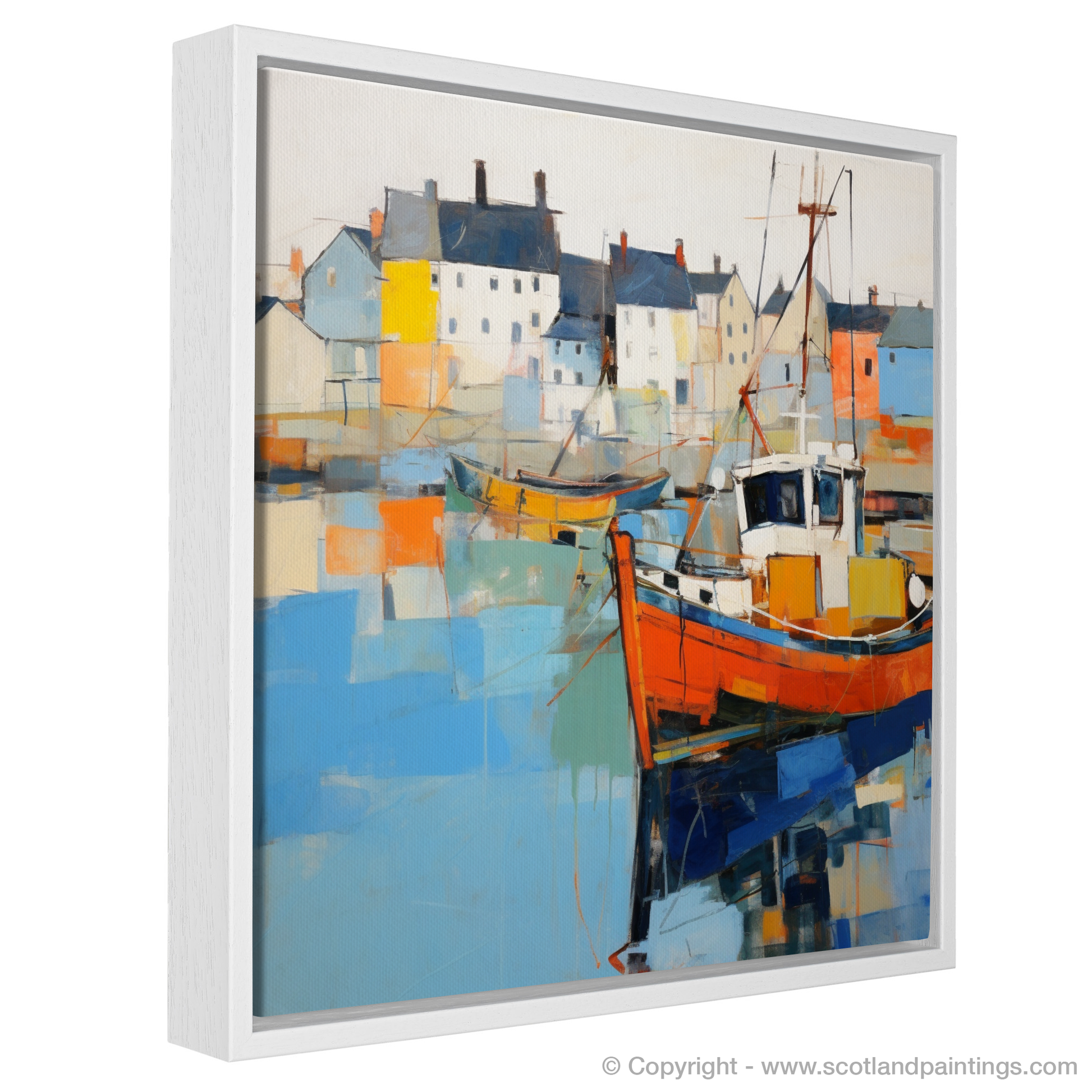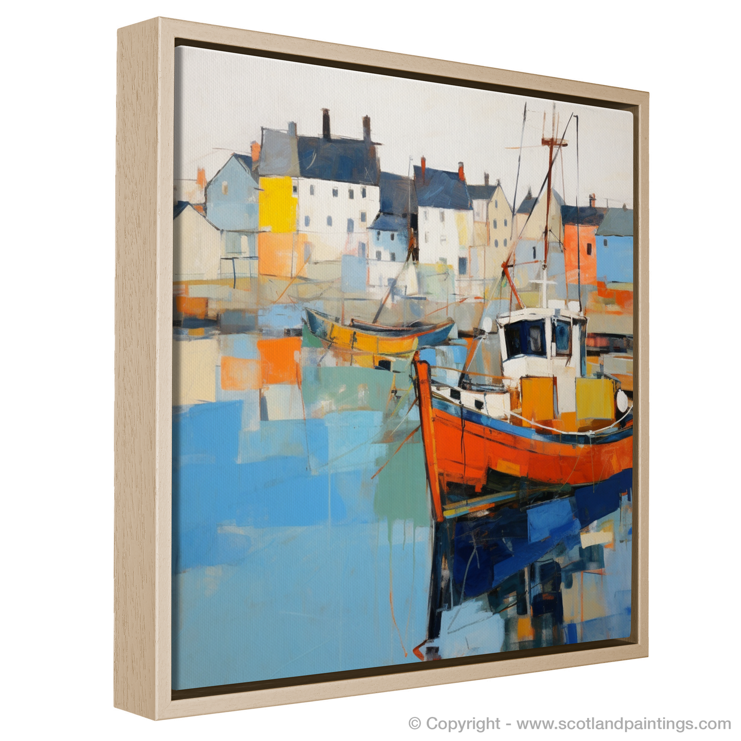 The composition is a harmonious blend of sea and architecture, painted in a style reminiscent of Abstract Impressionism. Blocks of vivid colour hint at reflection and depth, with shades of cobalt and cerulean evoking the calm, cool waters of the harbour. Bursts of warm oranges, yellows, and reds suggest the sun-drenched facades of the coastal buildings and the rugged charm of fishing boats moored along the quayside.