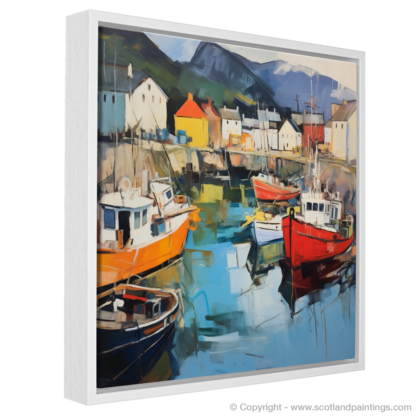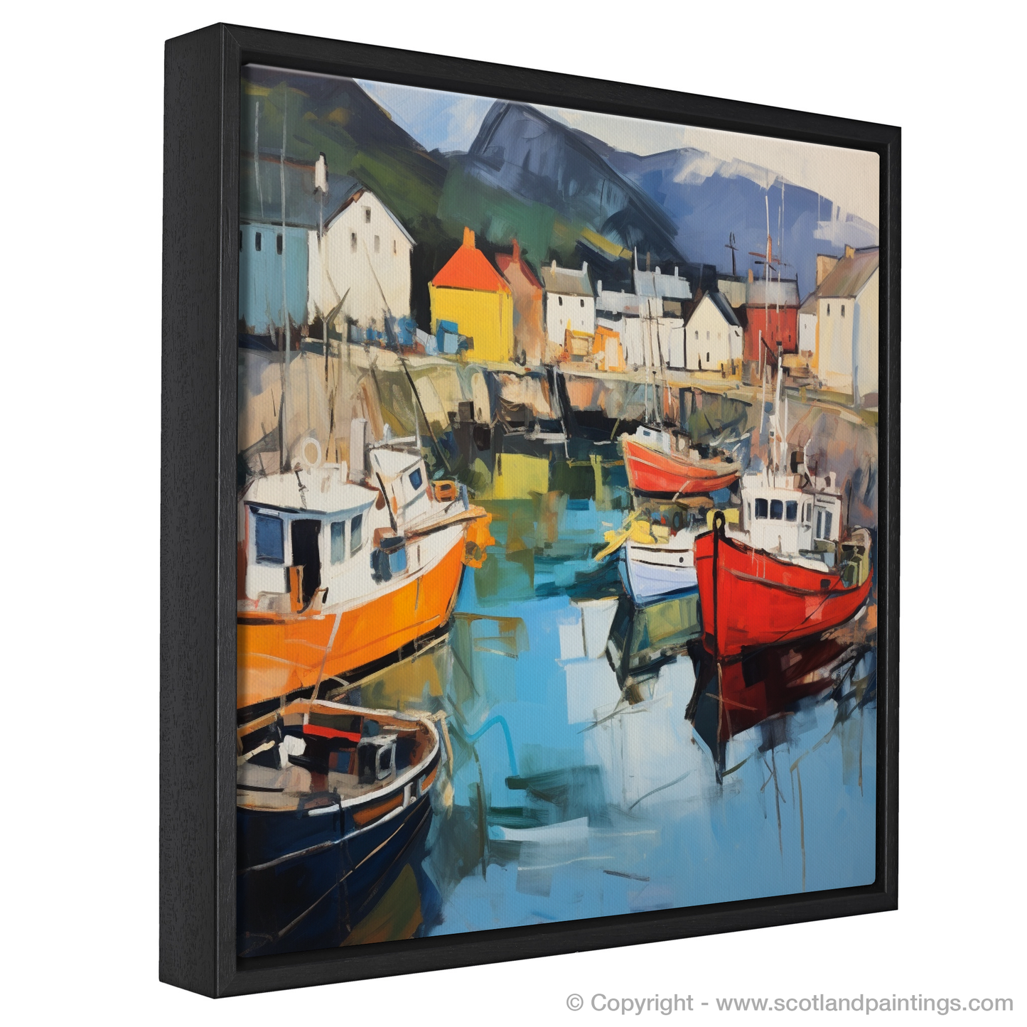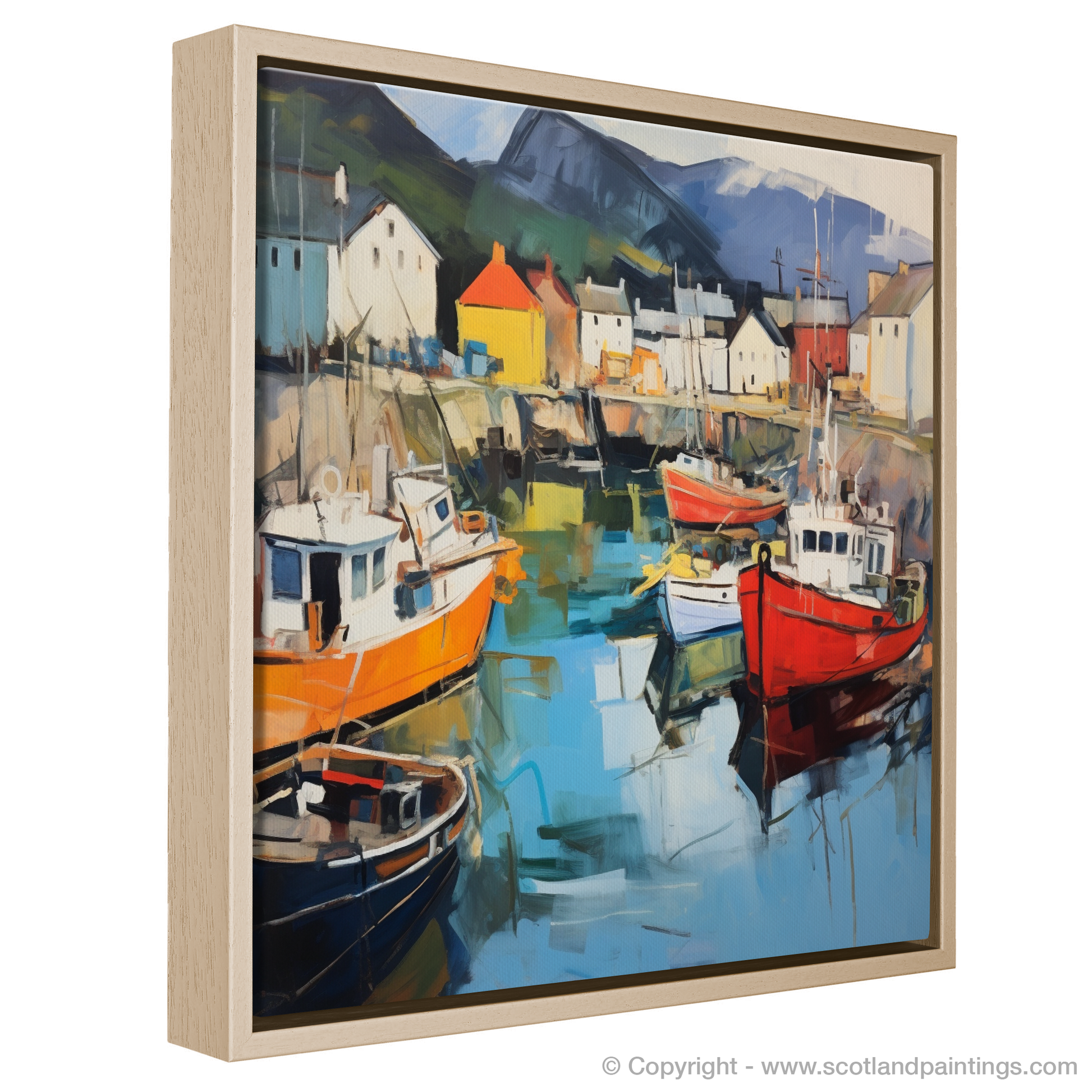 Emanating the raw spirit of Mallaig Harbour, this evocative print captures the essence of a charming Scottish port through a whirlwind of abstract expressionist flair. Vivid hues dance across the canvas, where the central focus falls upon the gleaming vessels that rest gently upon the mirrored waters. Bold oranges and deep reds tell the tale of hardy fishing boats, landmarks of the harbour's industrious soul.