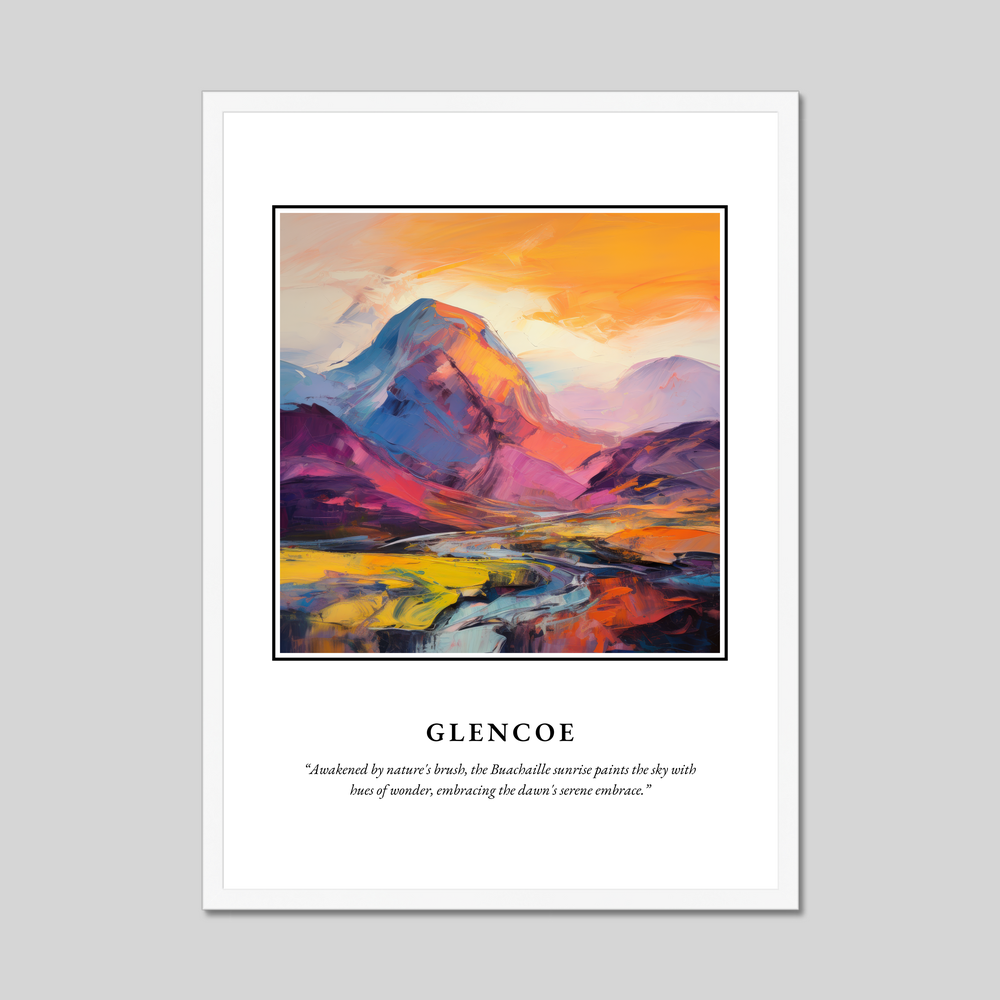 At the top, the word "SCOTLAND" is emblazoned in bold letters, drawing attention to the enchanting scene beneath it—an abstract expressionist painting of Glencoe. The painting bursts with vibrant swathes of colour, capturing the essence of a Buachaille sunrise, where hues of deep purples, fiery oranges, and warm yellows meld together in a symphony of visual delight. Below, the evocative quote, “Awakened by nature's brush, the Buachaille sunrise paints the sky with hues of wonder, embracing the dawn's serene embrace,” encapsulates the magical scene, underscoring the profound connection between nature and art.