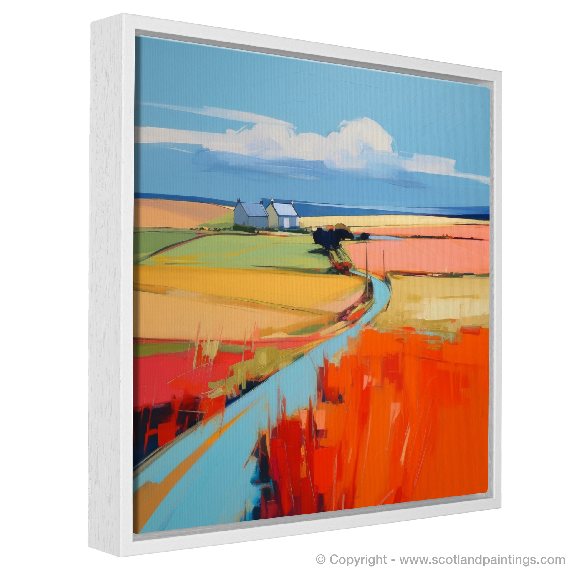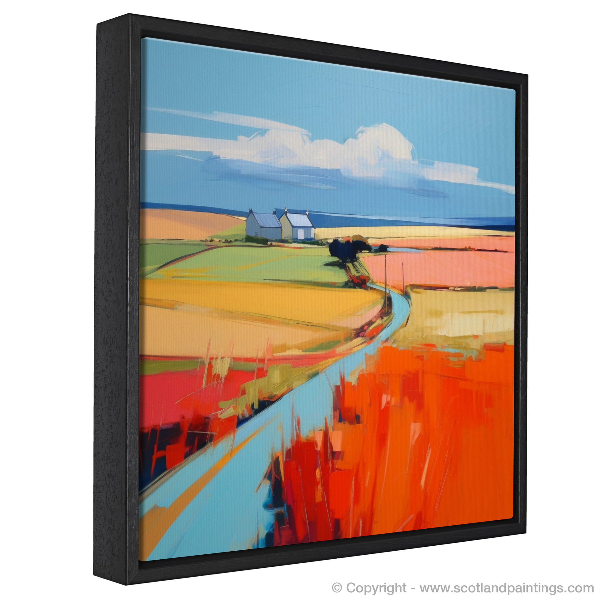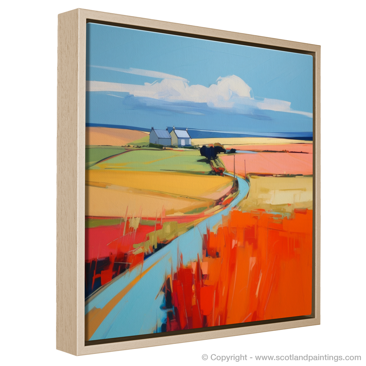Immerse yourself in the vibrant essence of Newburgh, Aberdeenshire, through this compelling contemporary print. The scene arrests the imagination with its bold and sweeping brushstrokes, encapsulating the rural charm and picturesque landscapes that define the quaint Scottish village. A sensual palette of azure blues, vivid oranges, and golden yellows brings forth a sense of warmth and the soft light of a serene day, casting an almost tangible glow across the canvas.