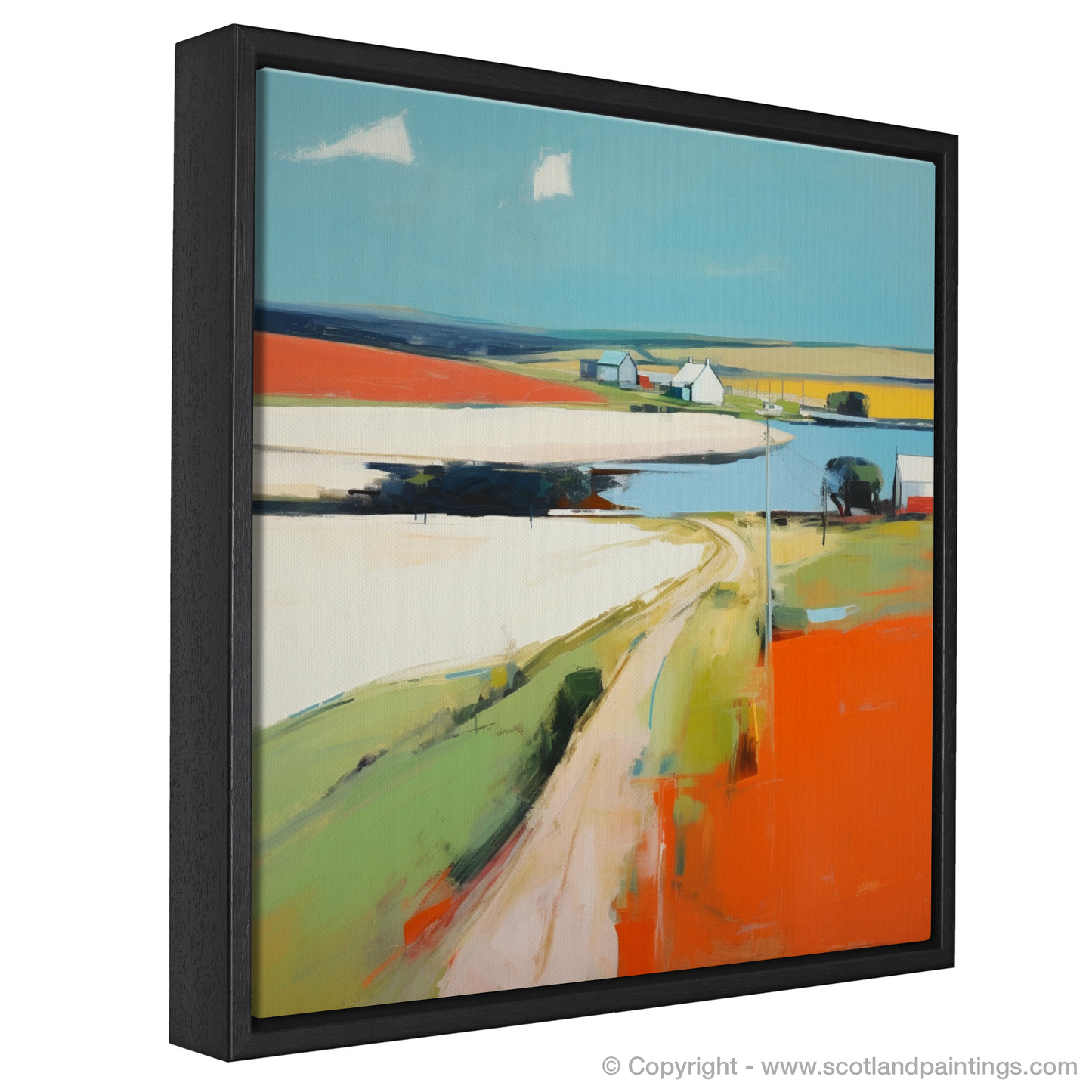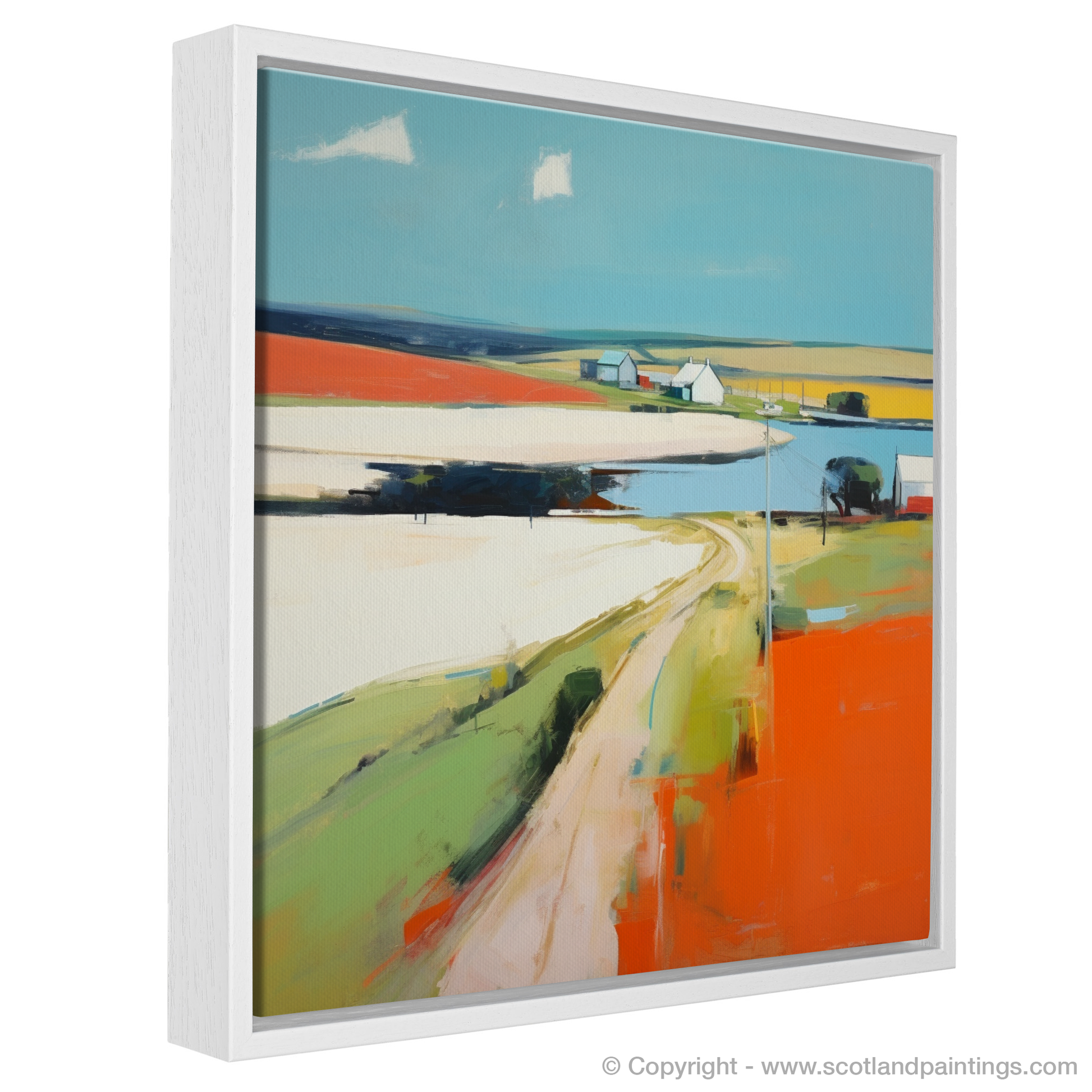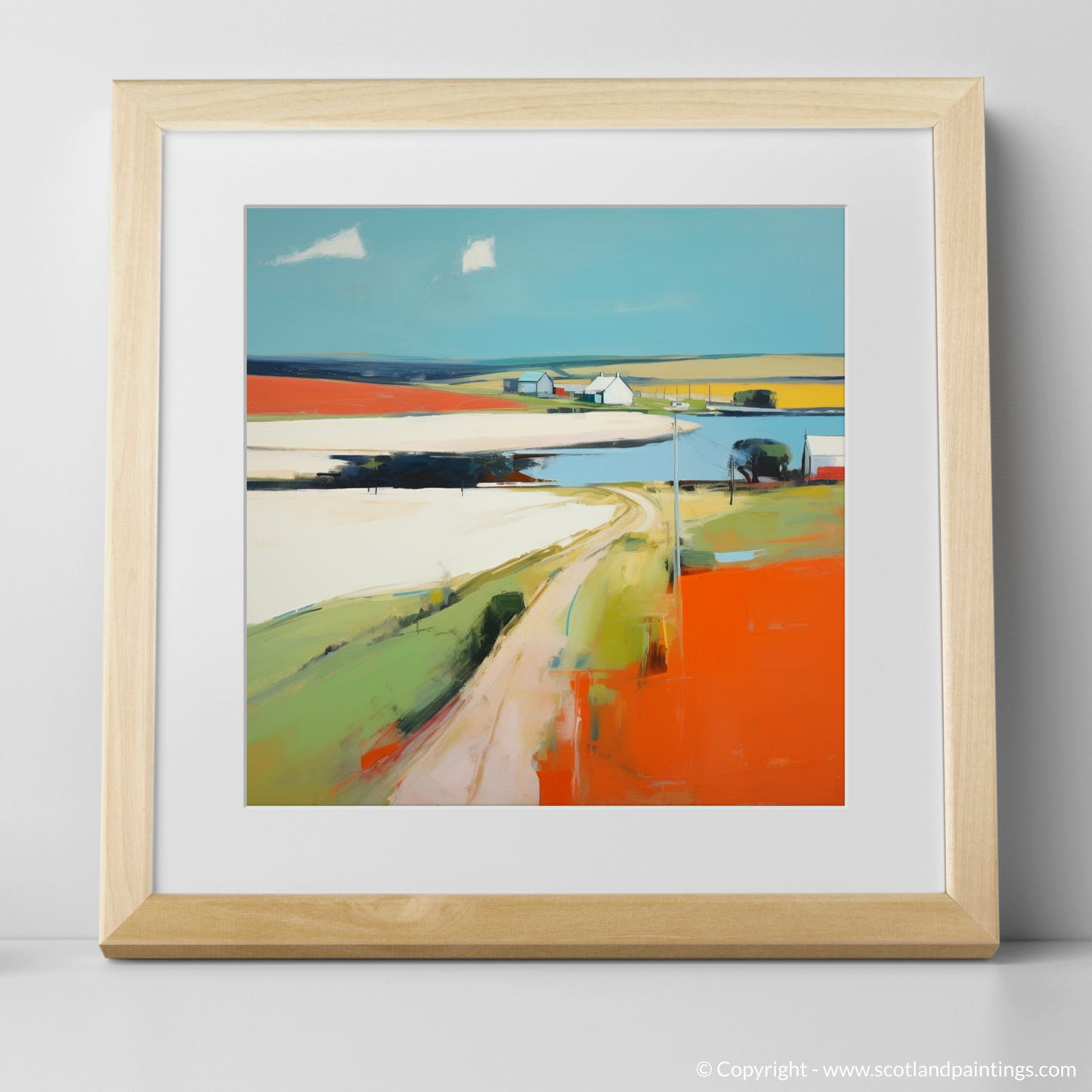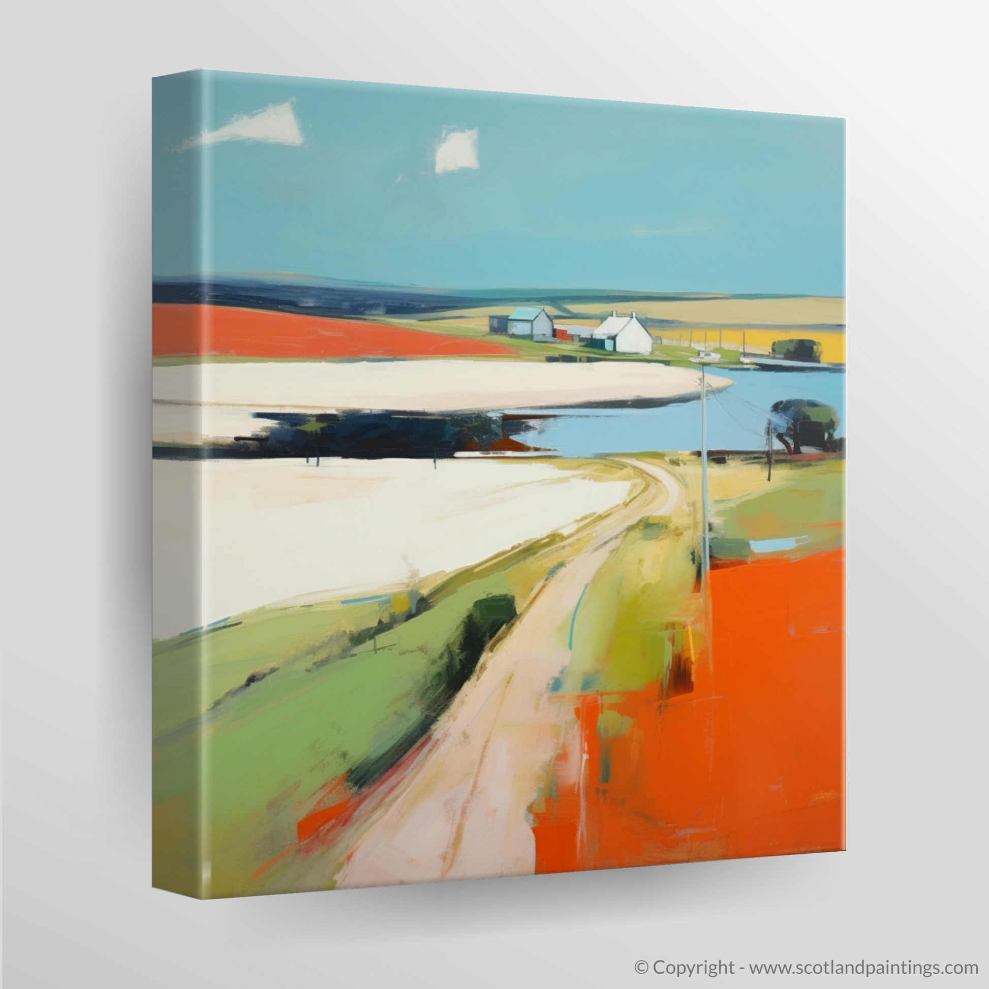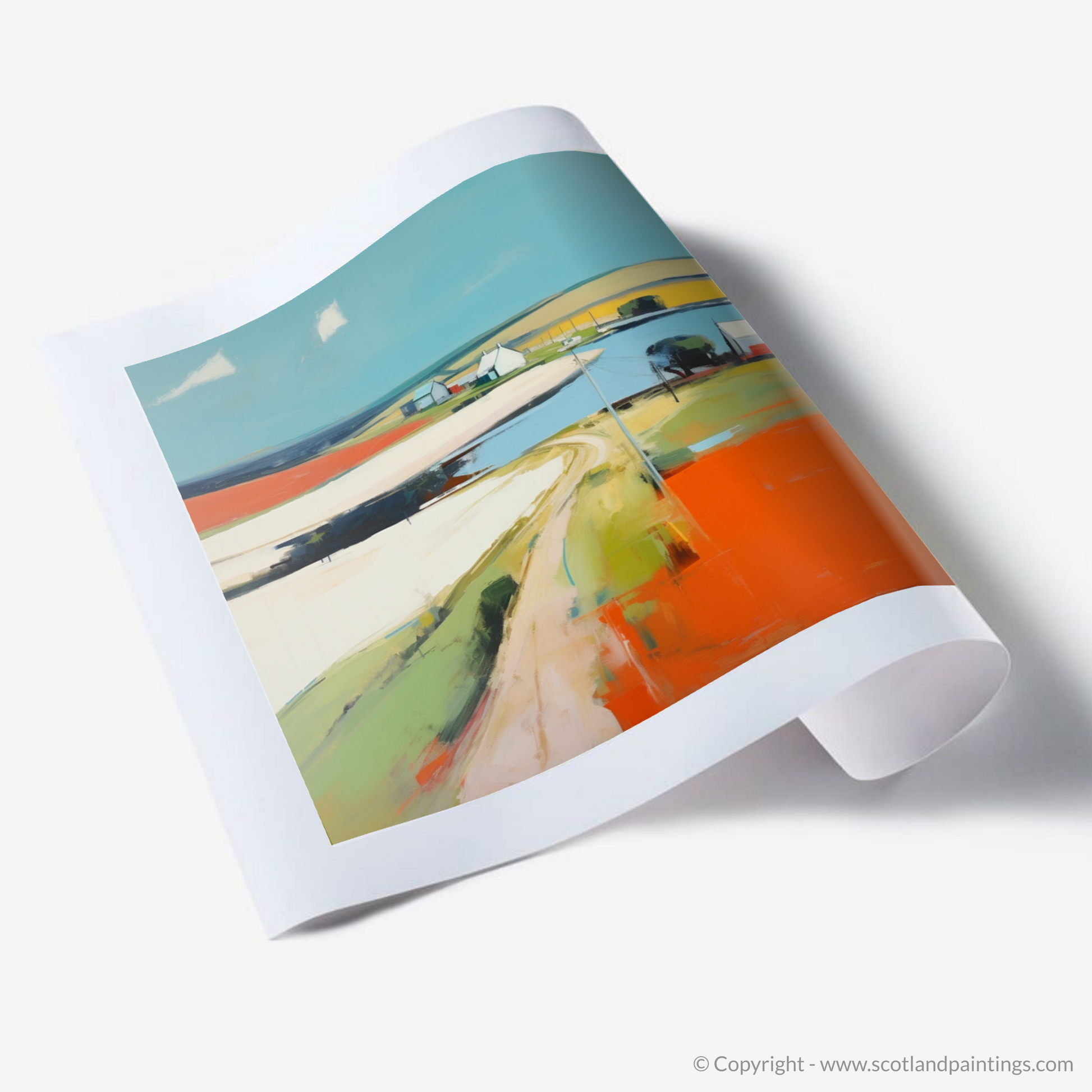 Immerse yourself in the vibrant tapestry of Newburgh with this compelling contemporary piece, capturing the unique essence of Aberdeenshire's serene village charm. This painting sings with a palette of bold, expressive colours that evoke the warm, raw beauty of the Scottish landscape. A sinuous road meanders through the composition, a ribbon of pale ochre against the bright, fiery hue of the foreground, whispering of journeys and stories held within this timeless place.