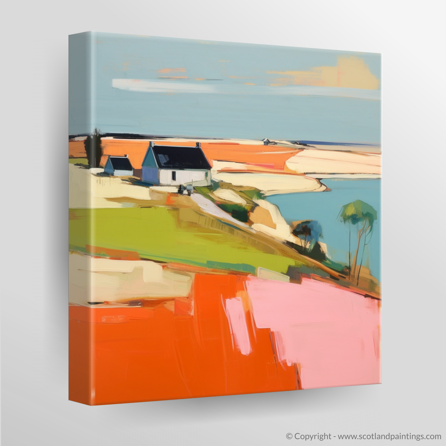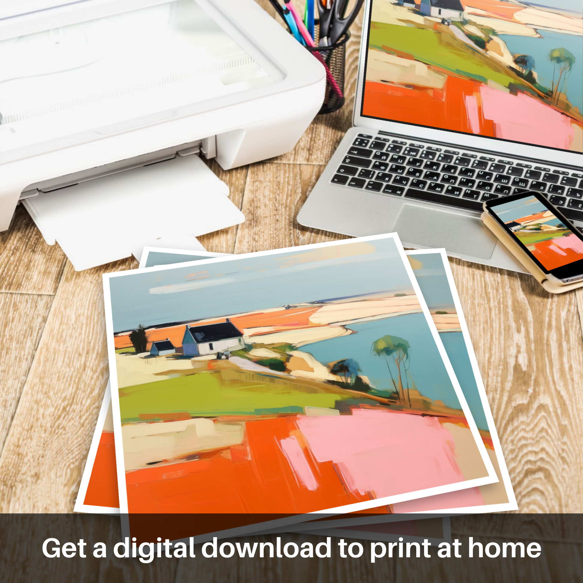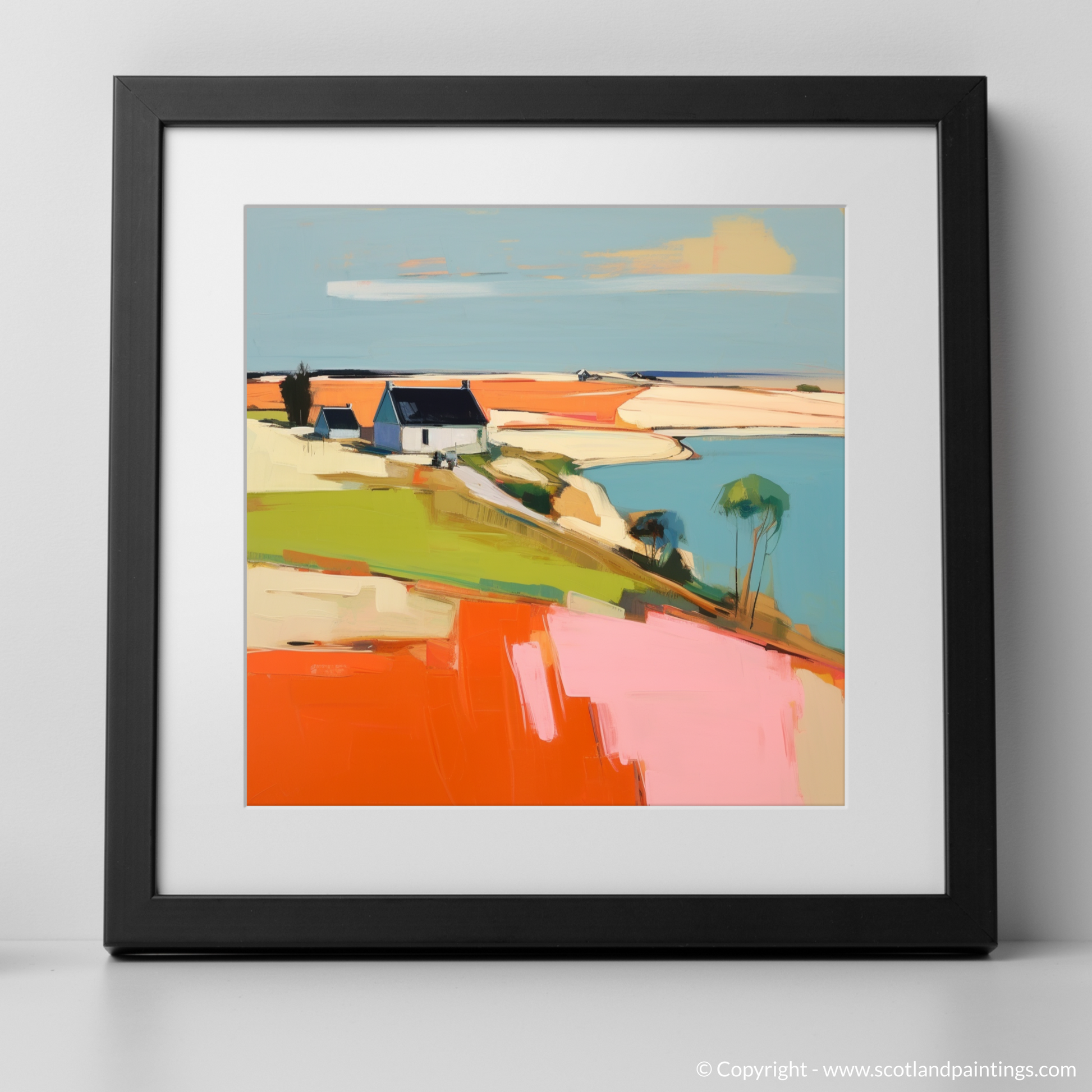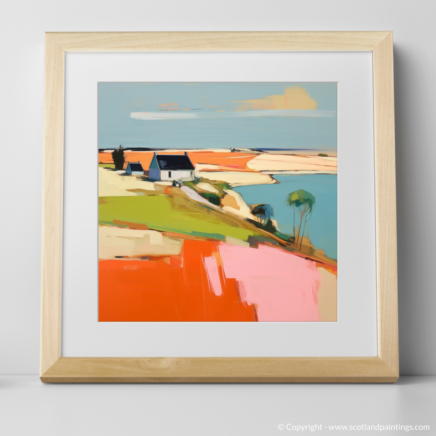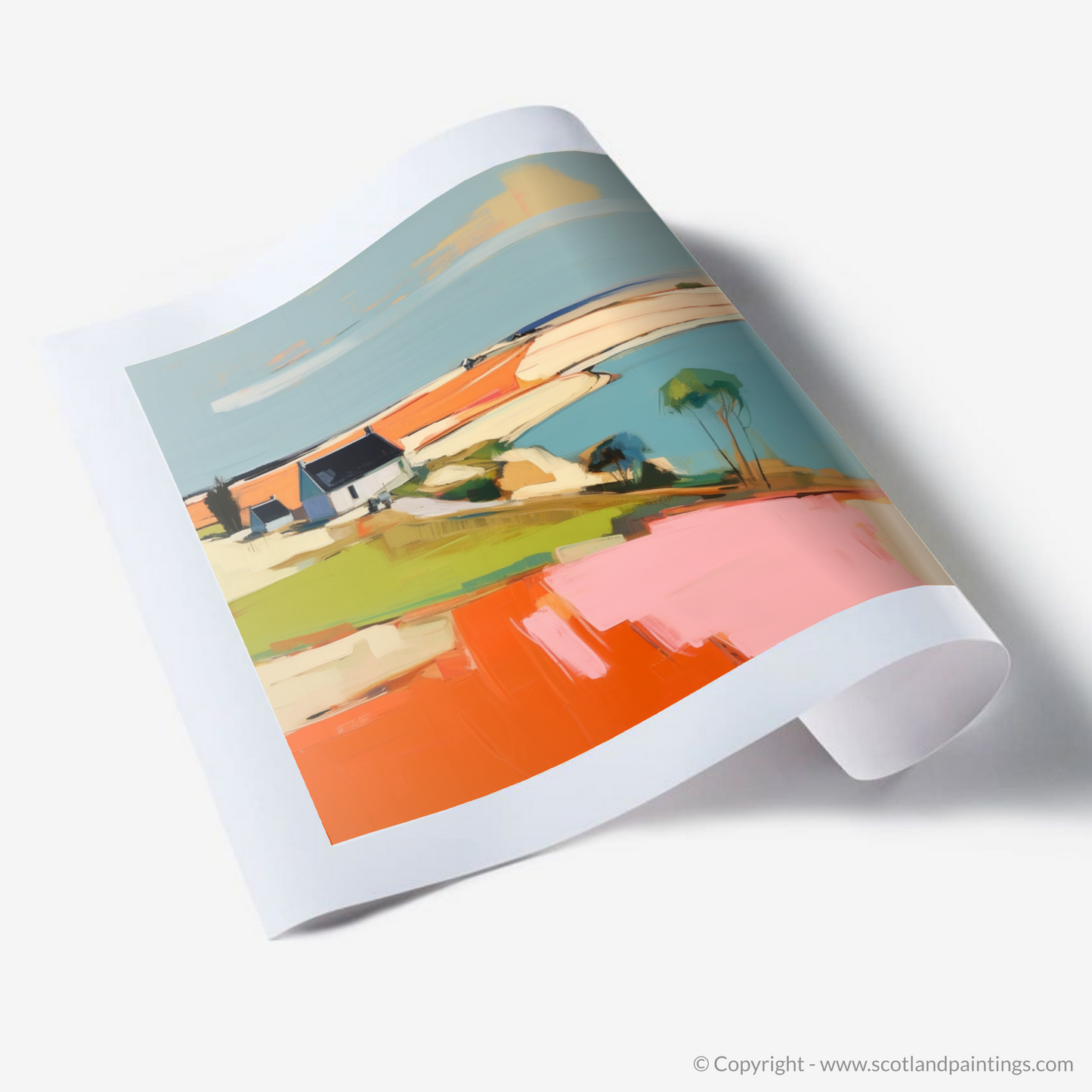 Immerse yourself in the vivid hues and bold brushstrokes of this evocative print, which captures the essence of Newburgh, Aberdeenshire, with a contemporary flair. The viewer is drawn into an idyllic scene that radiates a sense of calm and rustic charm. A crisp white cottage nestles at the heart of the composition, its classic architecture a bright focal point against the varied tapestry of the surrounding land.