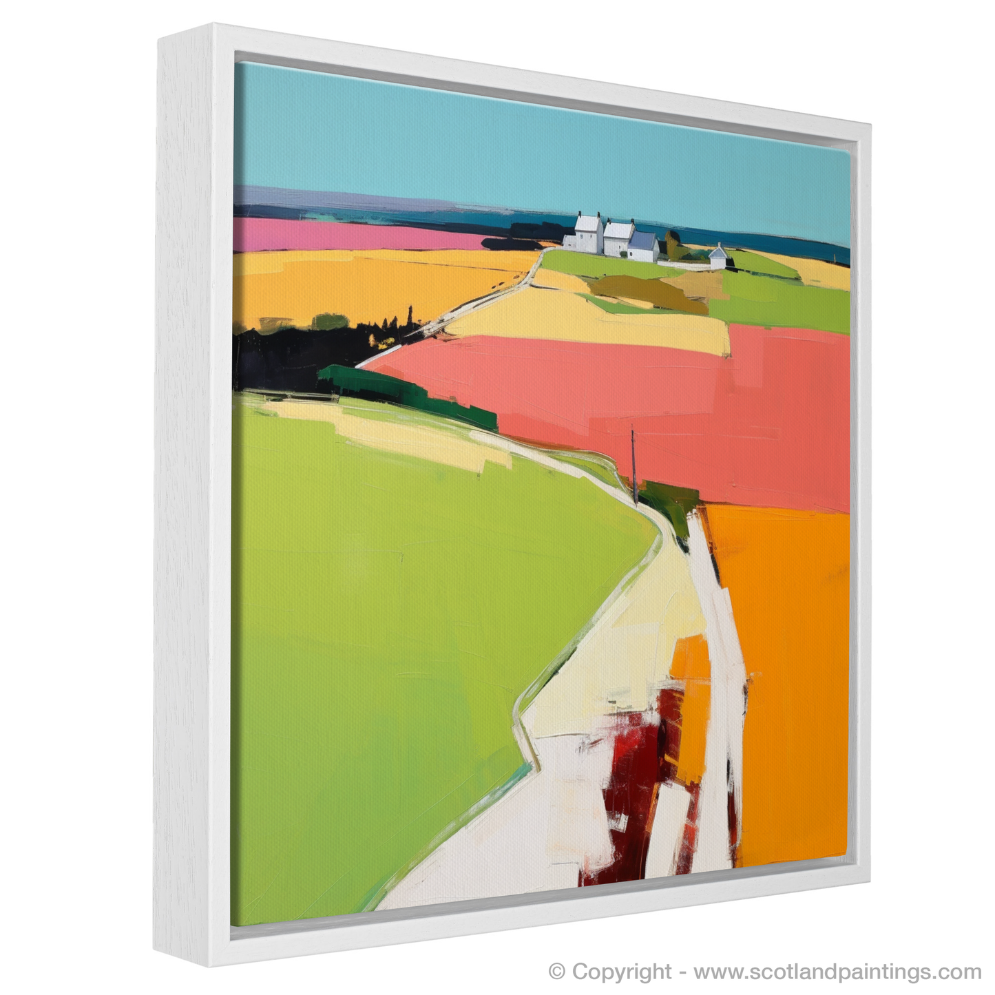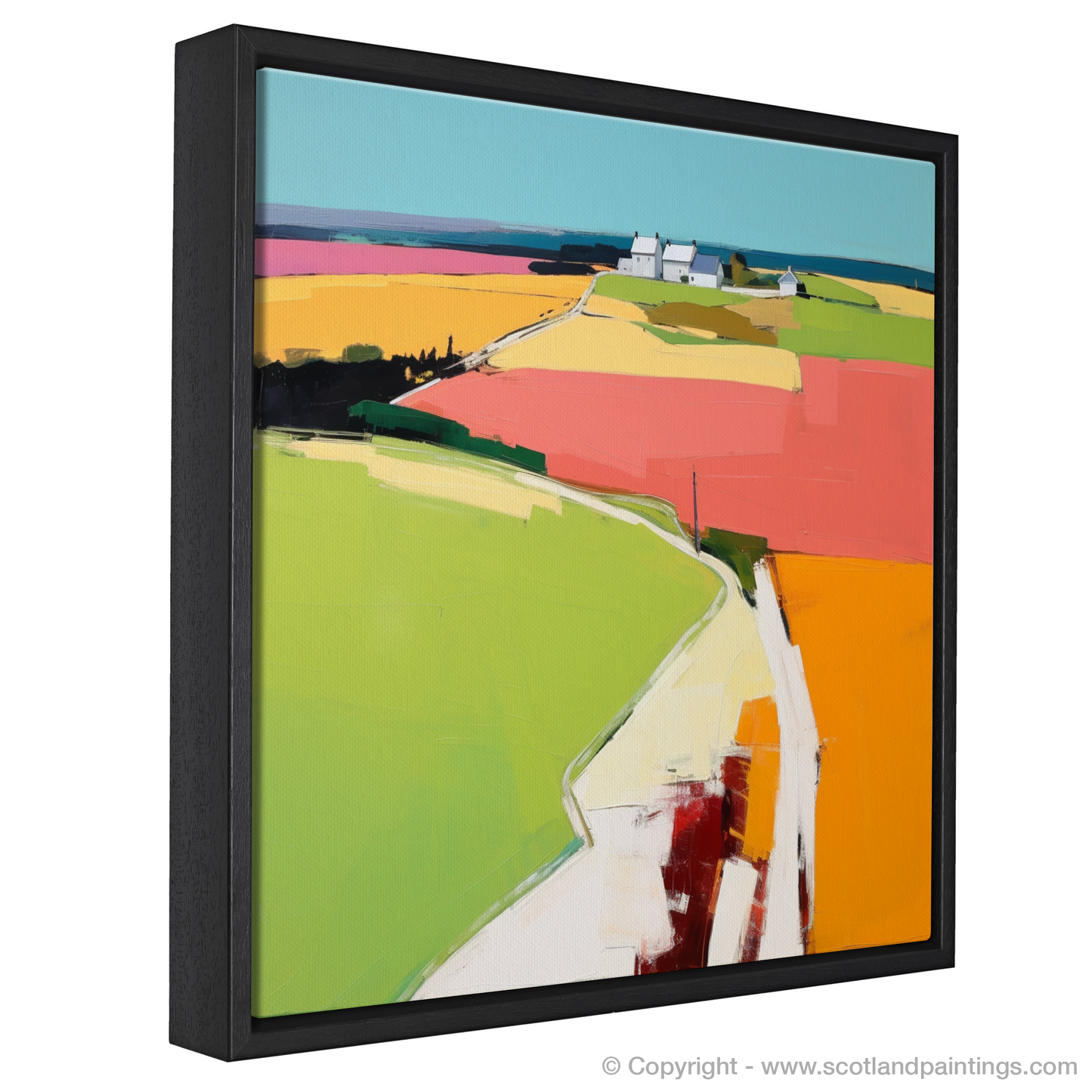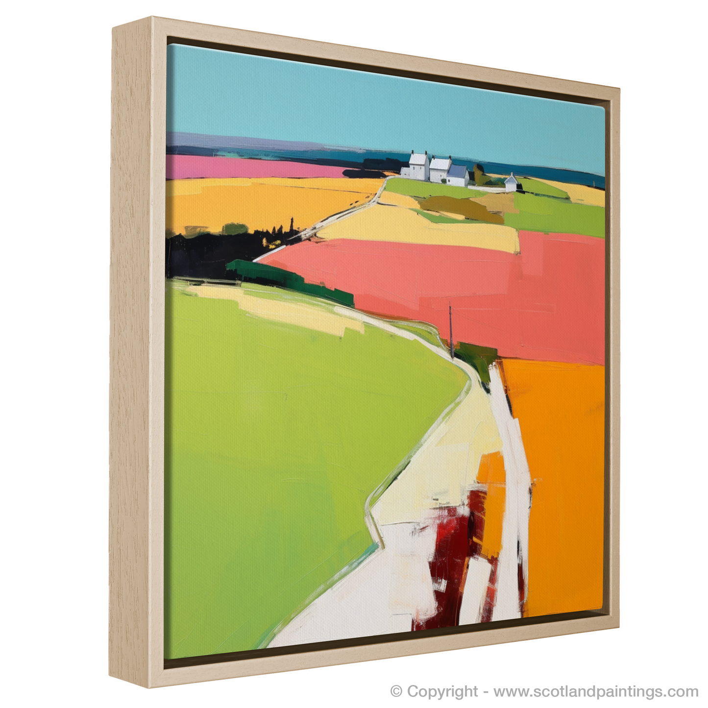 Capturing the essence of Newburgh, Aberdeenshire through a contemporary lens, this vibrant print invites the viewer into a stylised interpretation of one of Scotland’s picturesque villages, nestled along the northeastern coast. The composition boasts a mesmerising patchwork of fields, whose boundaries blend effortlessly into a tapestry of bold, abstract blocks of colour. Golds, pinks, blues, and greens dominate the scene, suggesting a landscape alive with the growth and flowering of plants under a vast sky.