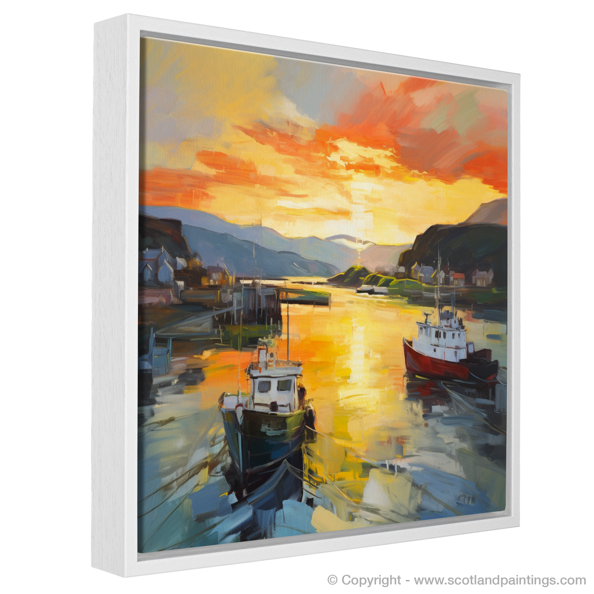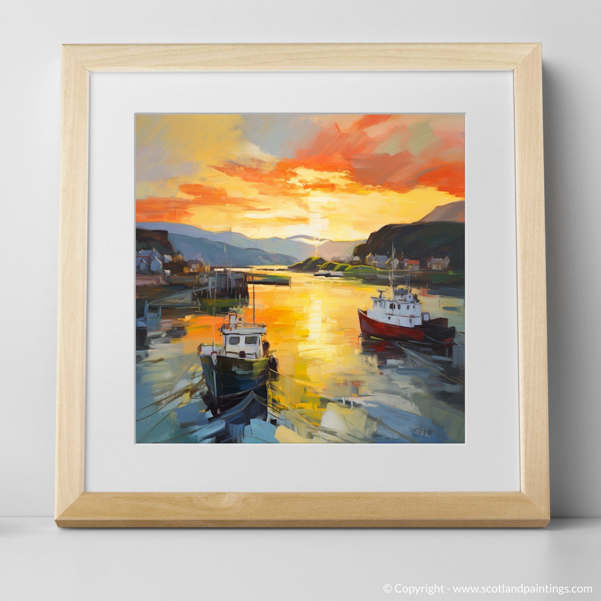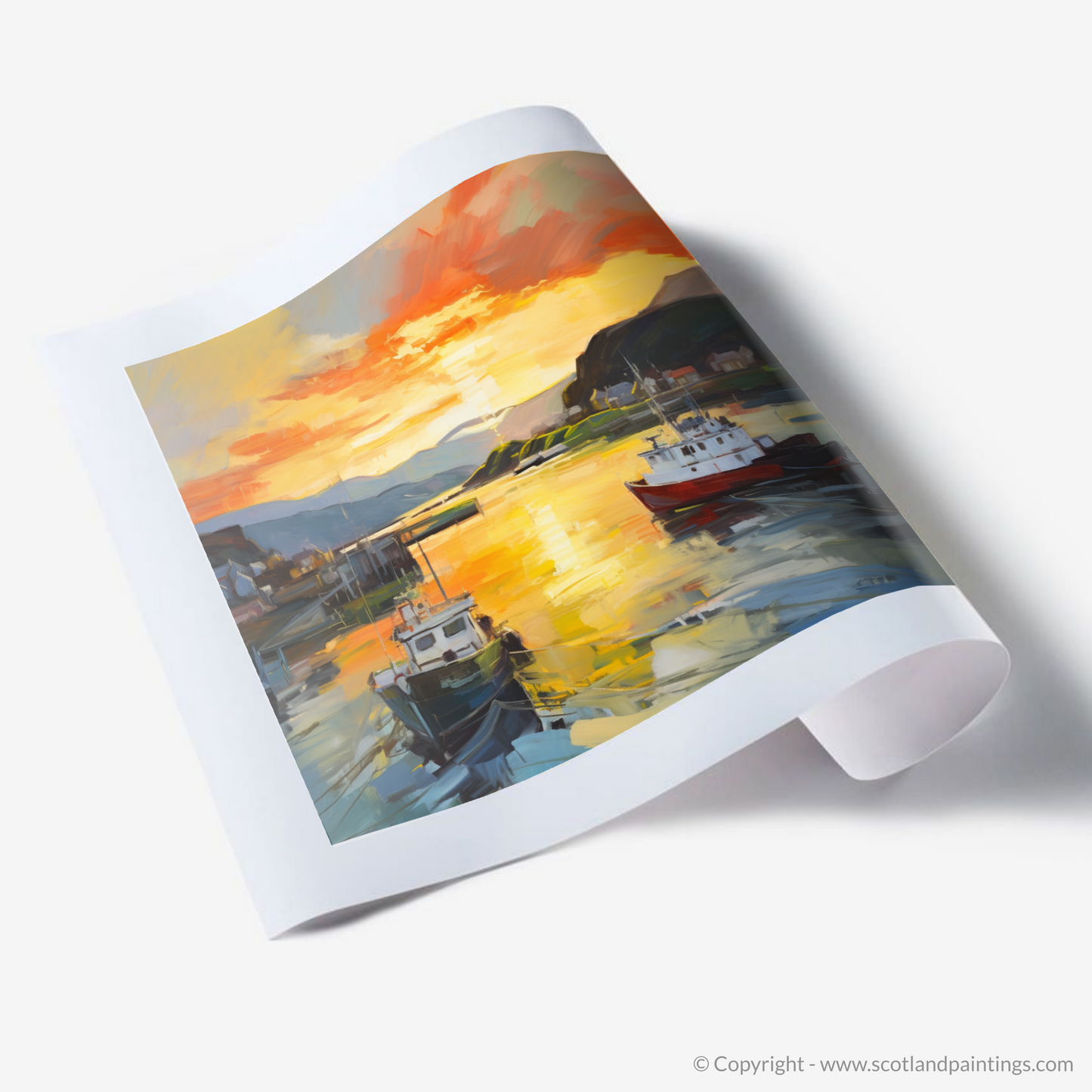 Capturing the transient allure of Oban Harbour as day yields to dusk, this evocative print radiates the spellbinding glow of the golden hour. Sweeps of vibrant colour conjure the serene atmosphere of a Scottish evening, as the setting sun bestows a fiery kiss upon the tranquil waters.