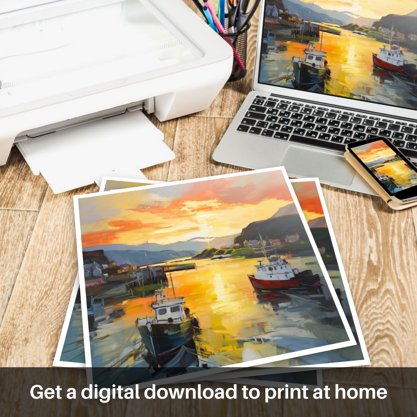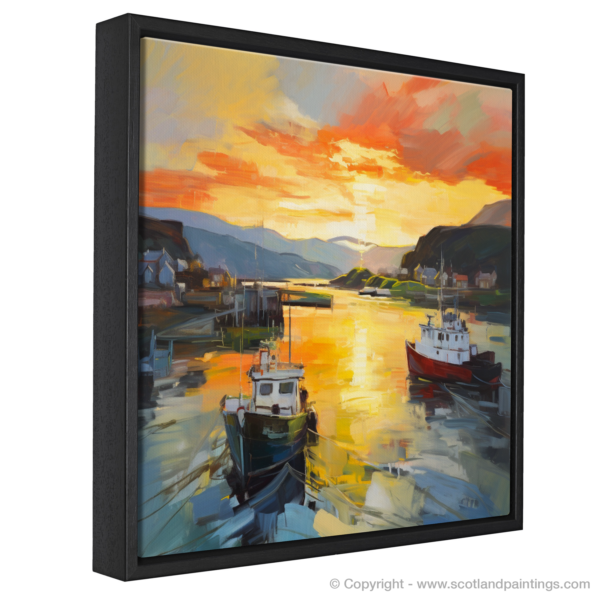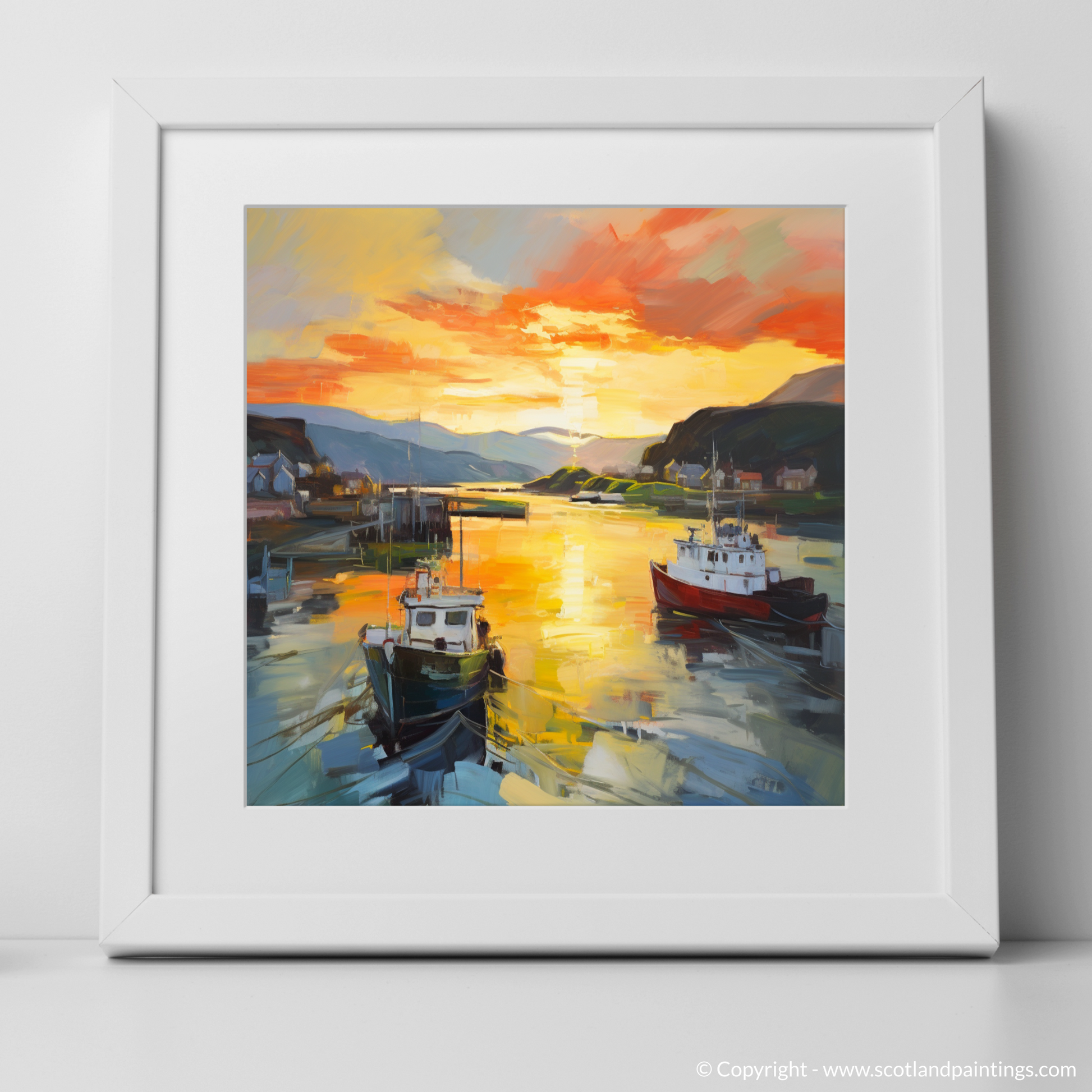 Capturing the transient allure of Oban Harbour as day yields to dusk, this evocative print radiates the spellbinding glow of the golden hour. Sweeps of vibrant colour conjure the serene atmosphere of a Scottish evening, as the setting sun bestows a fiery kiss upon the tranquil waters.