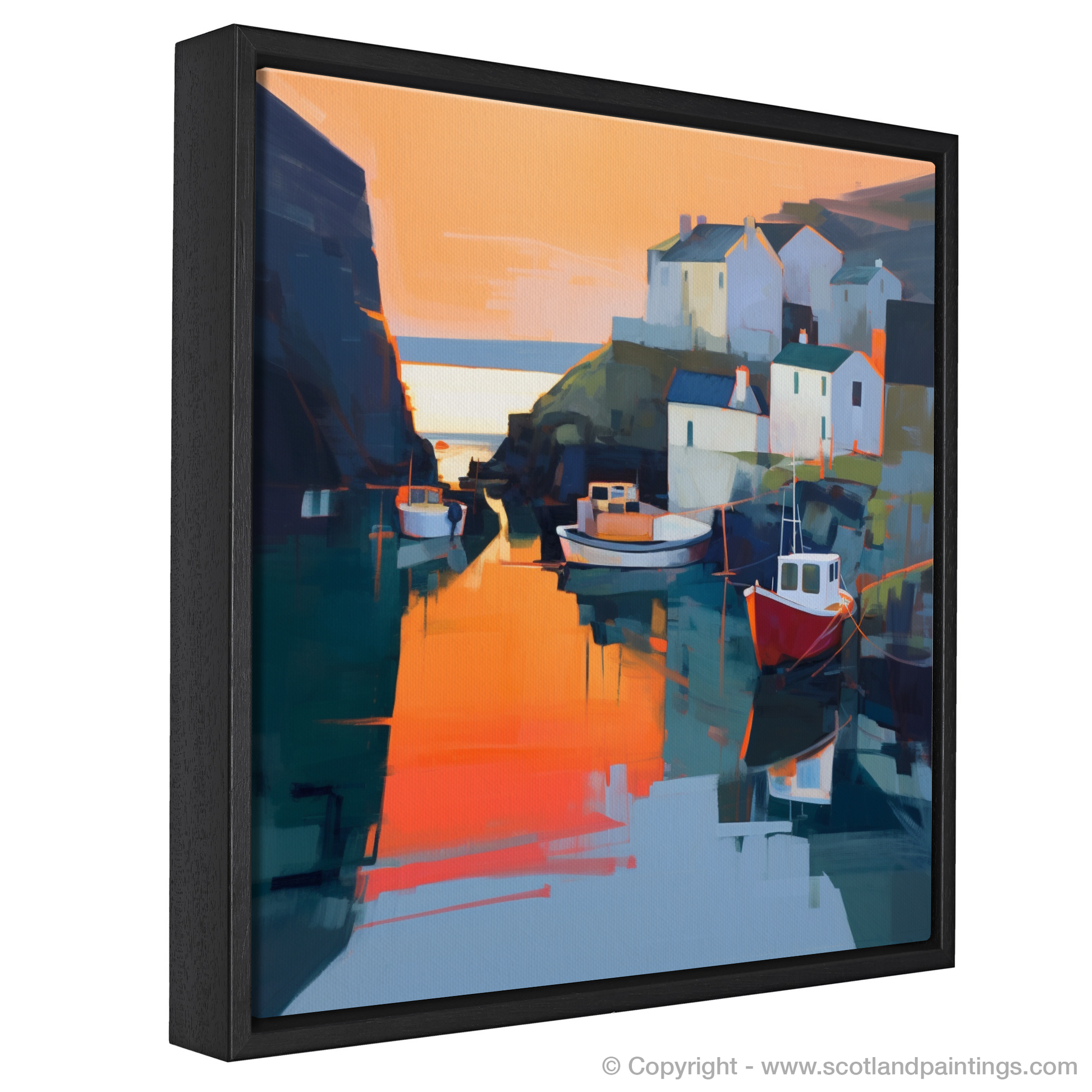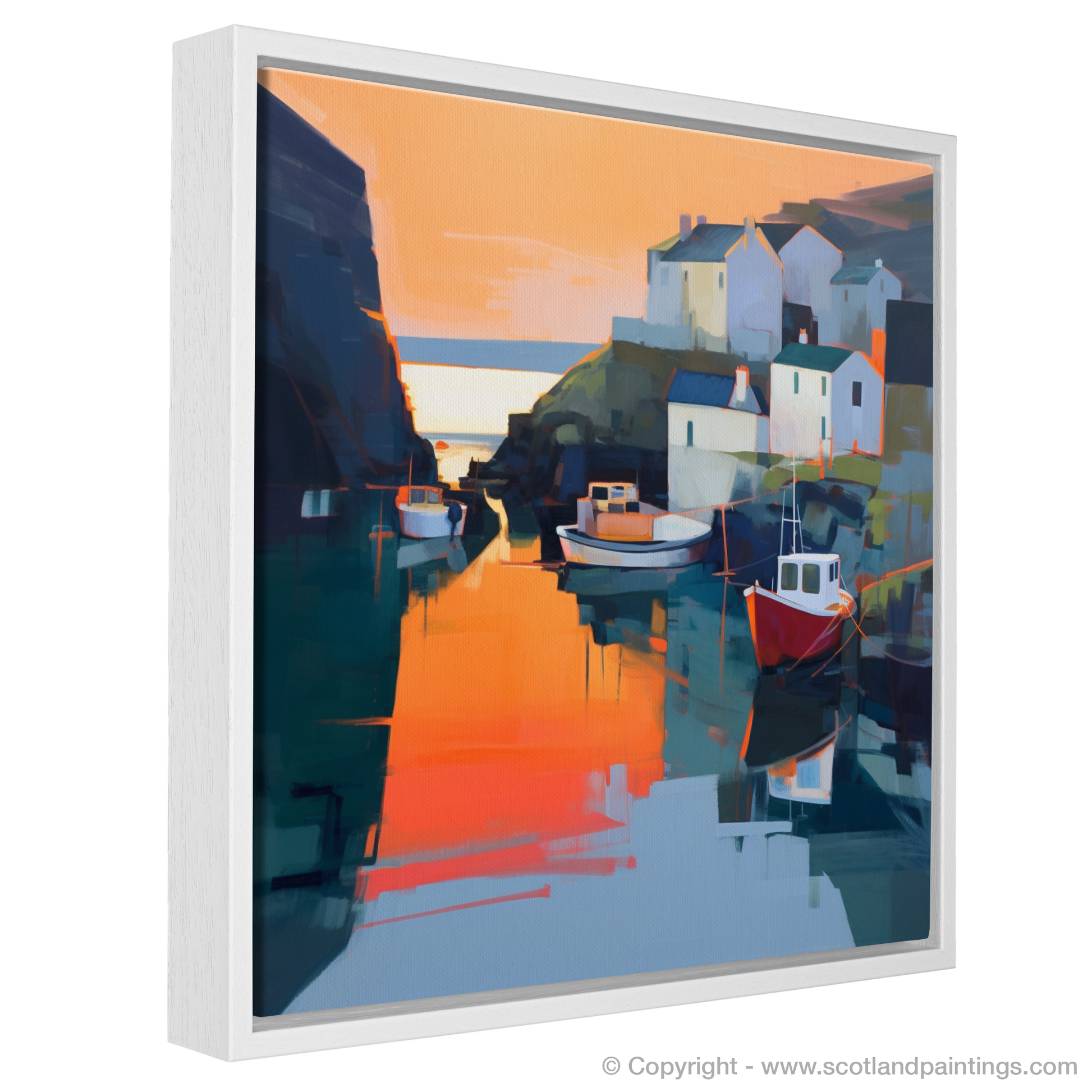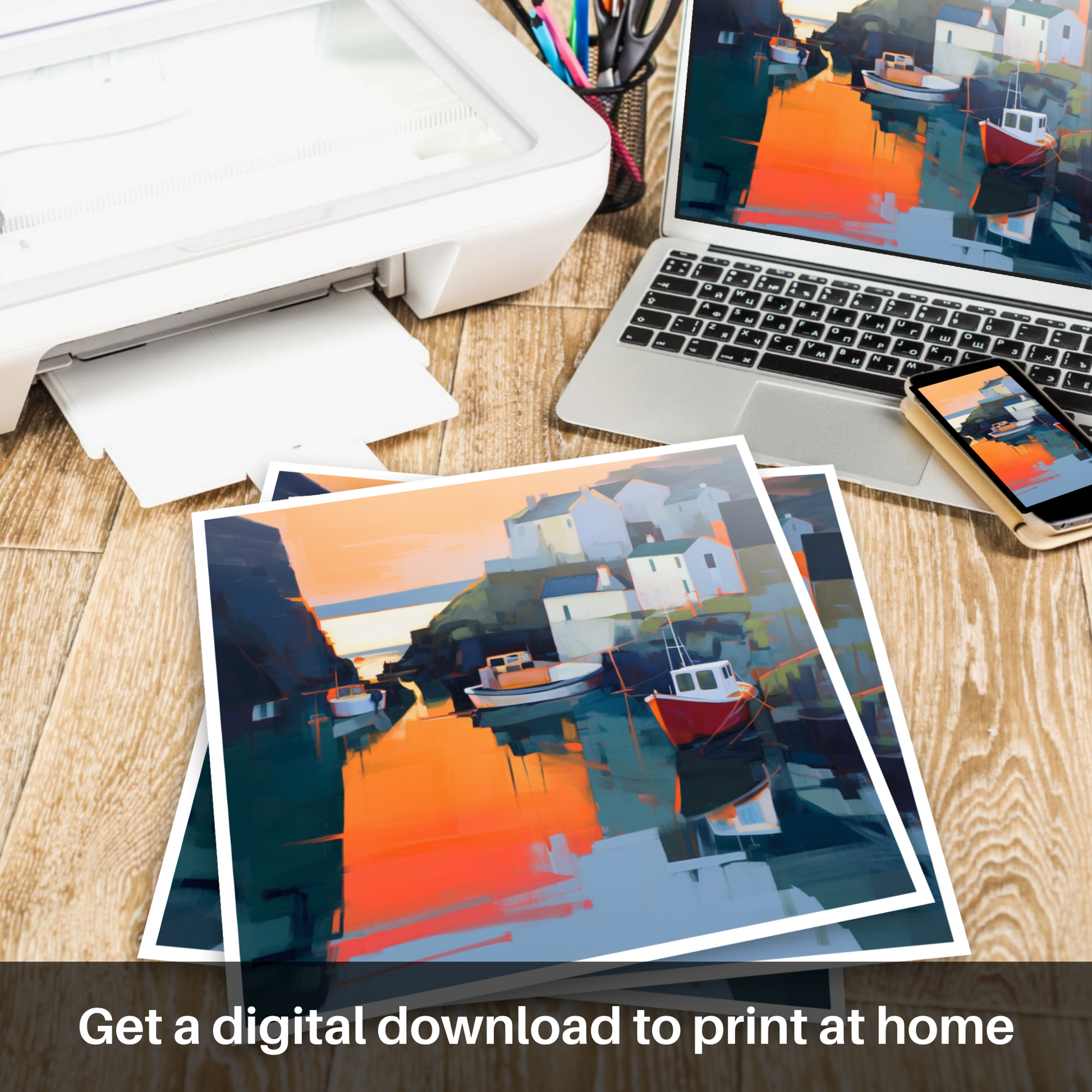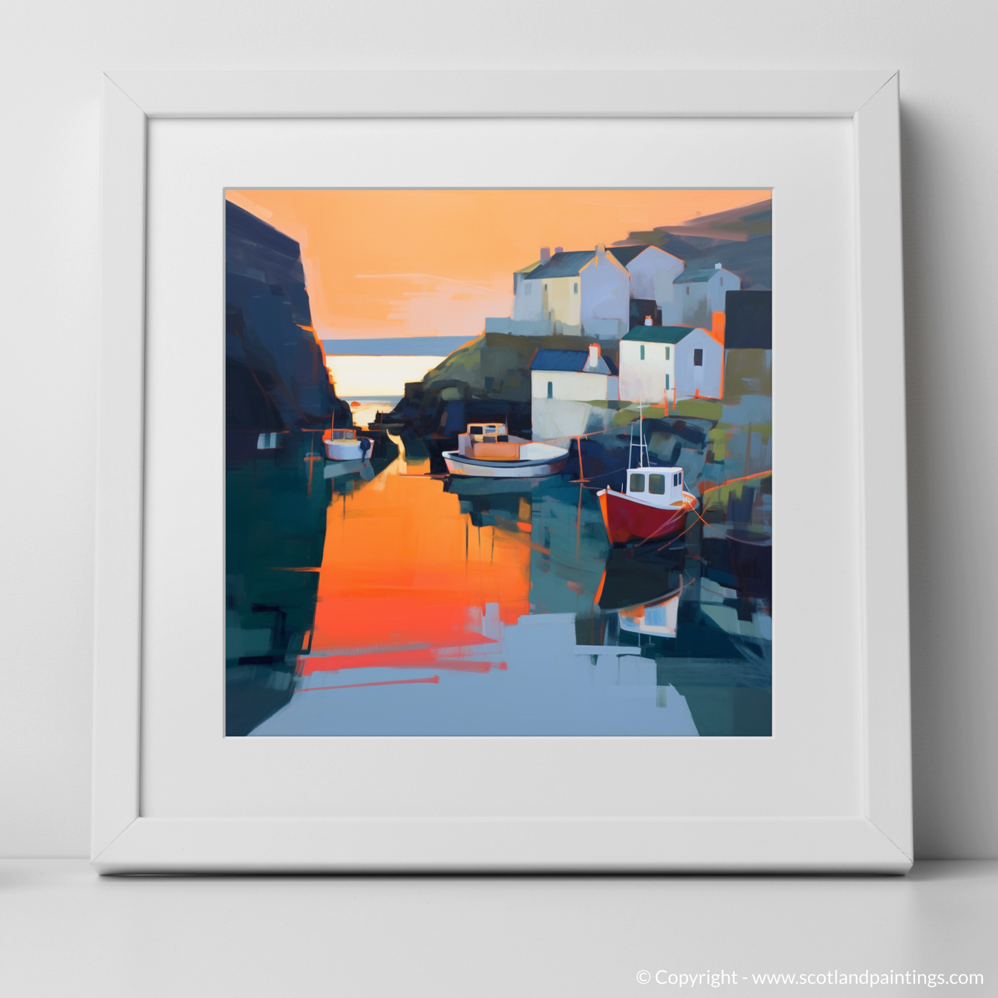 Immerse yourself in the serene beauty of Pennan Harbour at dusk with this enchanting contemporary print, an evocative addition to our 'Scottish Harbours' collection. As the day's final embers fade to twilight, a fiery palette of vivid oranges and deepening blues cast a symphony of reflection across the still waters, offering a moment of tranquillity and a potent sense of place.