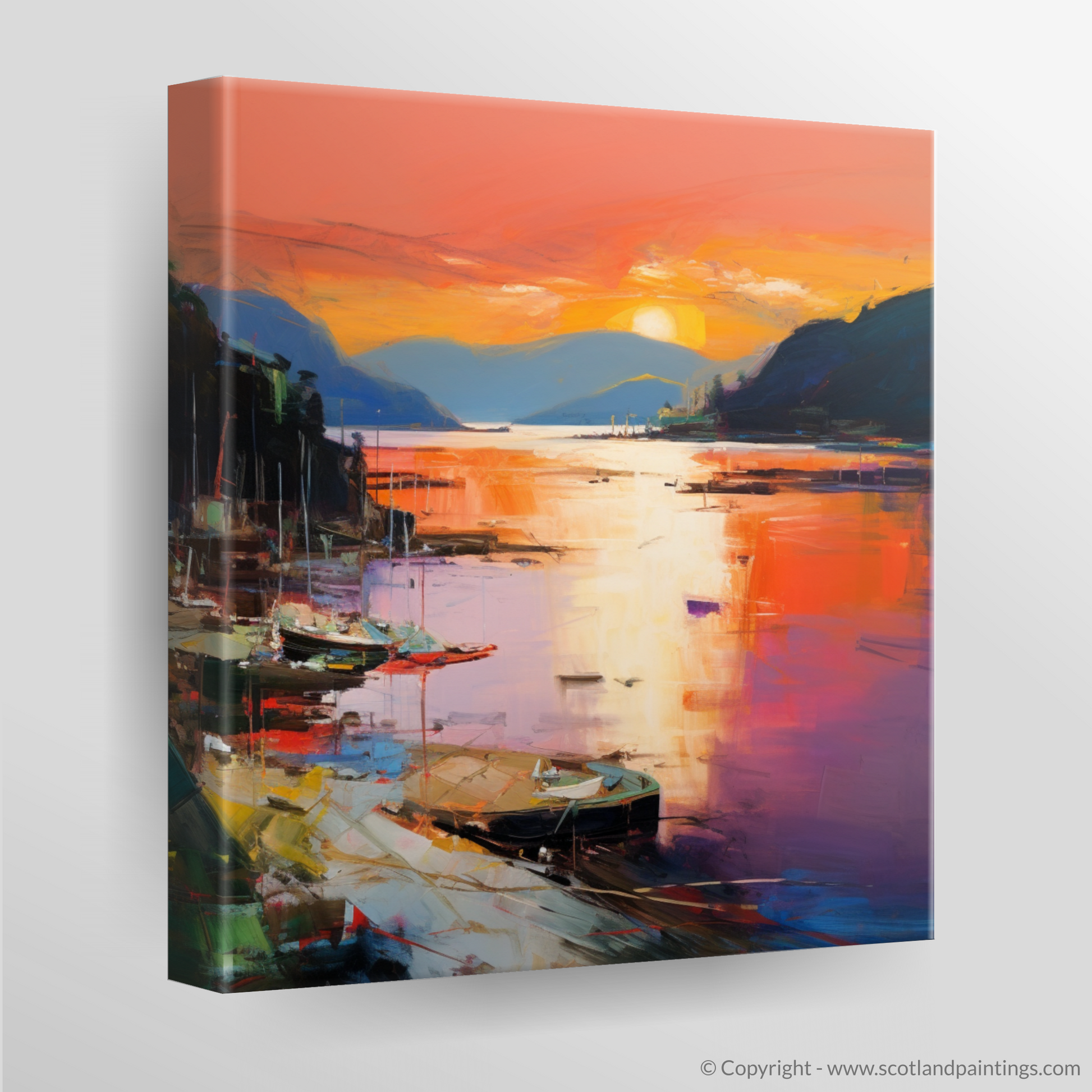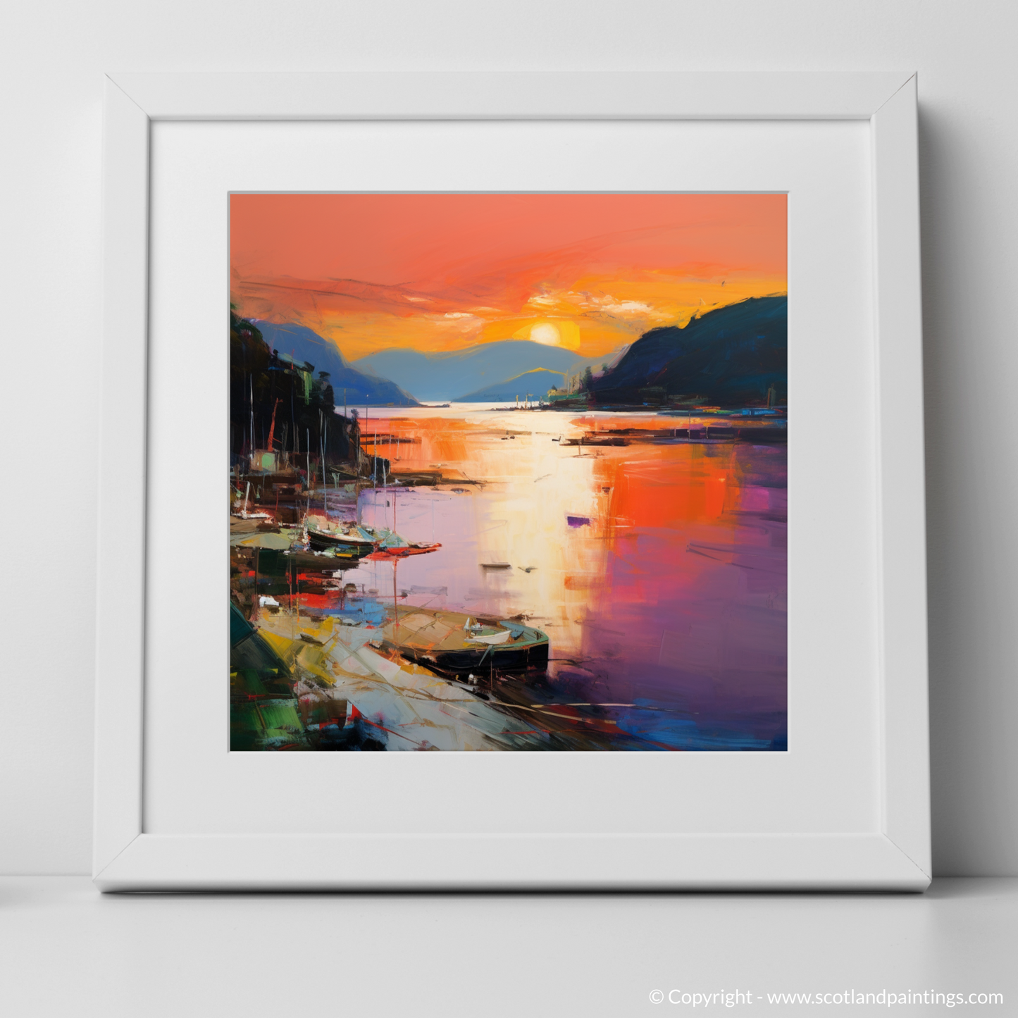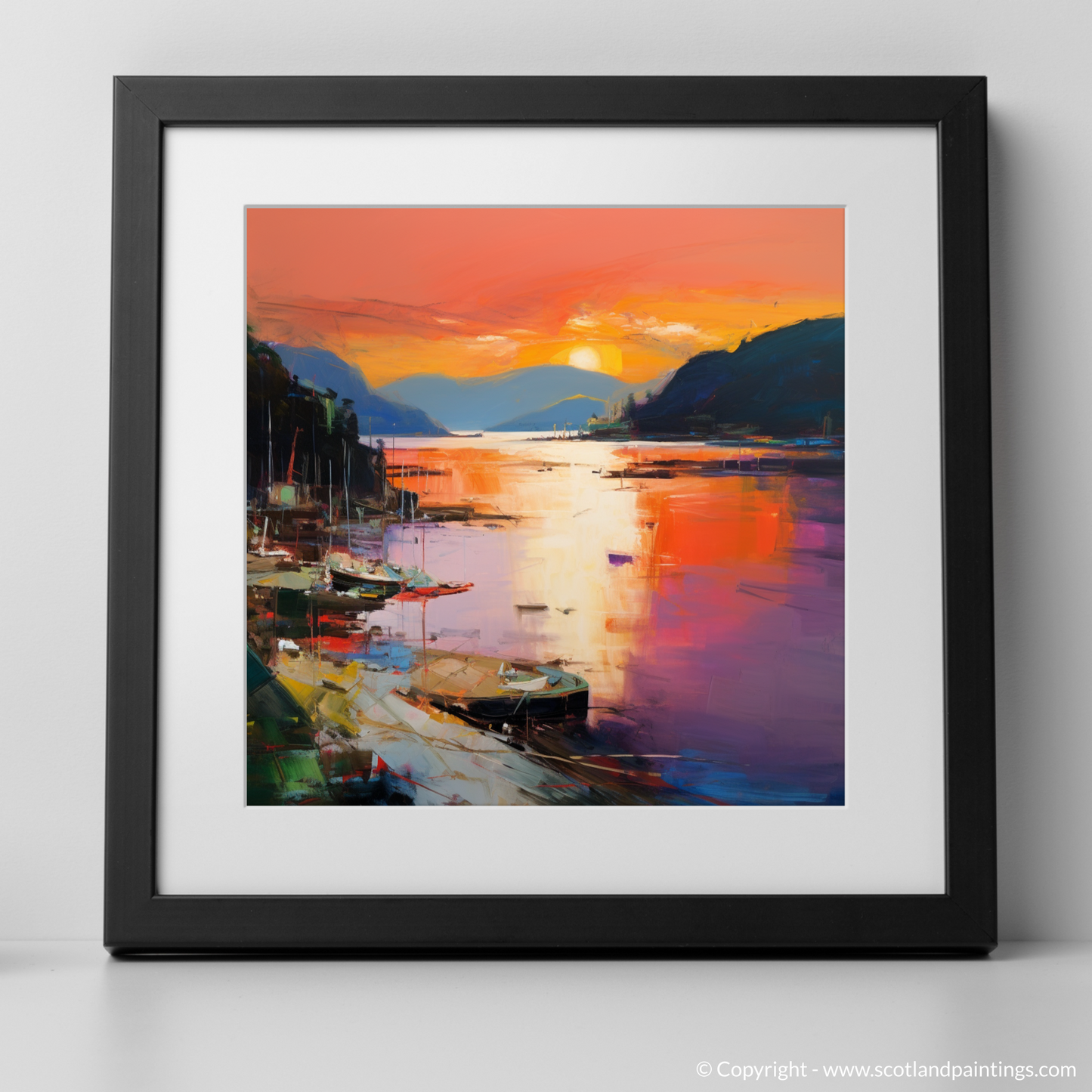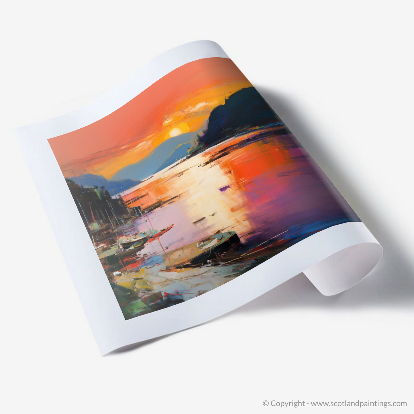 As dusk descends upon Balmaha Harbour, this evocative print captures the essence of the serene Scottish waterside with a riot of colour and emotion. Submerged in the vivid tapestry of Abstract Expressionism, the viewer is invited to lose themselves in the kaleidoscope of reflective splendour.