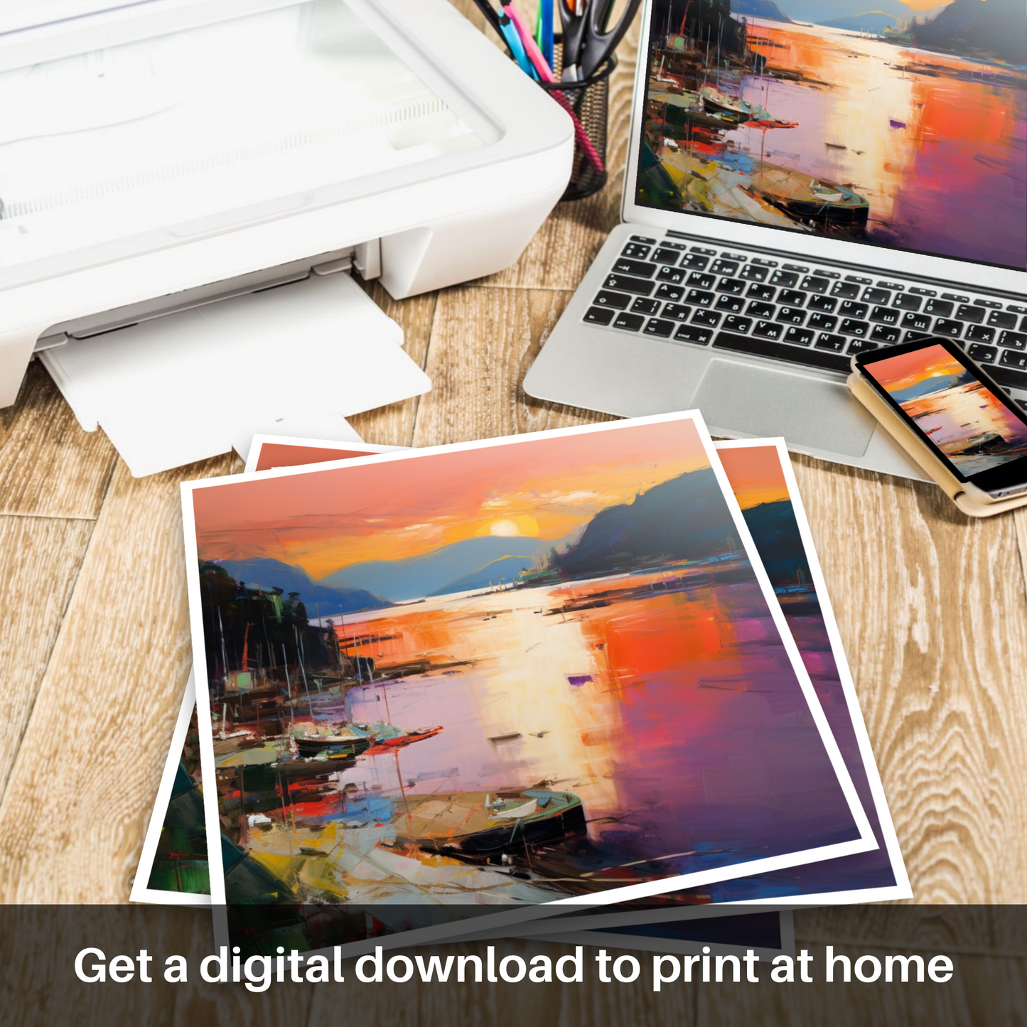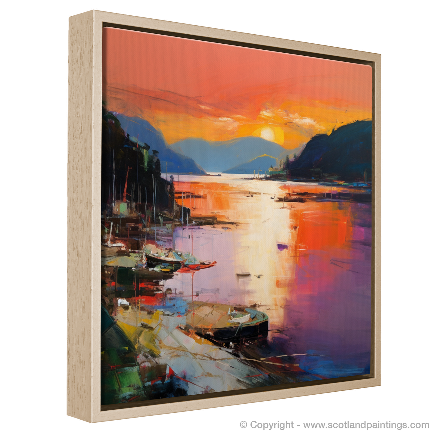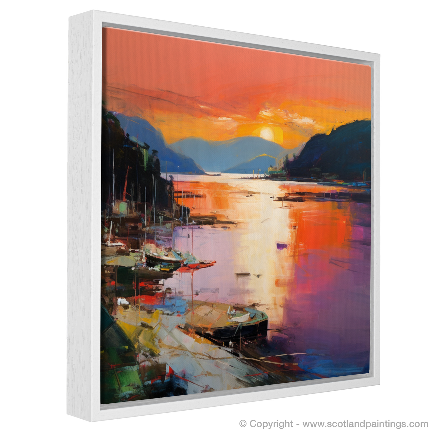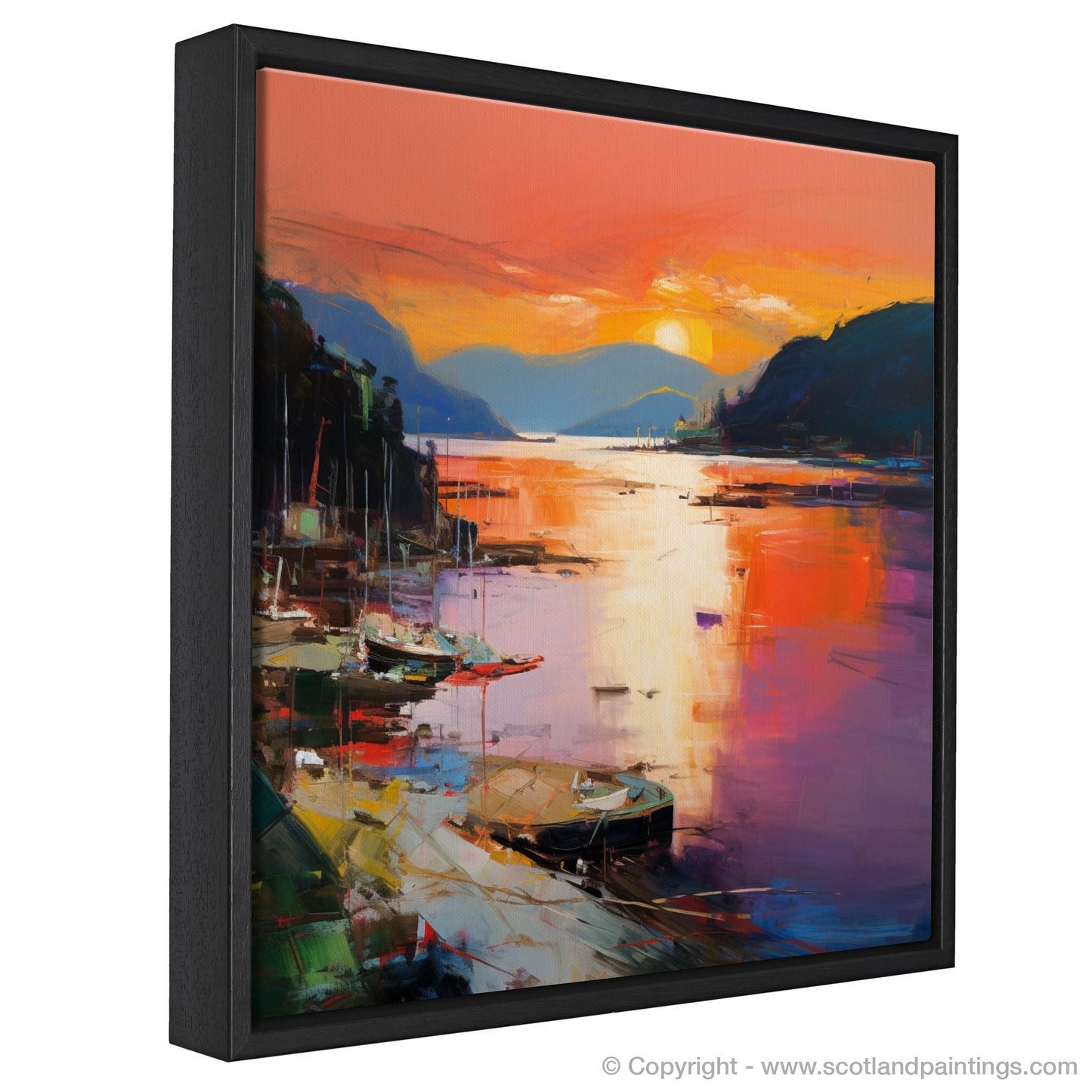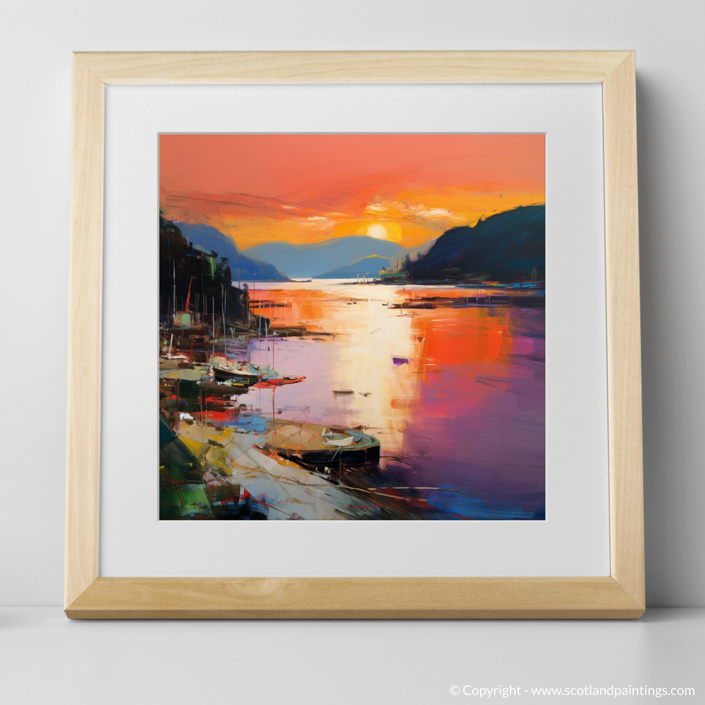 As dusk descends upon Balmaha Harbour, this evocative print captures the essence of the serene Scottish waterside with a riot of colour and emotion. Submerged in the vivid tapestry of Abstract Expressionism, the viewer is invited to lose themselves in the kaleidoscope of reflective splendour.