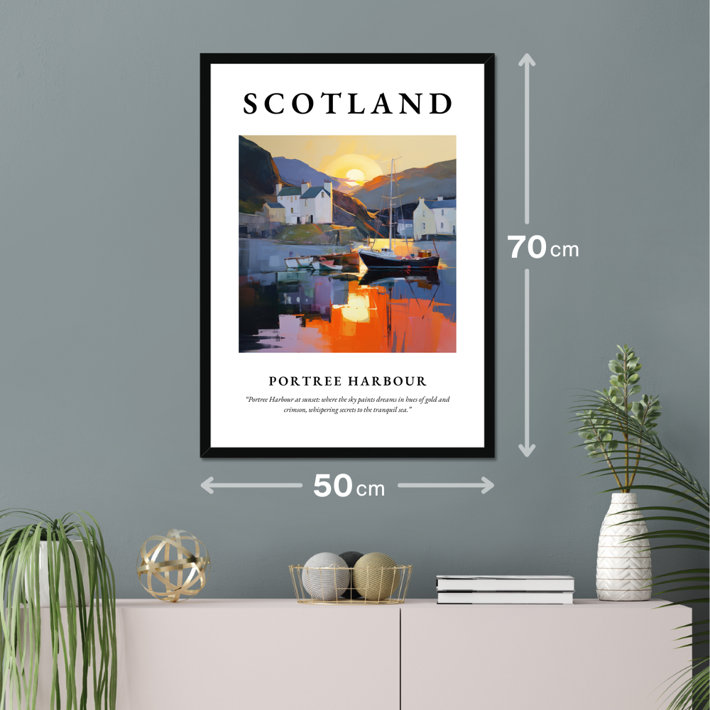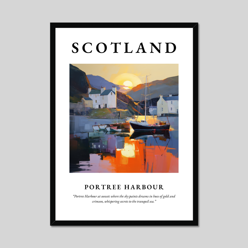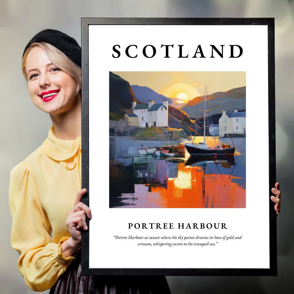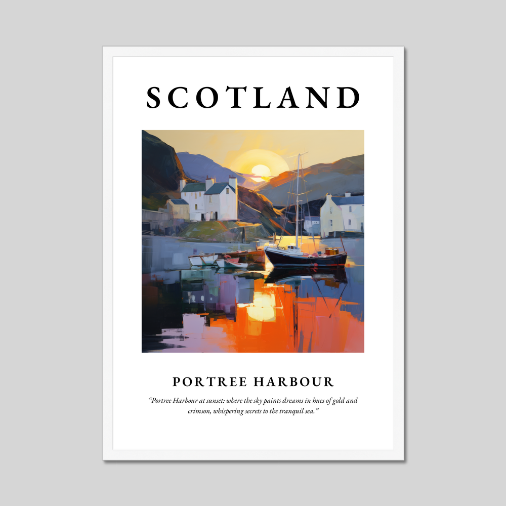 The poster features “SCOTLAND” emblazoned boldly across the top, leading your gaze towards a captivating painting of Portree Harbour. Below the artwork, the poetic words “Portree Harbour at sunset: where the sky paints dreams in hues of gold and crimson, whispering secrets to the tranquil sea,” capture the essence of this enchanting scene. This large poster brings an artistic, coastal charm to your walls without a hefty price, making it an exquisite yet affordable addition to any room.