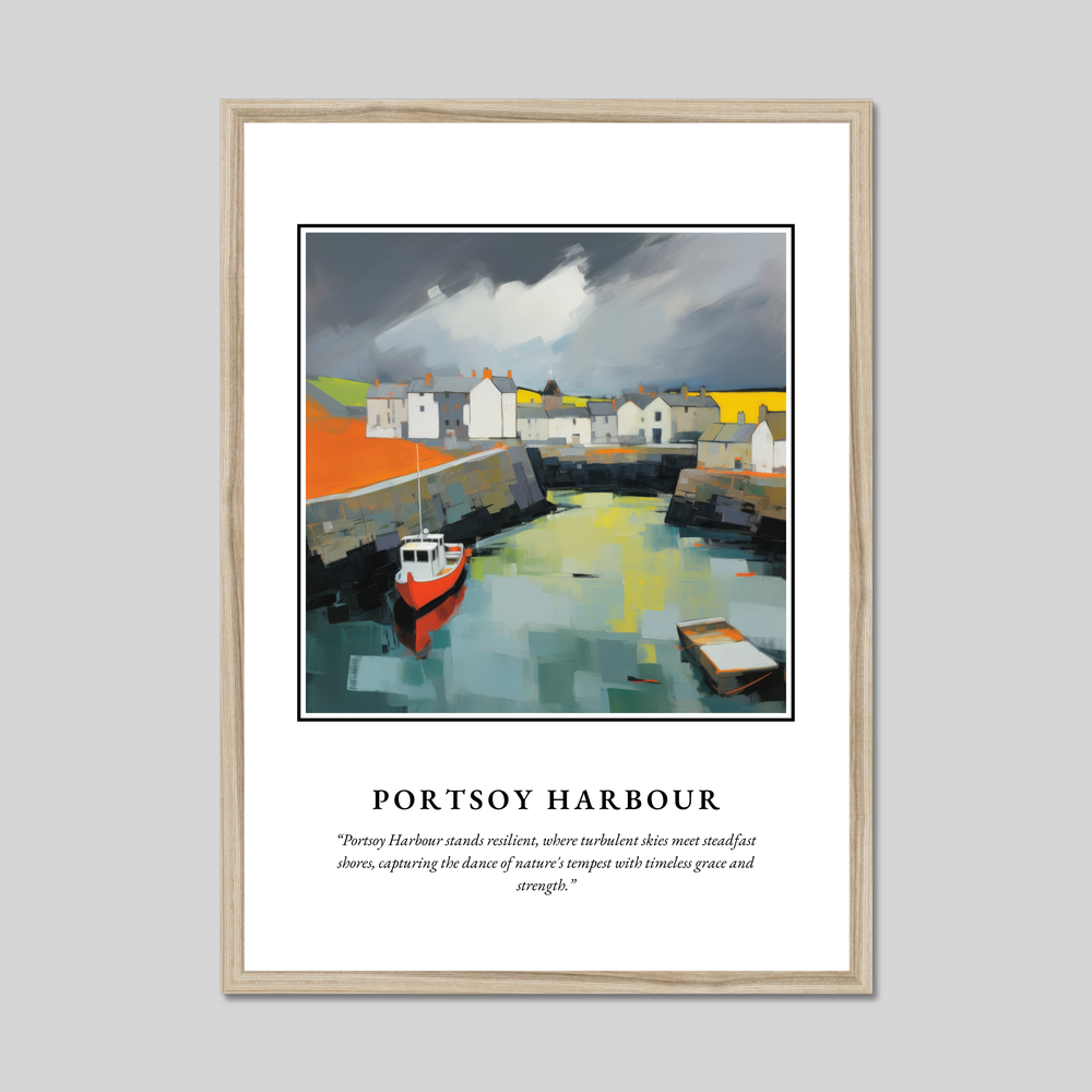 This unique poster is part of our “Scottish Harbours” collection and features a contemporary depiction of Portsoy Harbour. At the top, bold letters spell out “SCOTLAND,” capturing the viewer's attention immediately. Below, you'll find a breathtaking painting that brilliantly combines vivid colours and striking contrasts, illustrating the traditional allure and unyielding spirit of this beloved coastal haven. The scene below the painting reads: “Portsoy Harbour stands resilient, where turbulent skies meet steadfast shores, capturing the dance of nature's tempest with timeless grace and strength.”