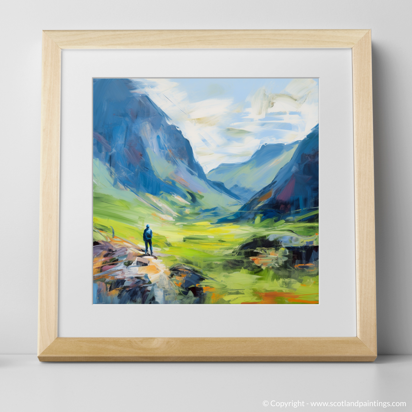 This print, a part of the cherished 'Scotland in Summer' collection, represents not just a place, but a moment in time where the viewer can almost feel the gentle highland breeze and the soft hum of the wild around them. It's a piece that doesn't merely depict a scene; it transports you there, to stand beside the lone hiker and gaze out over the verdant glens and towering peaks, offering a slice of Scottish escapism to grace any space with its abstract allure.
