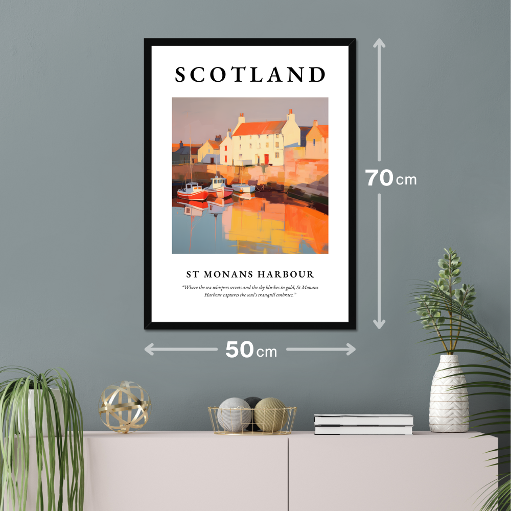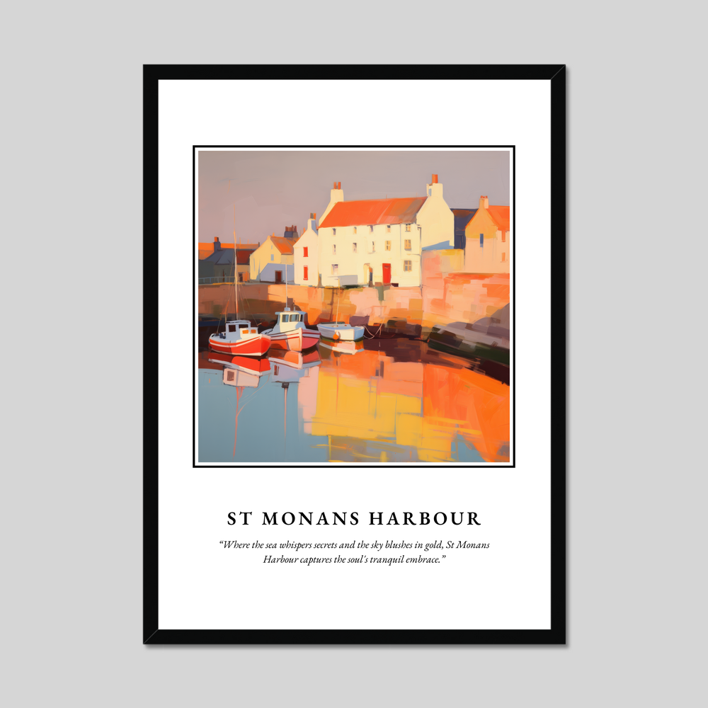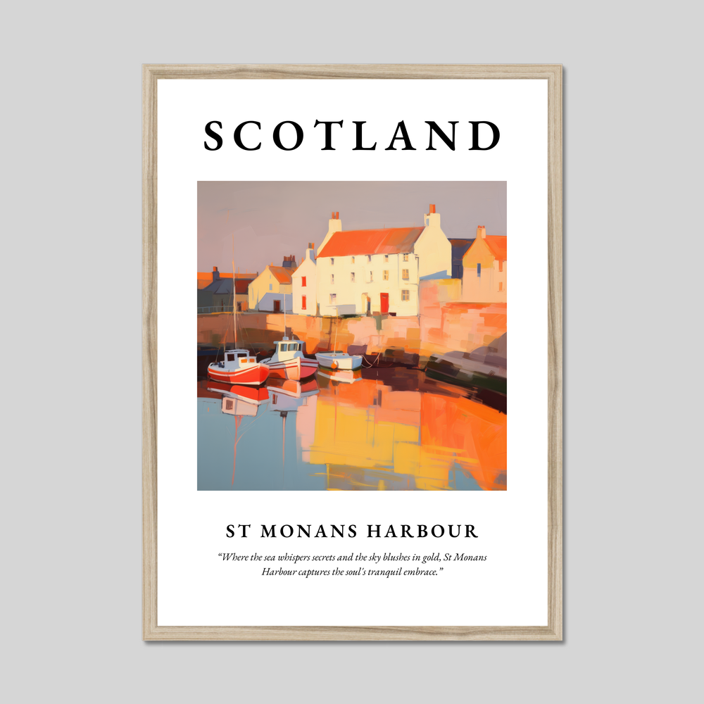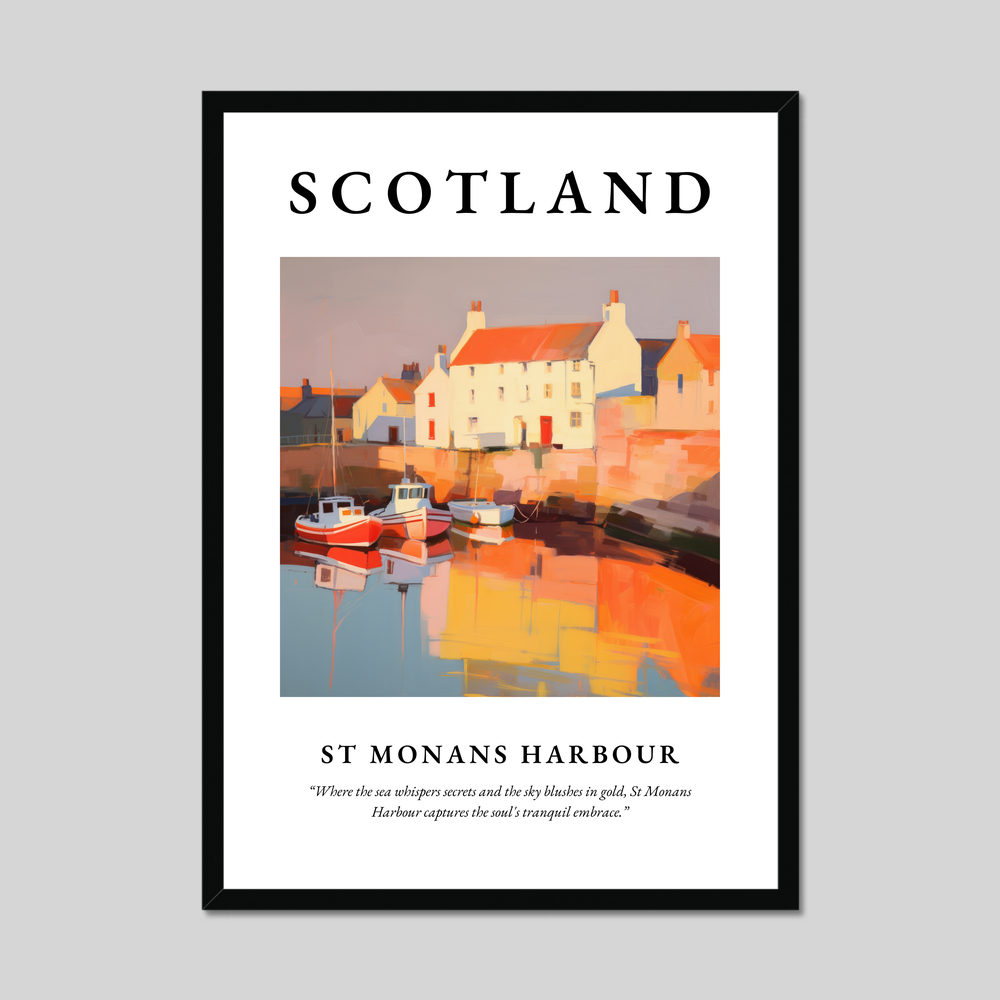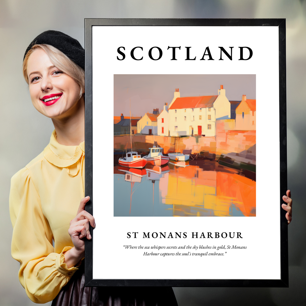 At the top of the poster, "SCOTLAND" is emblazoned in commanding bold letters, heralding the picturesque scene that lies below. The painting of St Monans Harbour evokes the tranquil embrace of this charming coastal village. The boats bob gently on the water, reflecting a warm palette of reds and oranges that infuse the harbour with life and vitality. Below the painting, the quote "Where the sea whispers secrets and the sky blushes in gold, St Monans Harbour captures the soul's tranquil embrace" perfectly encapsulates the serenity and beauty captured in this masterpiece.