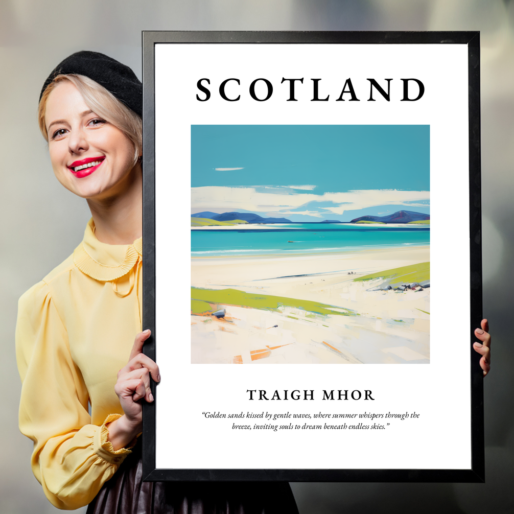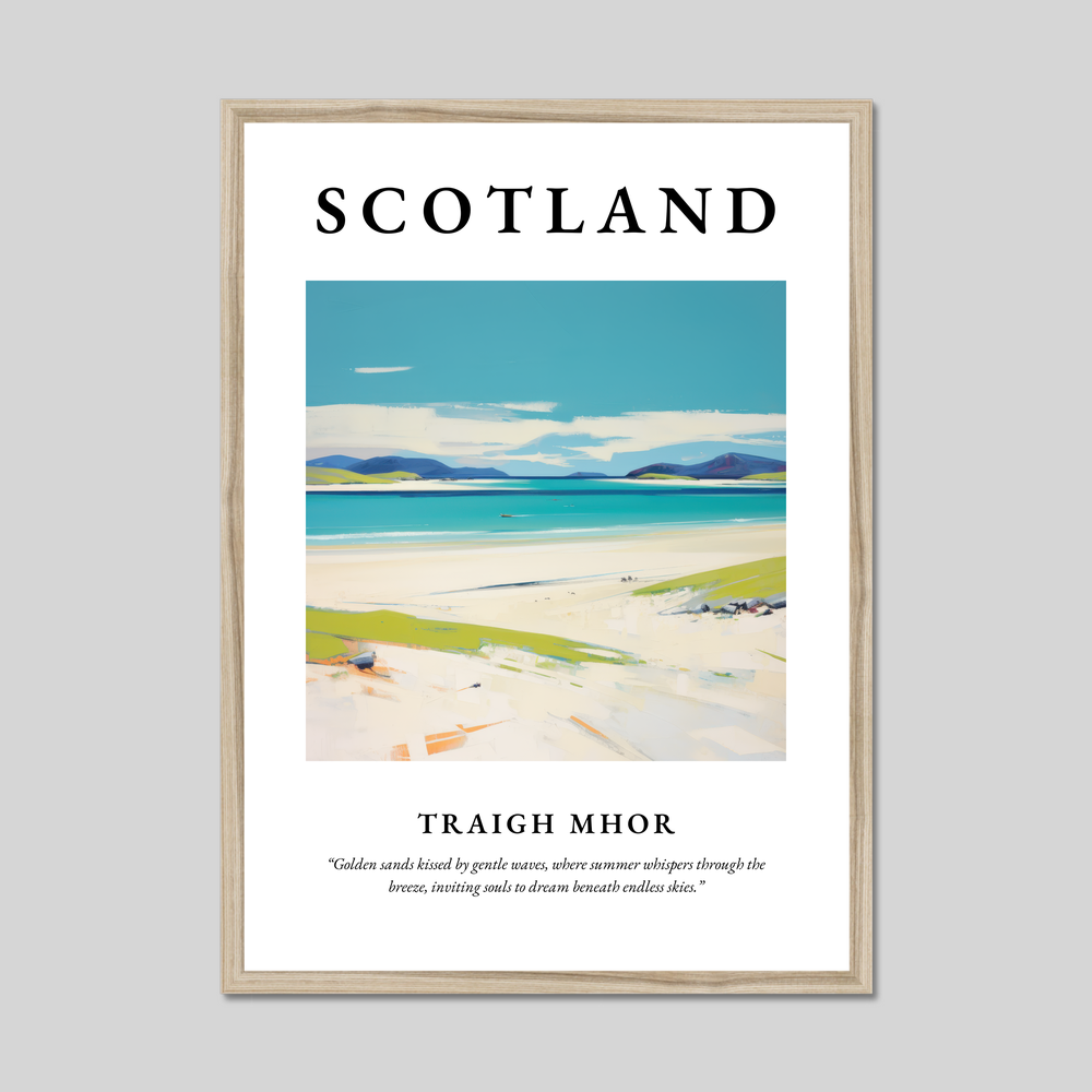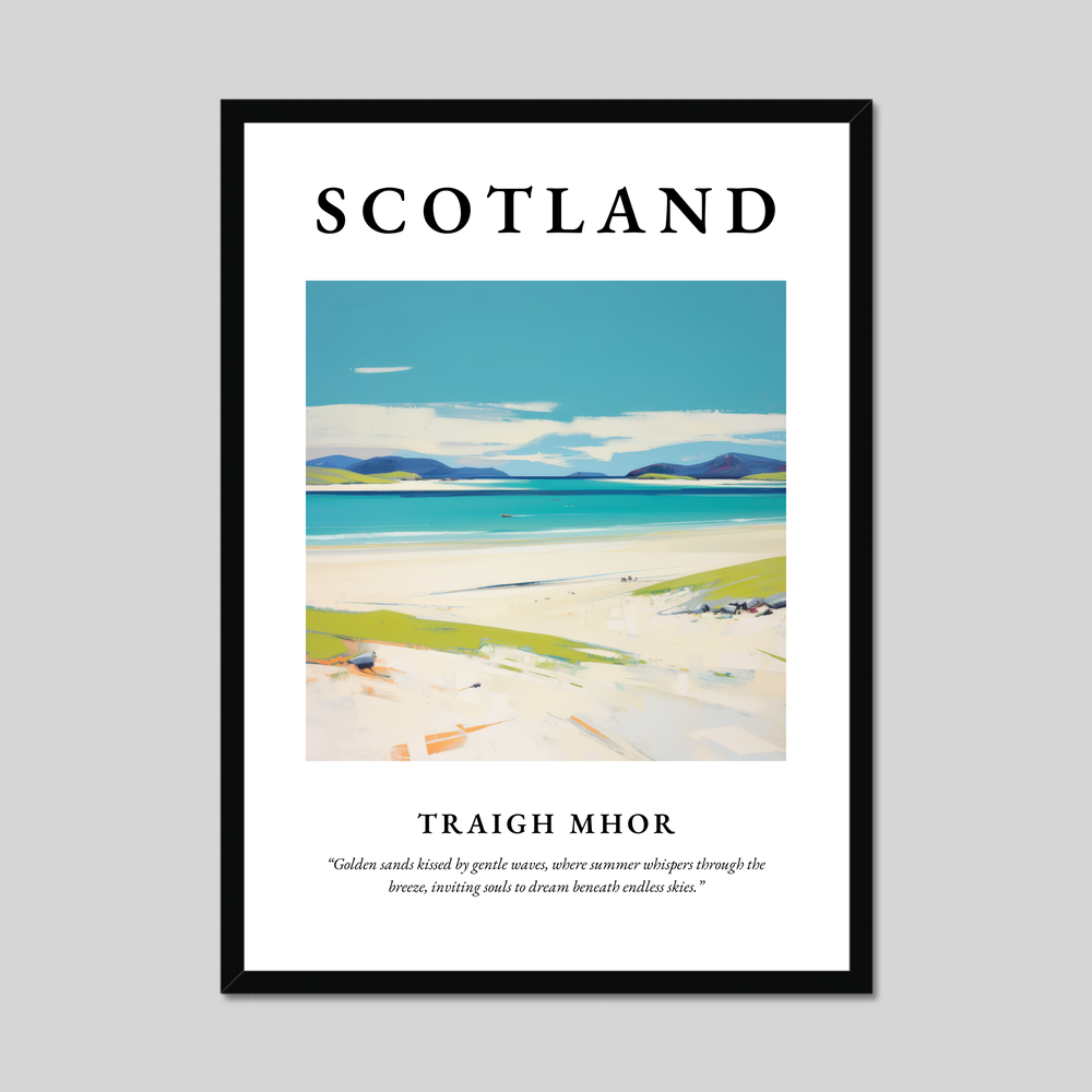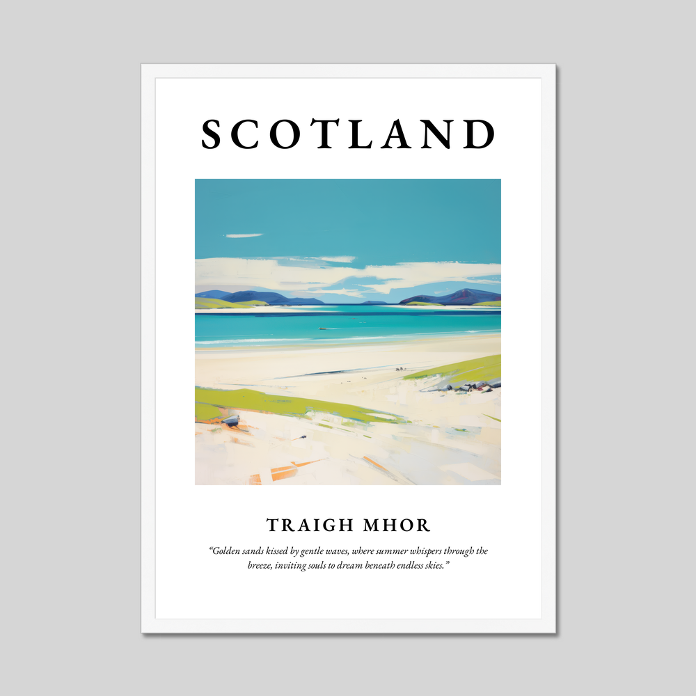 At the top, bold lettering proudly displays "SCOTLAND," immediately drawing your gaze to the contemporary painting below. The artwork encapsulates the tranquil allure of Traigh Mhor, with smooth, sweeping strokes that bring to life the gentle waves caressing golden sands. A soft, turquoise sea stretches out to meet a serene sky, inviting the viewer to lose themselves in a landscape where summer whispers through the breeze. Underneath the painting, a poignant quote adds a touch of poetic charm: “Golden sands kissed by gentle waves, where summer whispers through the breeze, inviting souls to dream beneath endless skies.”