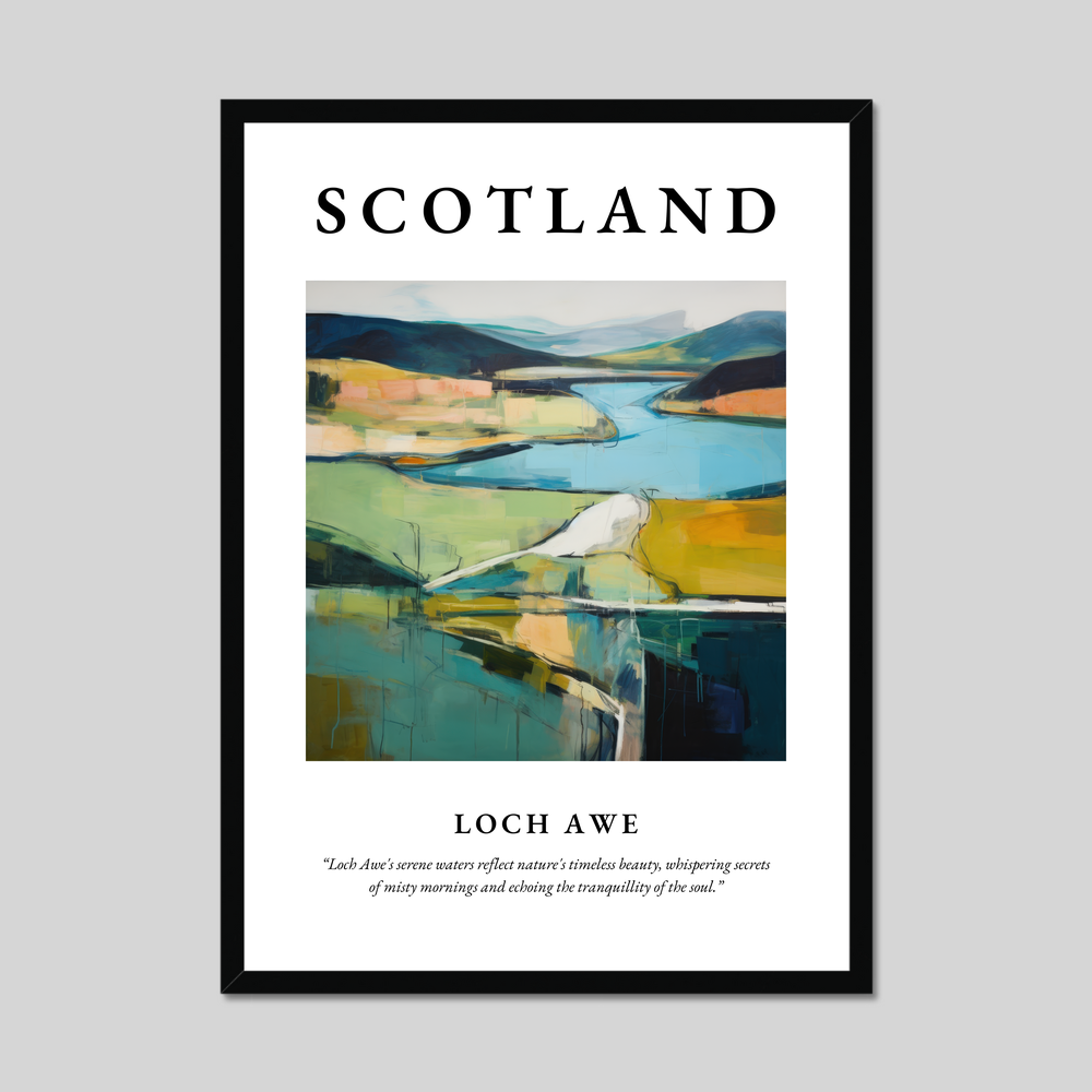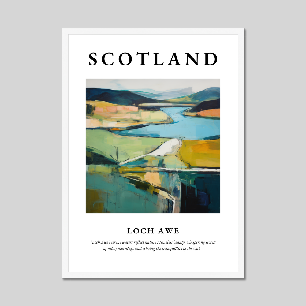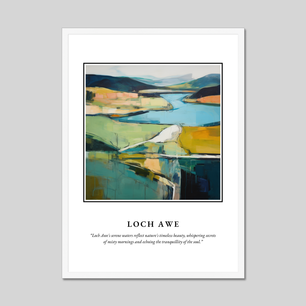 The centrepiece of this poster is a captivating painting of Loch Awe, rendered in the evocative style of Abstract Impressionism. This genre is known for its ability to capture the emotional essence of a landscape through vibrant colours and bold brushstrokes. Here, the painting teases the imagination with its sweeping lines and dynamic interplay of light and shadow. The enchanting hues and fluid forms mirror the tranquil waters and rolling hills of Loch Awe, inviting viewers to step into a dreamlike interpretation of a much-loved landscape. Beneath this artistic wonder, a poetic quote whispers, “Loch Awe's serene waters reflect nature's timeless beauty, whispering secrets of misty mornings and echoing the tranquillity of the soul.”
