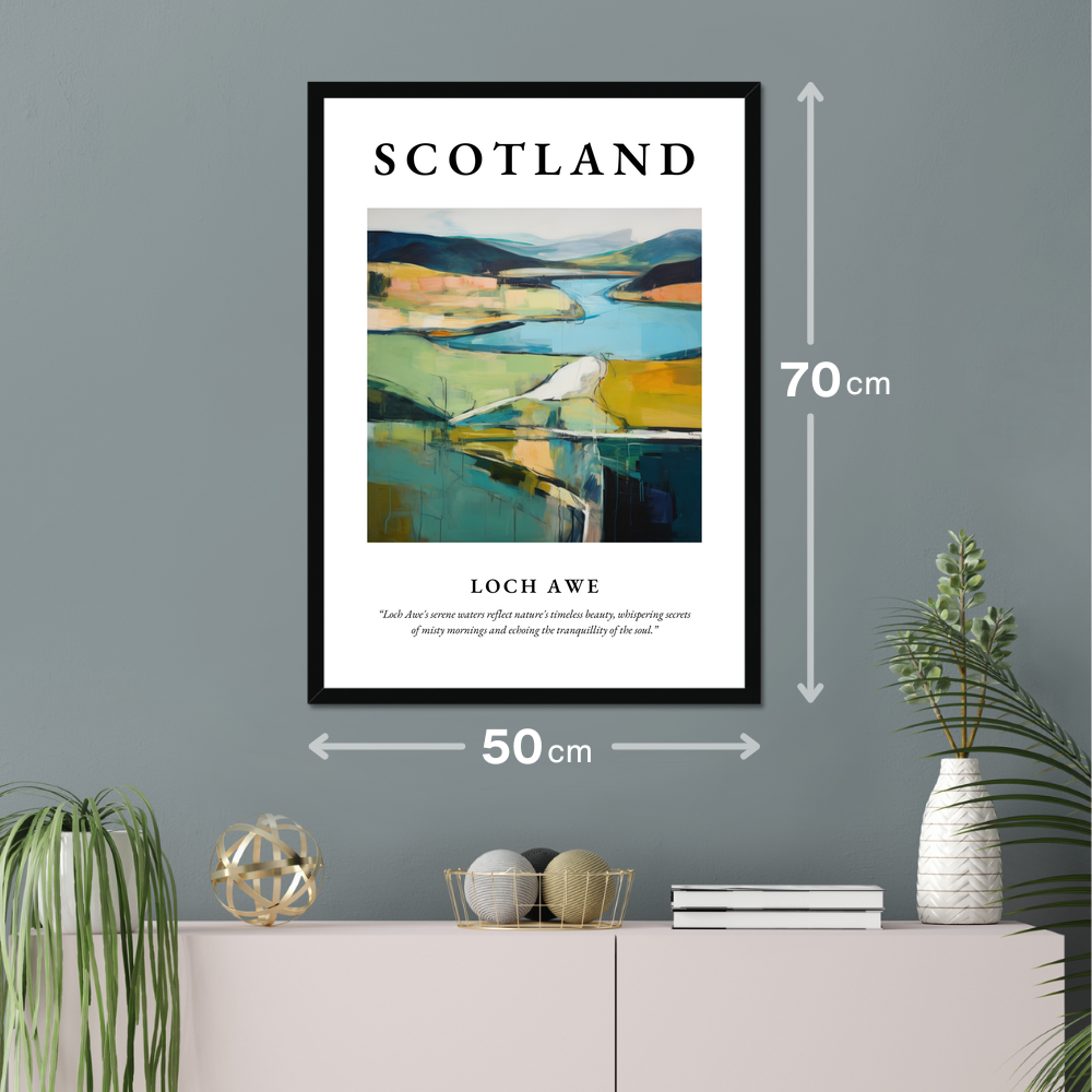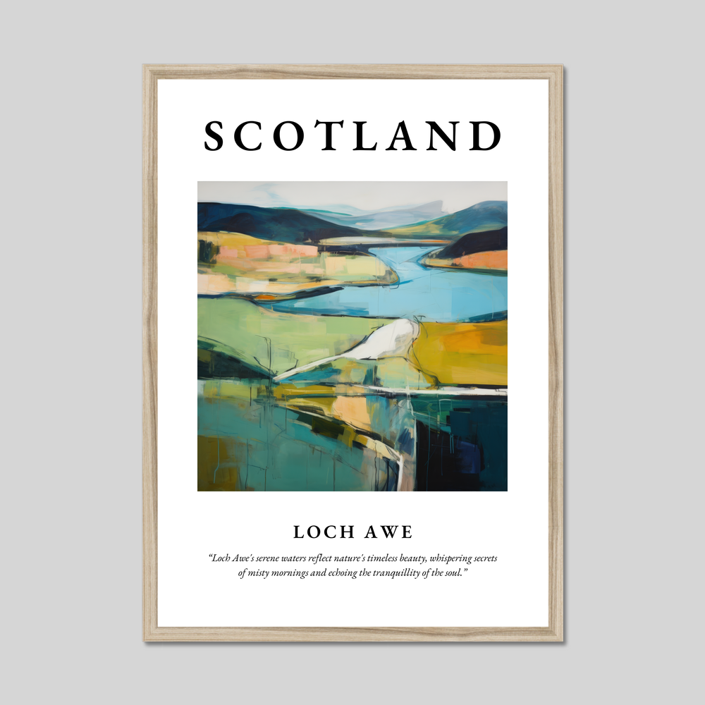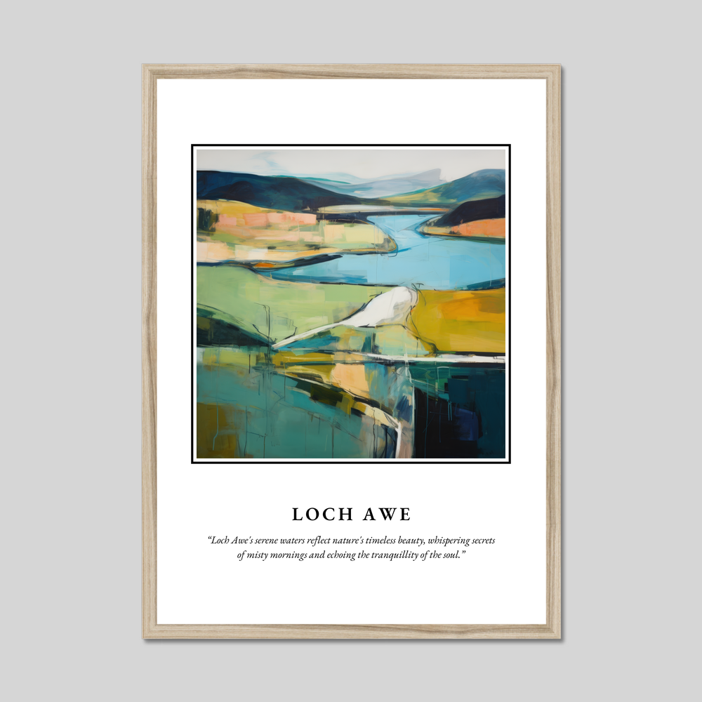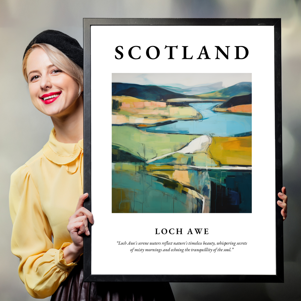 The centrepiece of this poster is a captivating painting of Loch Awe, rendered in the evocative style of Abstract Impressionism. This genre is known for its ability to capture the emotional essence of a landscape through vibrant colours and bold brushstrokes. Here, the painting teases the imagination with its sweeping lines and dynamic interplay of light and shadow. The enchanting hues and fluid forms mirror the tranquil waters and rolling hills of Loch Awe, inviting viewers to step into a dreamlike interpretation of a much-loved landscape. Beneath this artistic wonder, a poetic quote whispers, “Loch Awe's serene waters reflect nature's timeless beauty, whispering secrets of misty mornings and echoing the tranquillity of the soul.”
