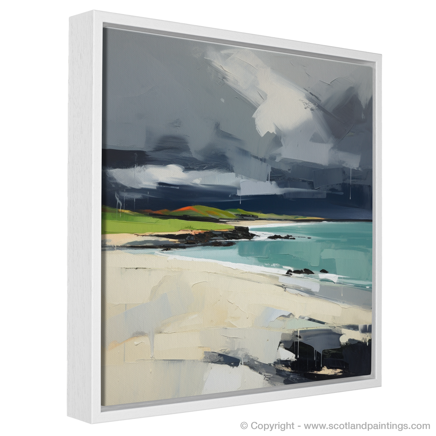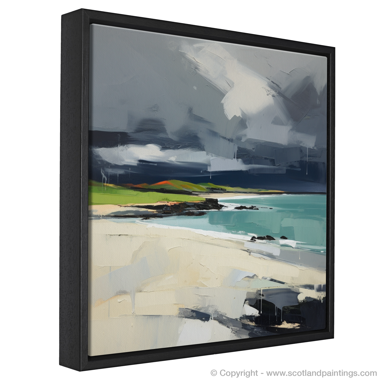 Embrace the dramatic allure of Scotland's coastal landscapes with this captivating print, a homage to the rugged natural beauty of Kiloran Bay. A magnificent stormy sky looms above, masterfully rendered in a palette of dynamic greys and whites, with energised brushstrokes that convey the brooding power of an imminent squall. Fierce yet fragile white highlights mimic shards of lightning, or perhaps the gleaming crests of waves, preluding the tempest's force.
