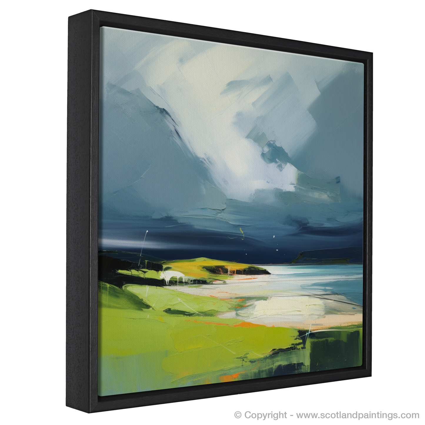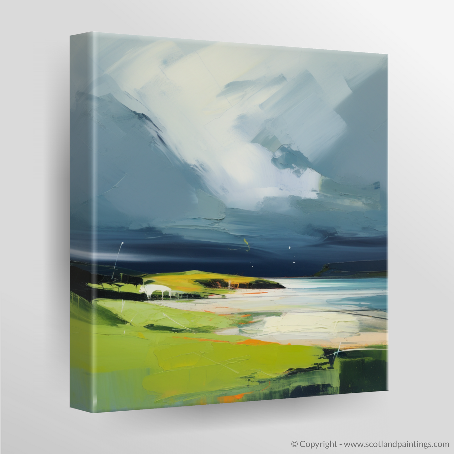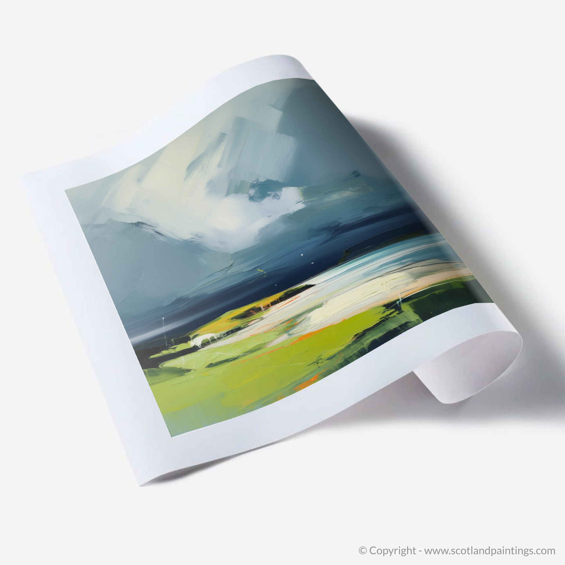 Below the brooding skies, the landscape unfolds in vibrant splendour, where verdant greens and sun-kissed earth tones attest to the raw beauty of Scottish coves. The artist's masterful use of colour illuminates the grassy knolls and rocky outcrops that are a hallmark of Kiloran Bay's rugged coastline. Flecks of orange and white interrupt the green, suggesting wildflowers or the last rays of a setting sun caught in the storm's brief reprieve.