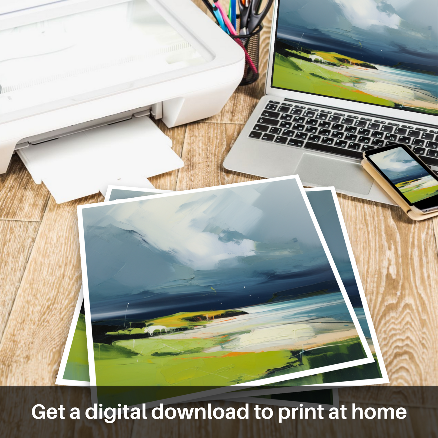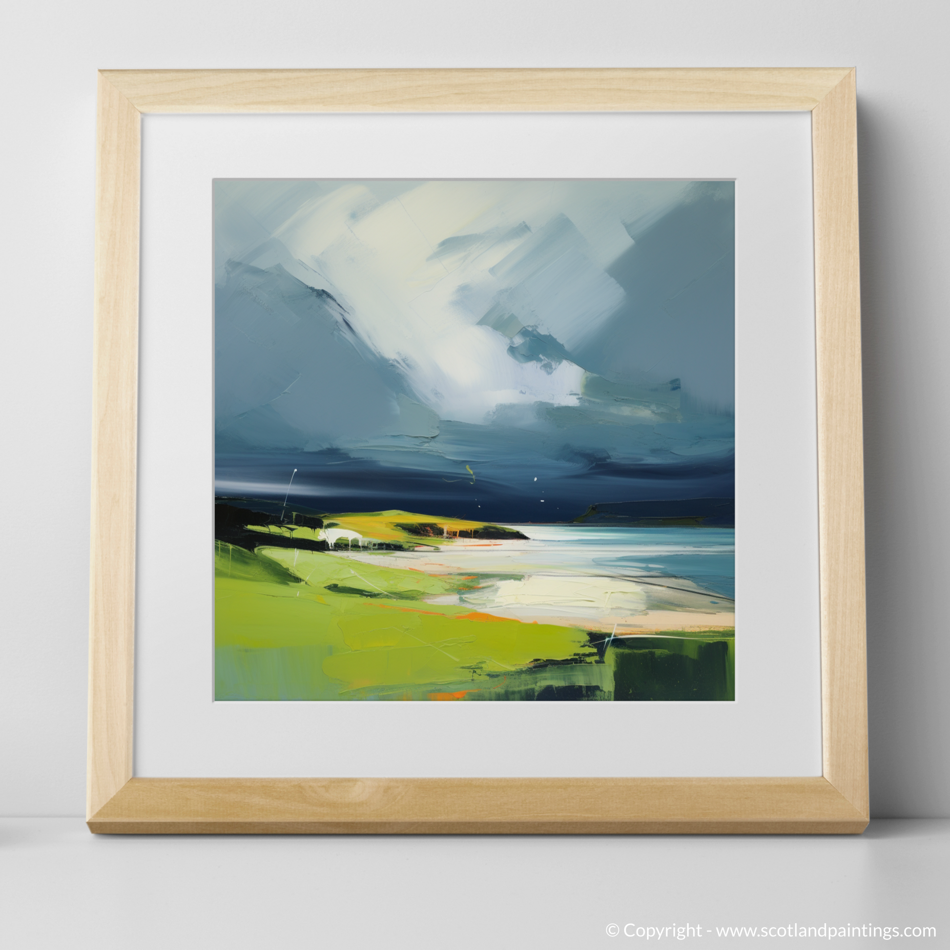 Capturing the untamed beauty of Scotland's natural shorelines, this captivating piece brings Kiloran Bay to life with a palette of dramatic contrasts and daring brushwork characteristic of contemporary style. Enveloping the senses, a tempestuous sky looms above the serene cove, a symphony of thunderous greys and fleeting whites, evoking the wild heart of the storm.