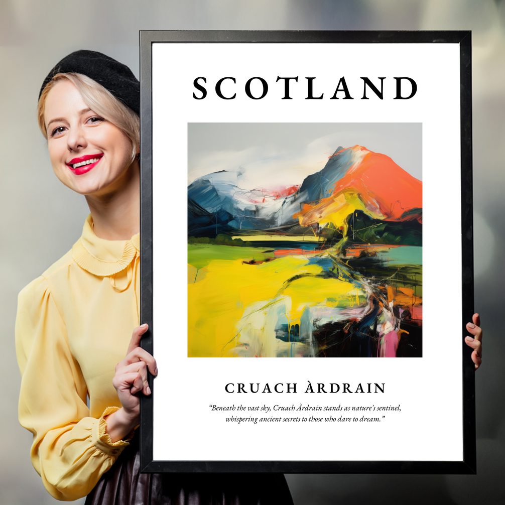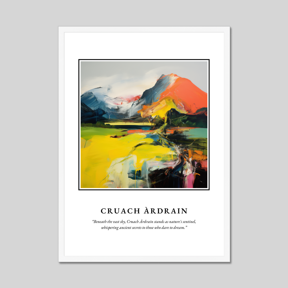 Beneath the soulful painting, the evocative quote, “Beneath the vast sky, Cruach Àrdrain stands as nature's sentinel, whispering ancient secrets to those who dare to dream,” draws the imagination further into the mysterious heart of Scotland.