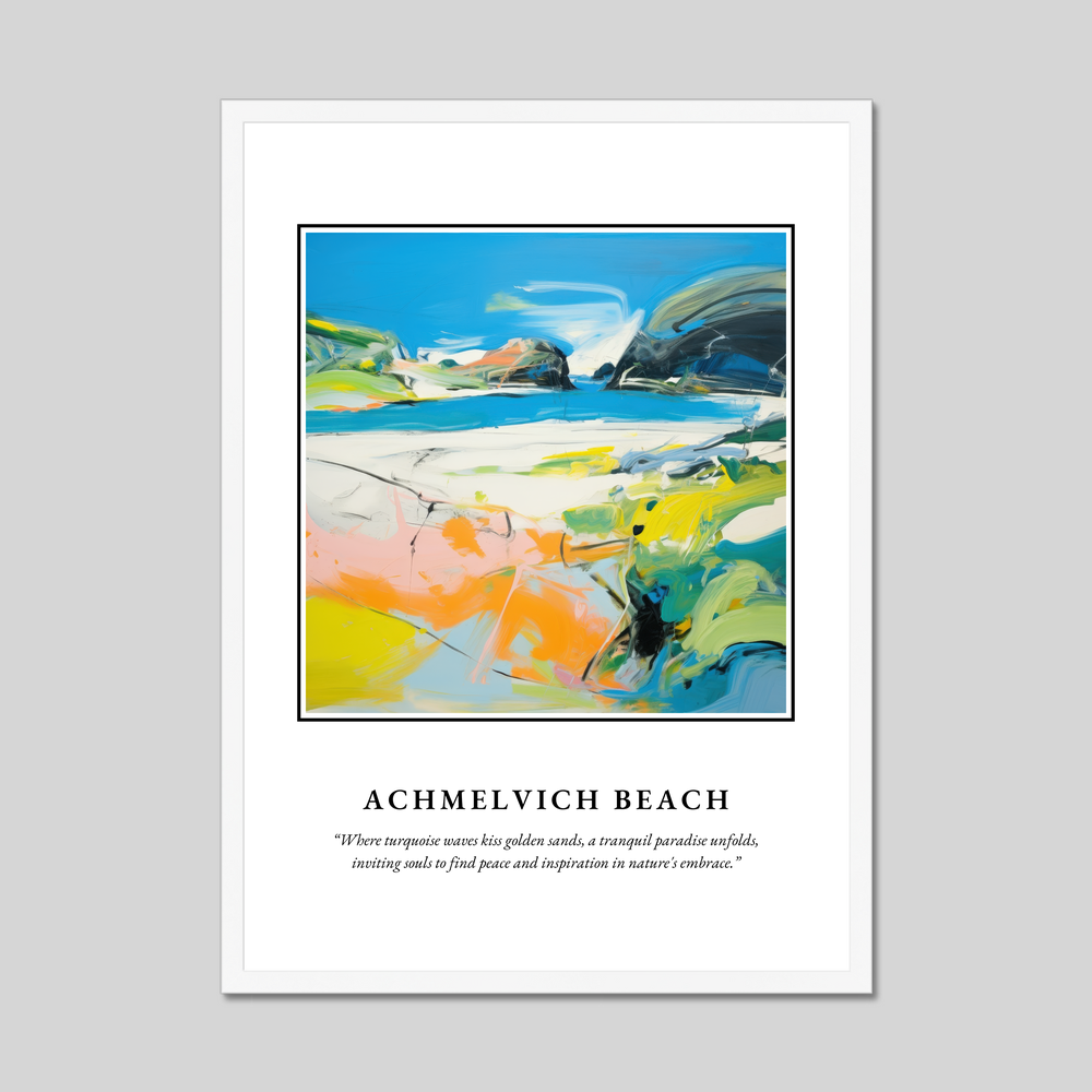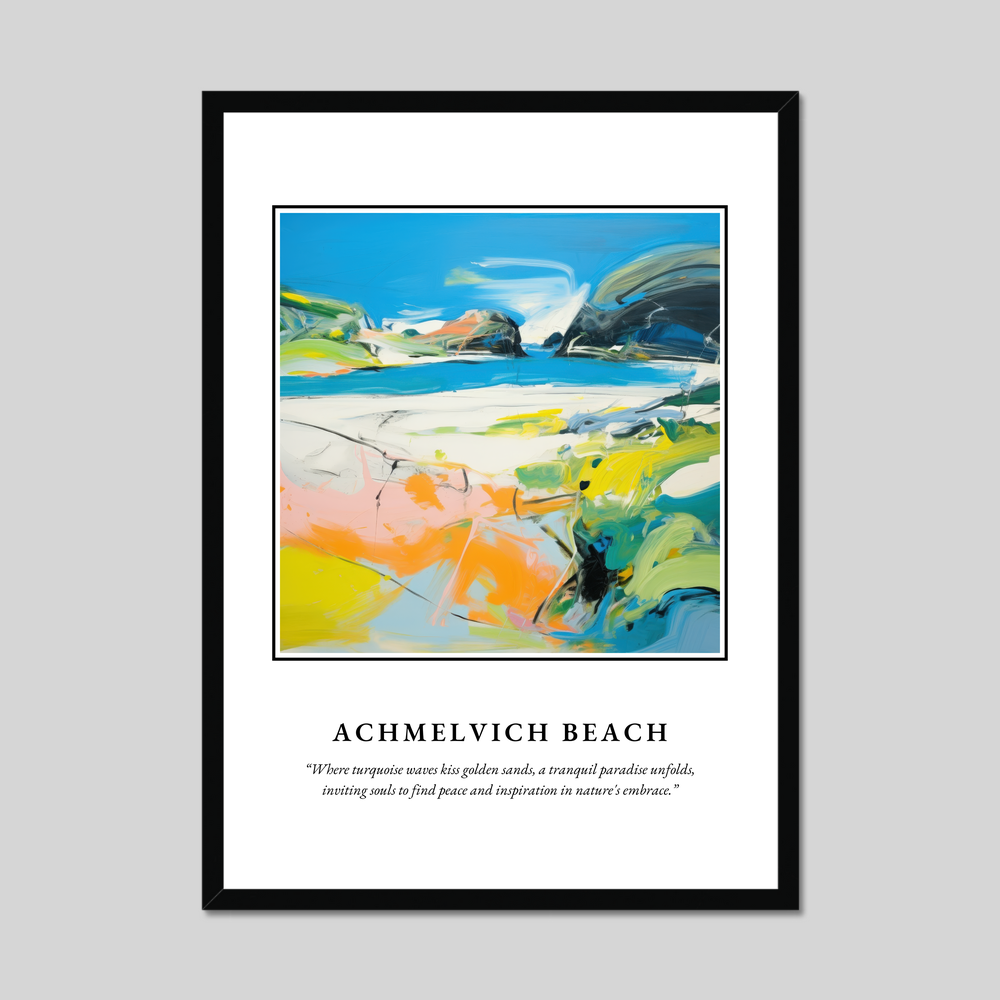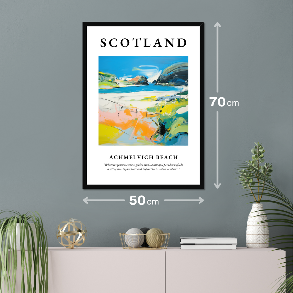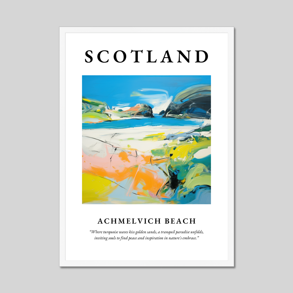 This art piece is ideal for anyone with a love of Scotland, a connection to the place, or an appreciation for the artistic flair of Abstract Expressionism. Whether you're reminiscing about a visit, dreaming of future travels, or simply wishing to bring a piece of Scottish charm into your life, this poster offers a way to celebrate the unique beauty of Achmelvich Beach.