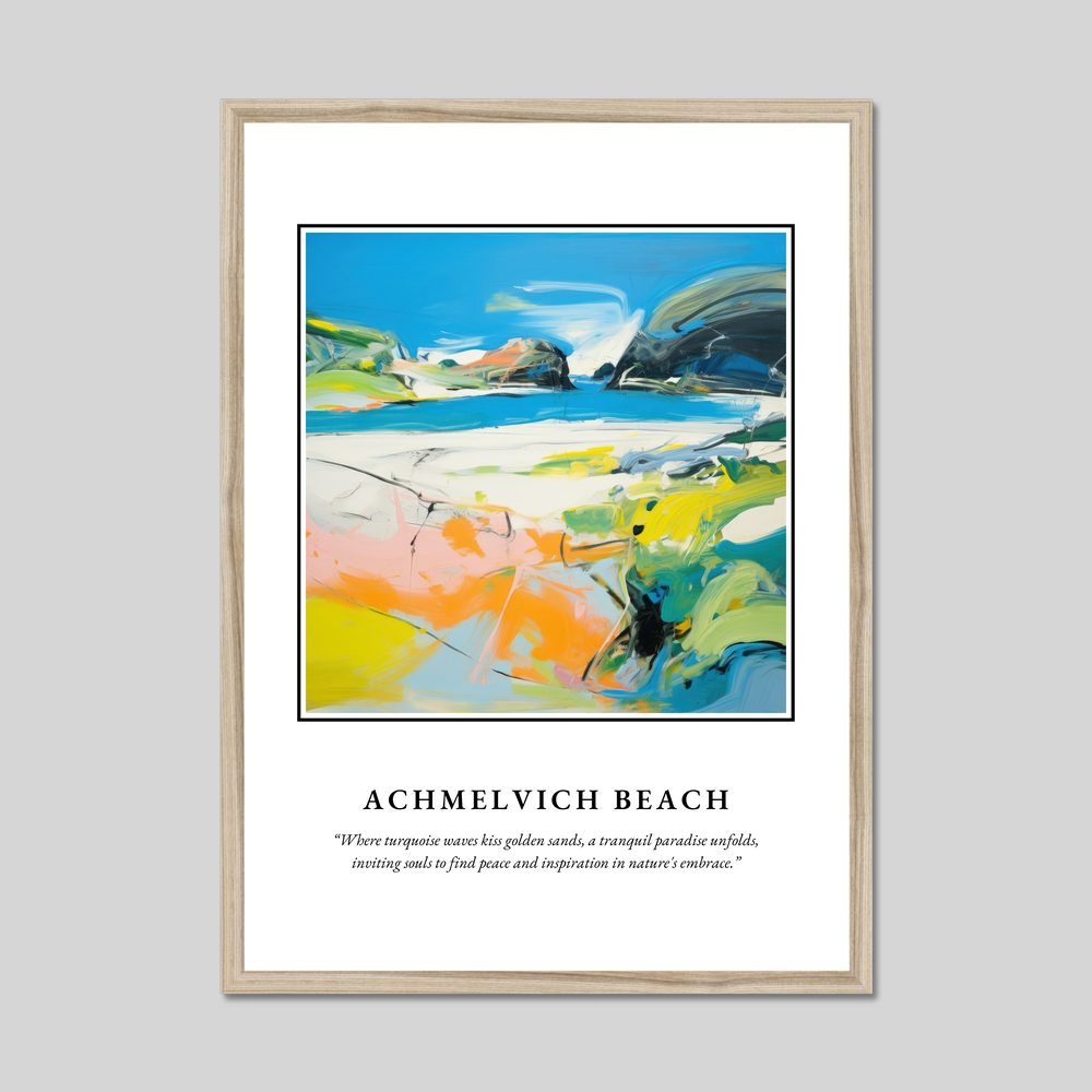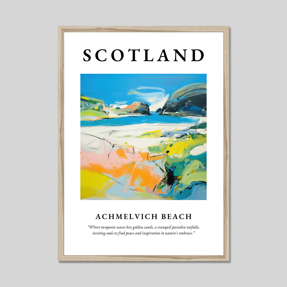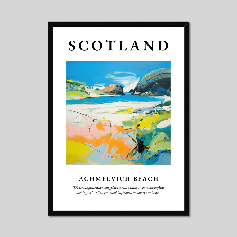Transform your space into a serene Scottish escape with our exquisite framed poster featuring Achmelvich Beach. Measuring an impressive 50cm x 70cm, this statement piece offers a generous canvas that captivates the viewer's imagination without breaking the bank. Available in a choice of three stylish frame finishes—black, white, or natural wood-effect—it seamlessly complements any décor, enhancing the overall aesthetic of your home or office.