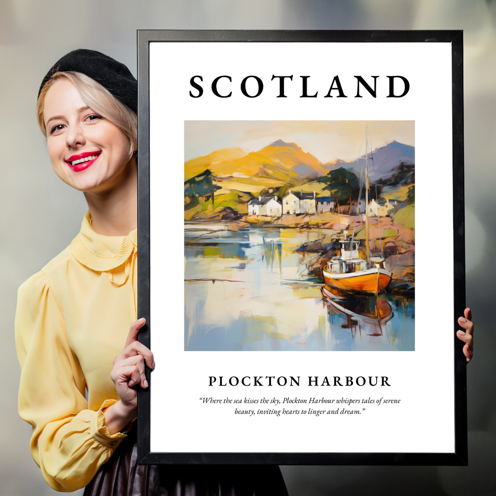 Underneath the painting, the quote “Where the sea kisses the sky, Plockton Harbour whispers tales of serene beauty, inviting hearts to linger and dream,” encapsulates the tranquil allure of this Scottish gem. For art lovers, fans of Abstract Expressionism, or anyone with a nostalgic connection to Plockton, this poster is a perfect fit.