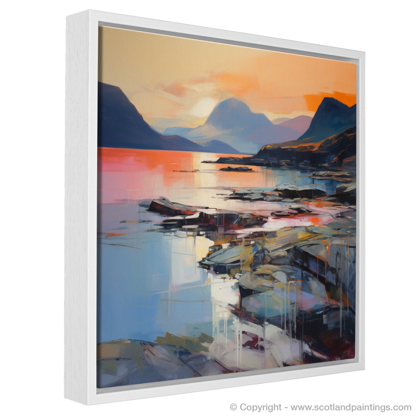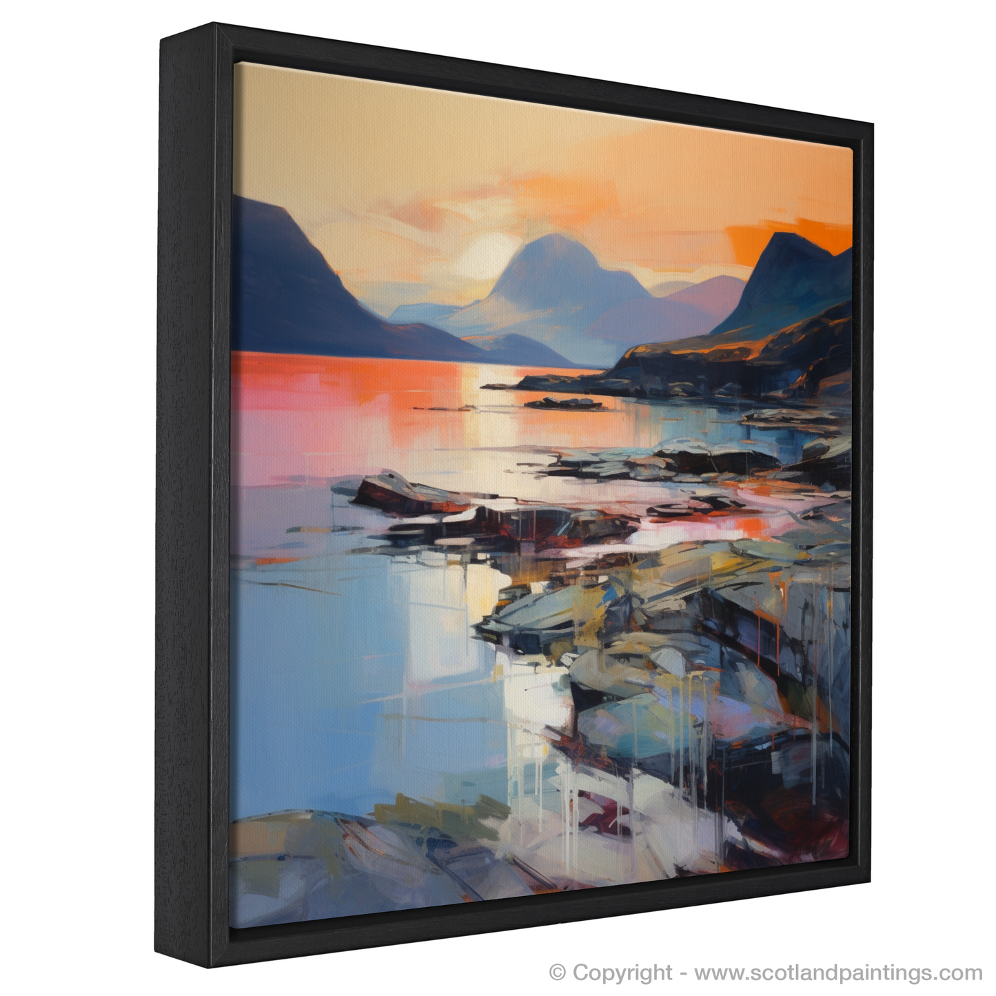 Captured within this evocative piece is the sheer essence of Elgol Bay, reimagined as a canvas that dances with the fleeting touch of the setting sun. The artwork, steeped in the technique of Abstract Impressionism, weaves a tapestry of vibrant hues and textured strokes that sing the languid song of Scottish coves at dusk.