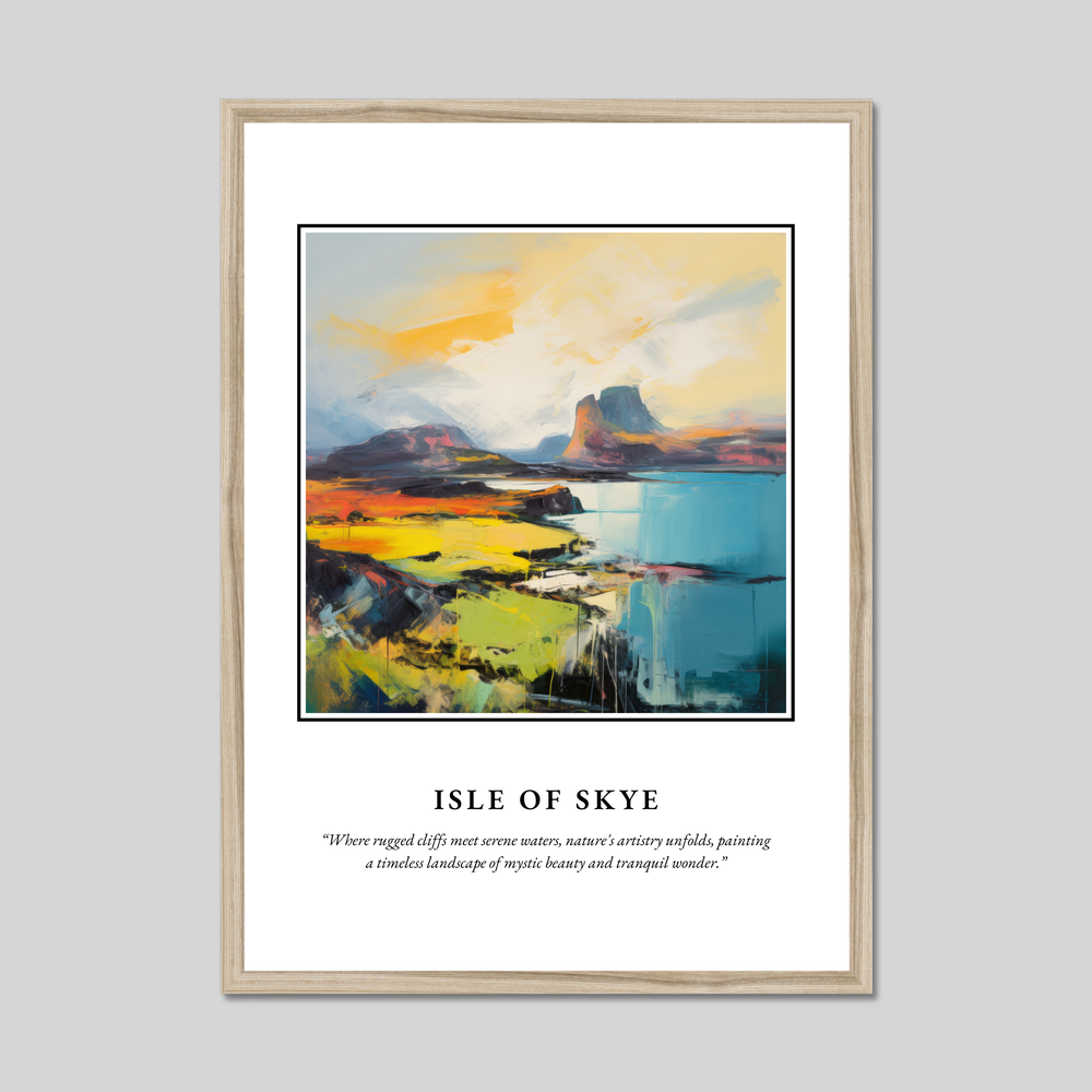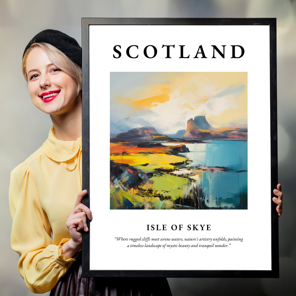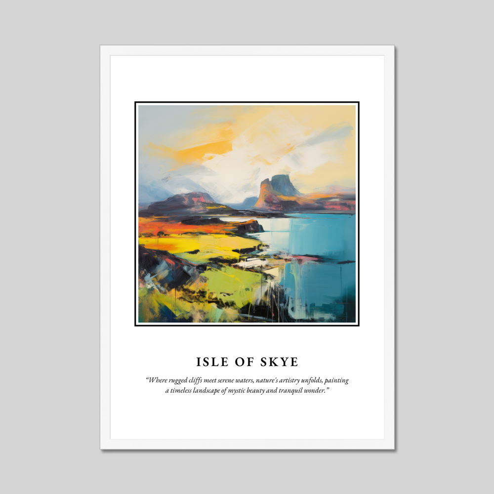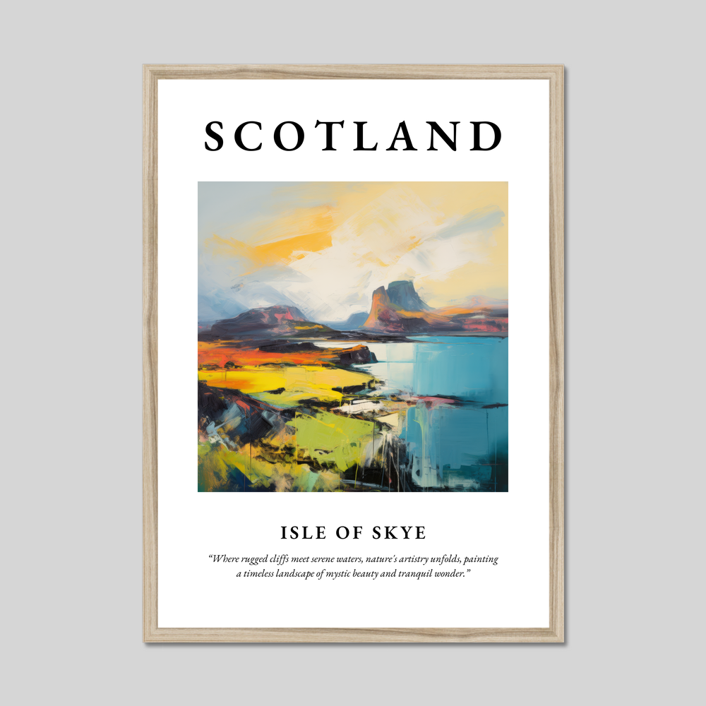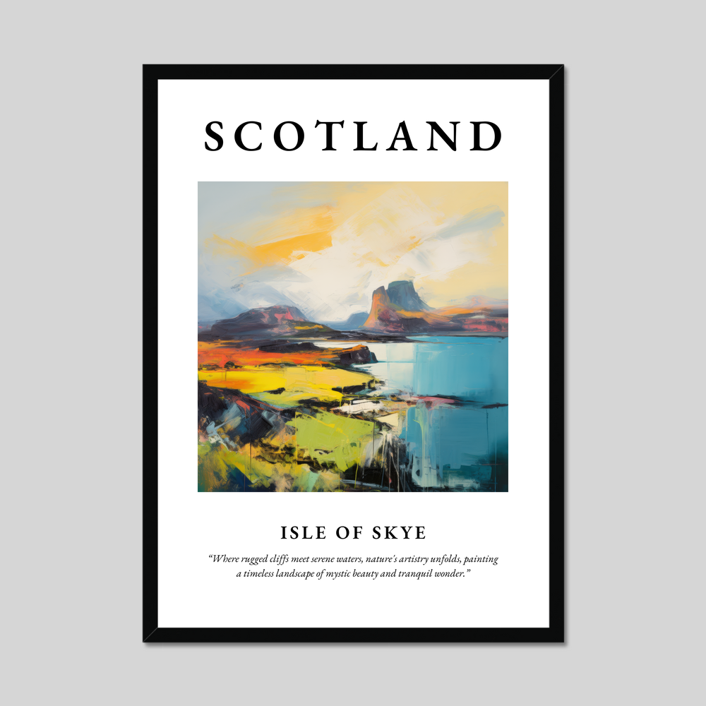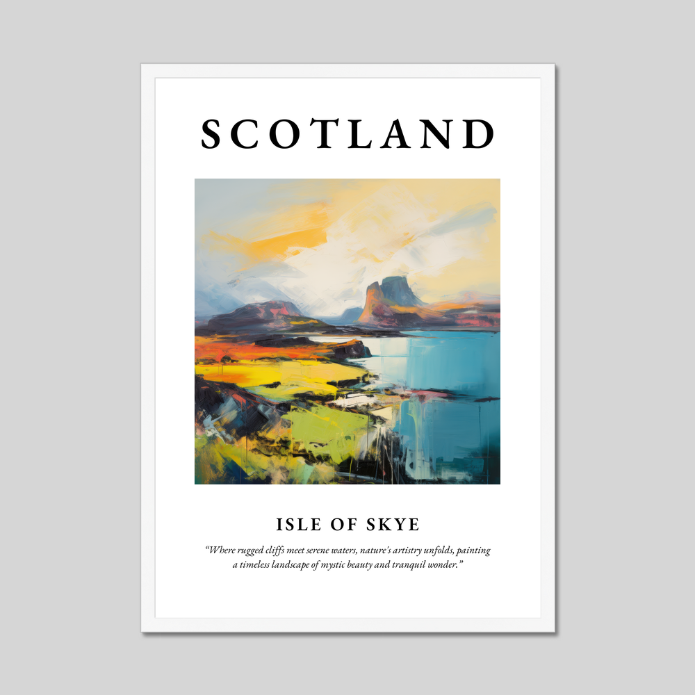 Available in a choice of black, white, or a natural wood-effect frame, this striking poster features bold “SCOTLAND” lettering at the top, making a strong visual statement. Below lies an evocative painting of the Isle of Skye in the dynamic style of Abstract Expressionism. Vibrant hues and textured brushstrokes converge to capture the rugged cliffs and serene waters of this iconic landscape, evoking an emotive response from those captivated by art and nature alike.