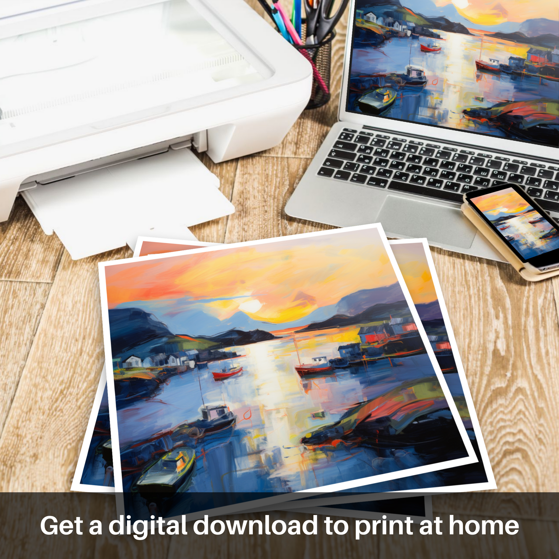 This print, part of the 'Scottish Harbours' collection, pays homage to the fleeting moment when day transitions into night, encapsulating the tranquil beauty and raw emotion that Isleornsay Harbour embodies at this magical hour. It's a sophisticated celebration of colour and form, designed to captivate and inspire, perfect for anyone seeking to bring a touch of Scottish enchantment and artistic flair into their living space.