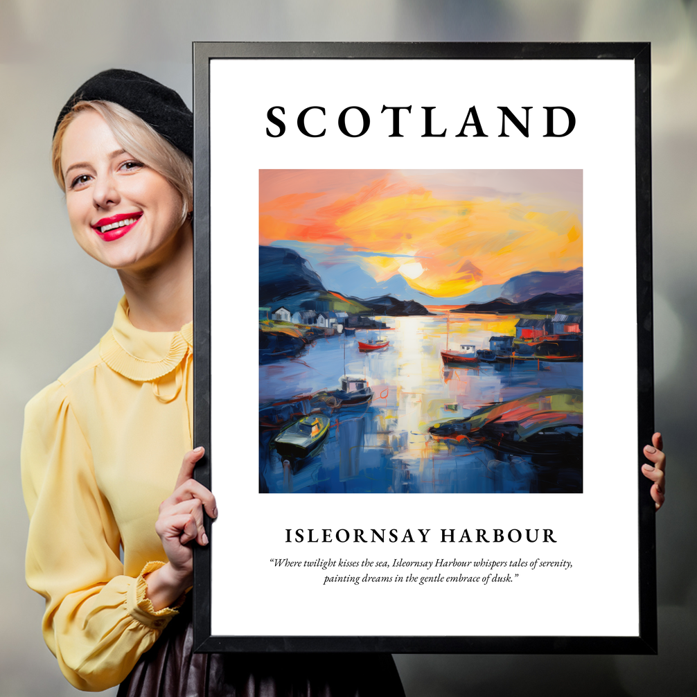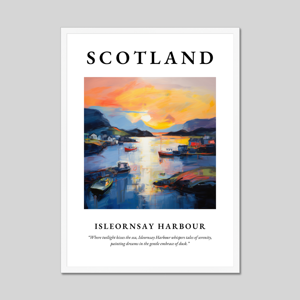 Featuring the bold proclamation “SCOTLAND,” this poster proudly showcases a breathtaking interpretation of Isleornsay Harbour in the beloved Abstract Expressionism style. Rich, vibrant strokes depict the serene harbour at twilight, where the sun kisses the horizon, casting a warm glow over the tranquil waters. The scene is a mesmerising blend of vivid hues and soft brushwork, capturing the essence of a place where calmness reigns. Below the painting, the evocative quote “Where twilight kisses the sea, Isleornsay Harbour whispers tales of serenity, painting dreams in the gentle embrace of dusk” invites you to lose yourself in the quiet magic of Scotland.