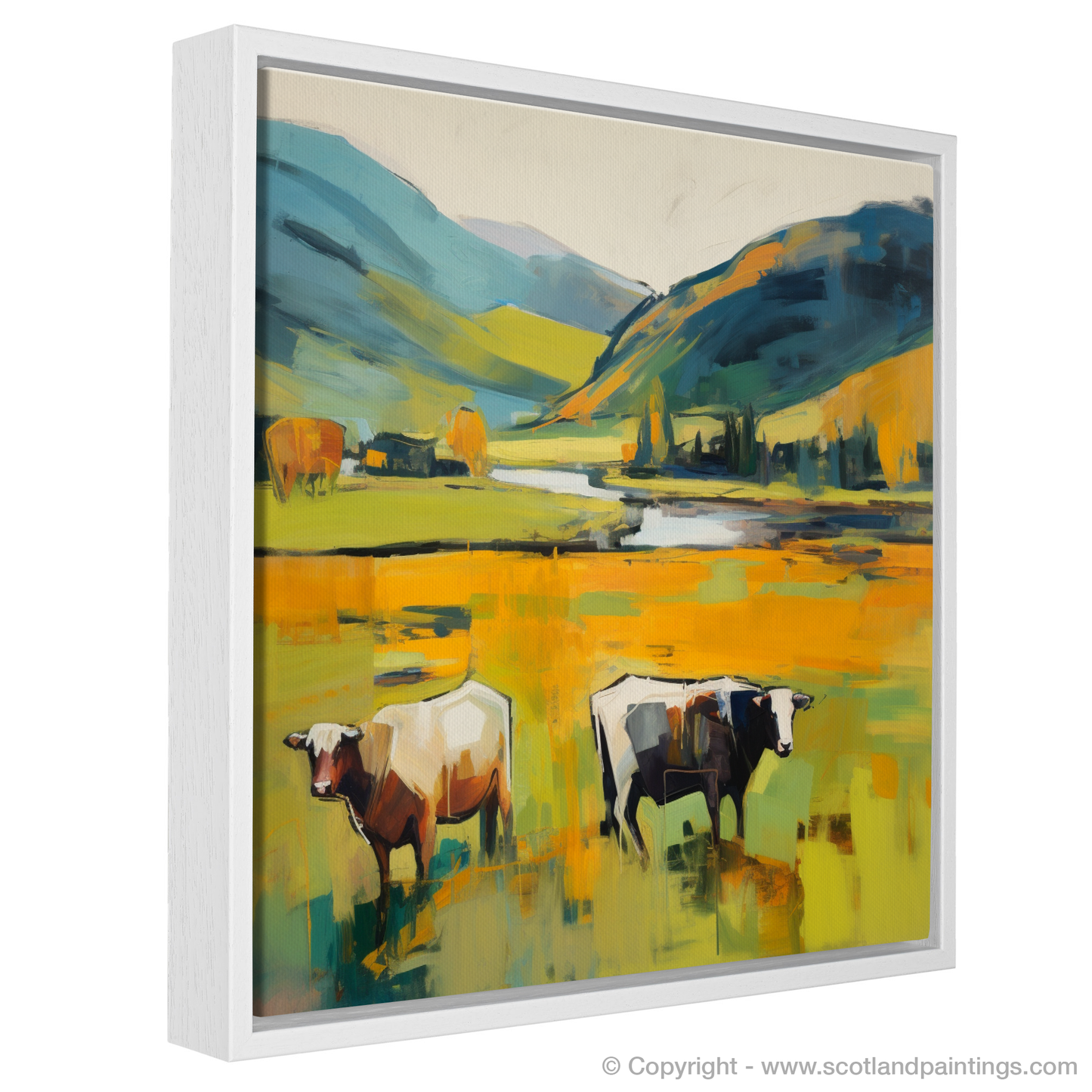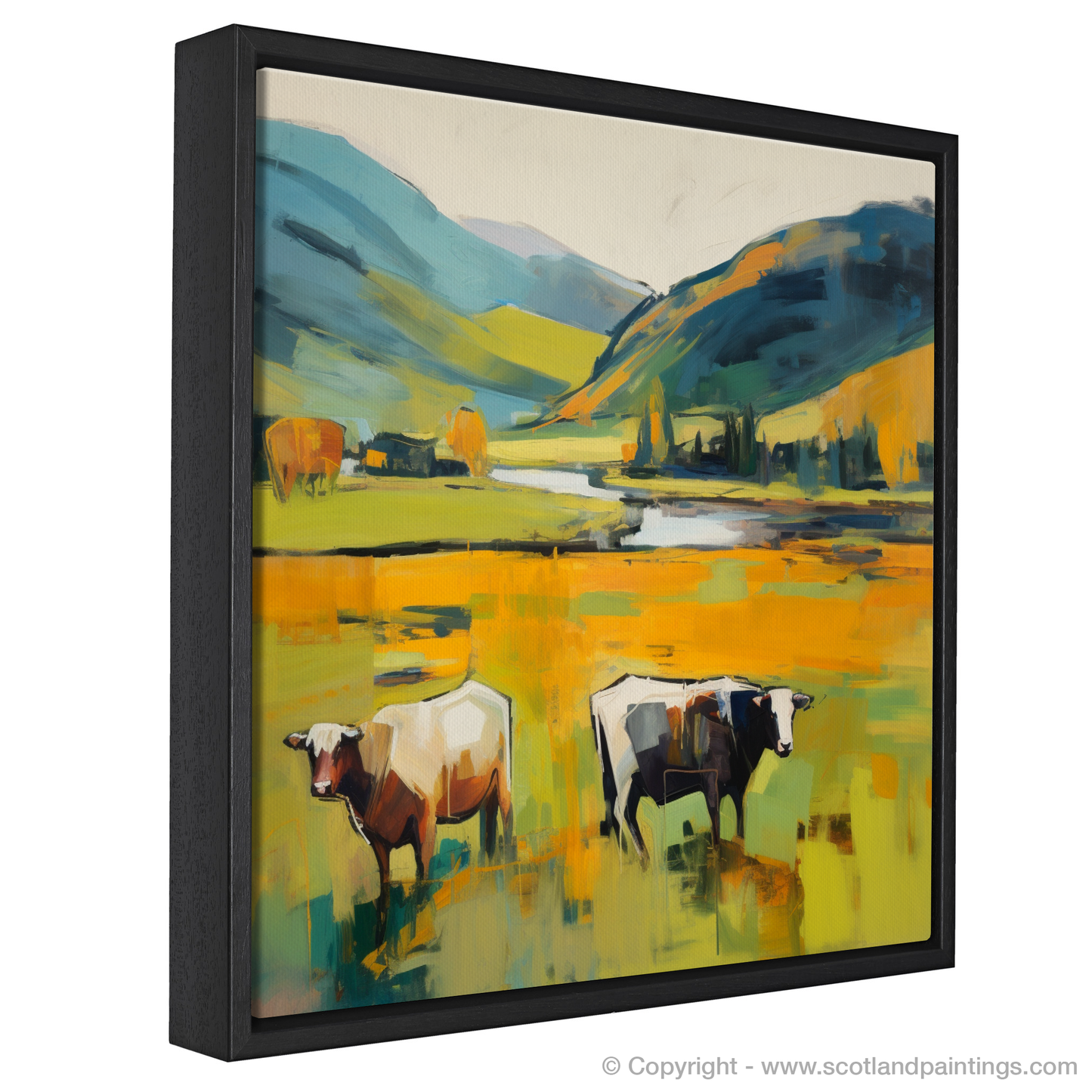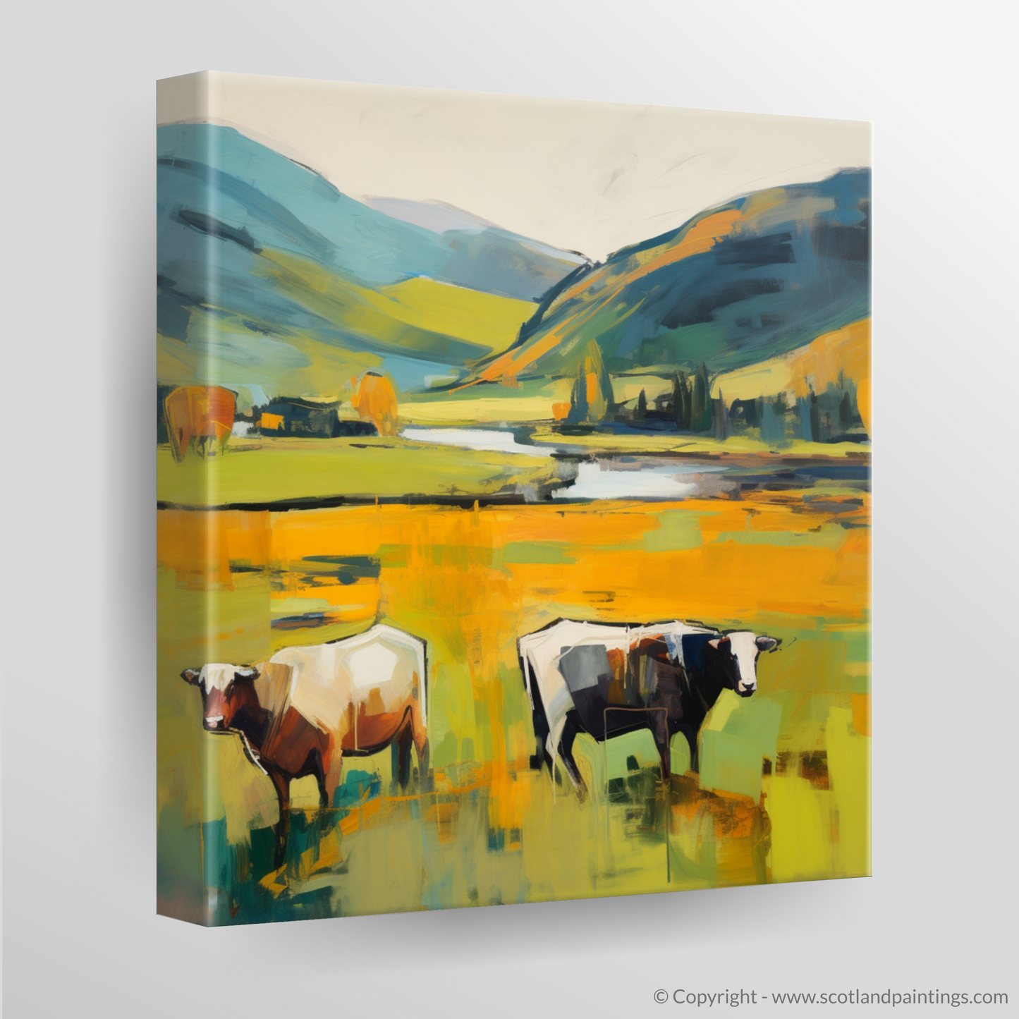 Standing proudly within this dreamscape are the stoic figures of Highland cows, their forms rendered with an impressionistic touch that conveys both movement and repose. The distinctive silhouettes of these gentle giants are cloaked in hues that reflect the earthy tones of Glencoe, with accents of creamy whites and deep, shadowy blacks adding depth and character.