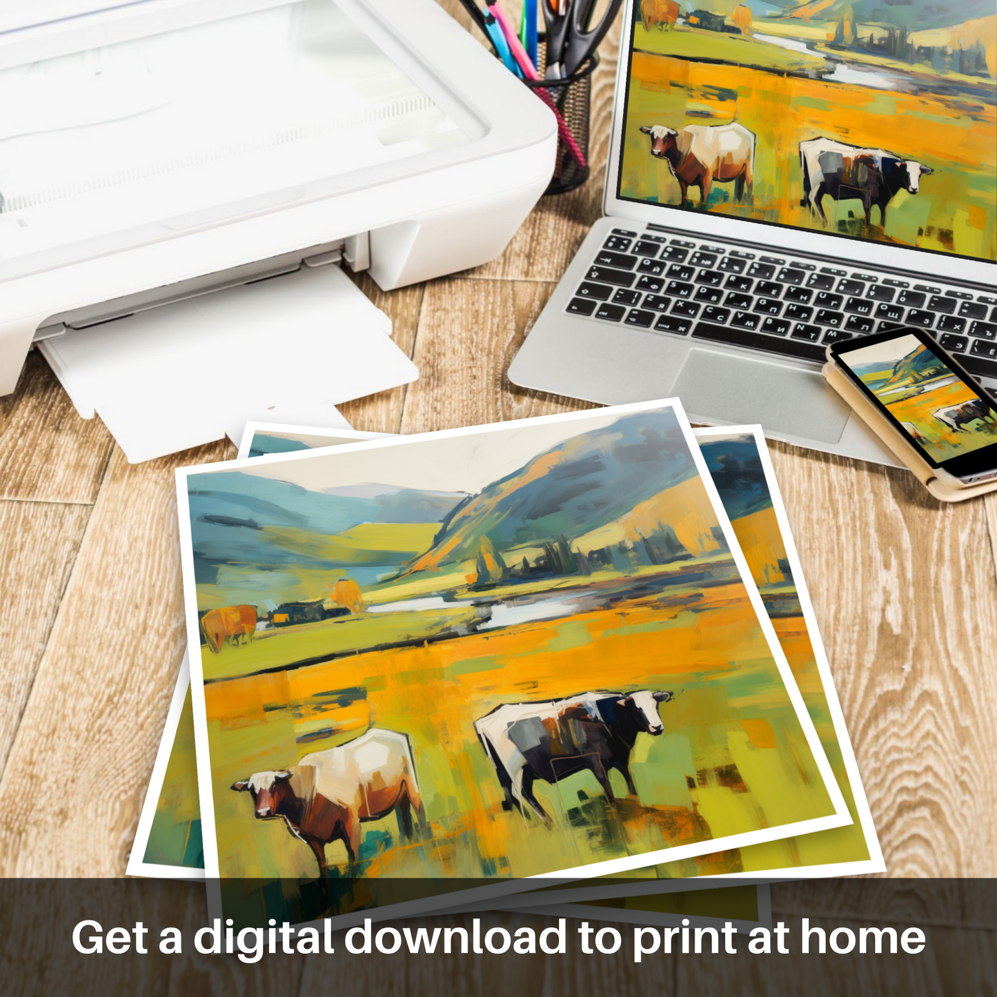 The landscape behind these easy-going bovines echoes with the golds and ambers of the moor, juxtaposed against the serene blues and greens that hint at the distant rolling hills. The foreground, a kaleidoscopic display of yellow and orange, suggests a meadow ablaze with the last embers of sunlight, while a languid river weaves through, mirroring the sky and bringing a sense of tranquillity to the composition.