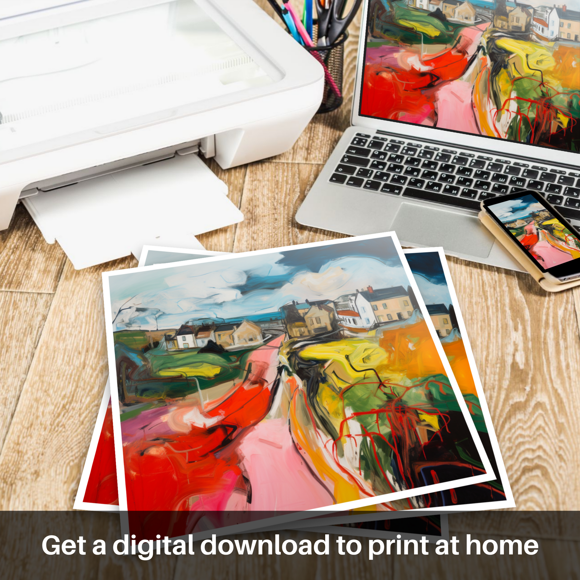 Capturing the essence of Elgin, Moray through the dynamic interplay of colour and form, this evocative print is an abstract expressionist's tribute to the unique character of the Scottish regions. Swirls of deep reds and vibrant yellows dominate the foreground, suggesting the region's untamed vitality and earthy beauty, while the bold strokes of green and purple hint at the lushness of the Scottish landscapes.