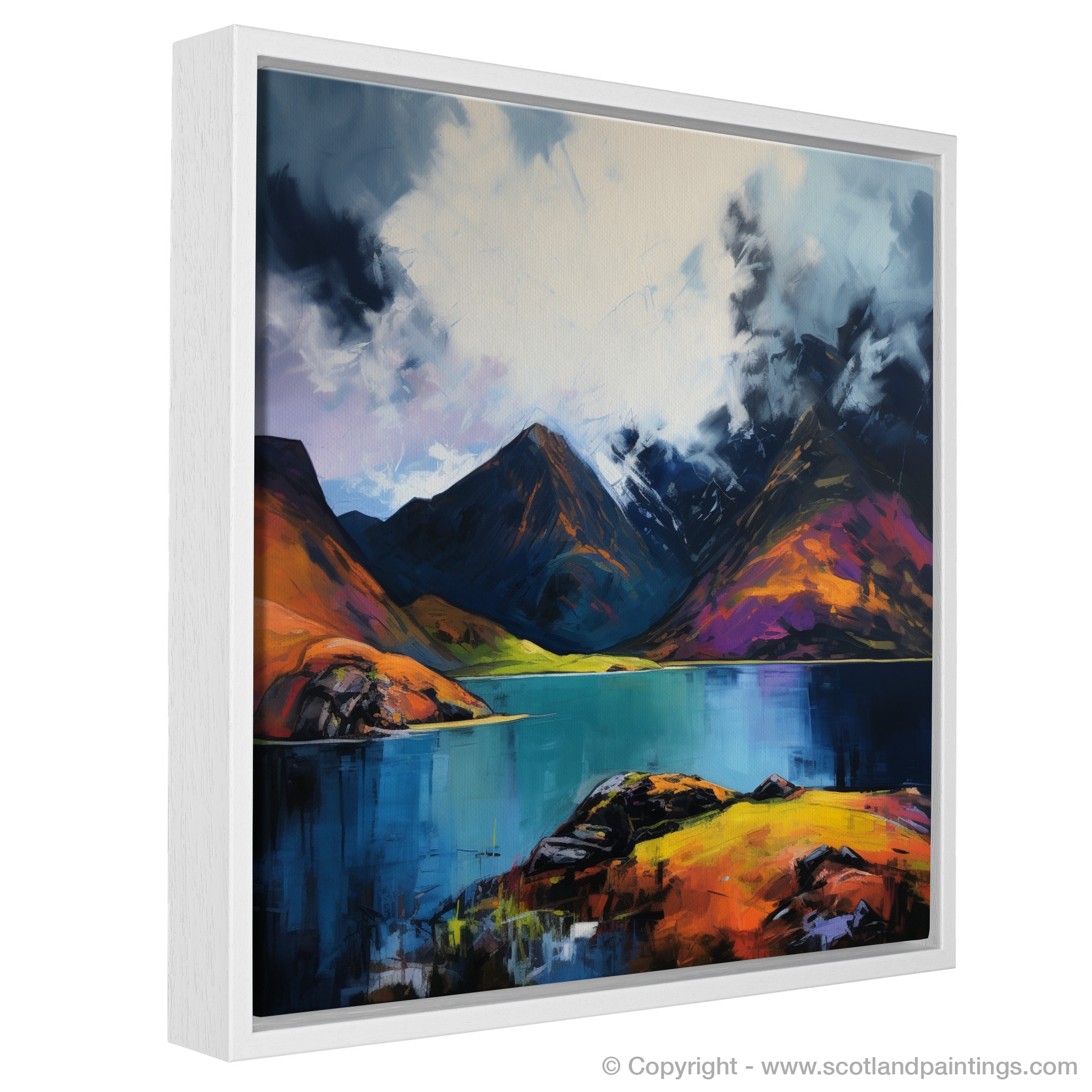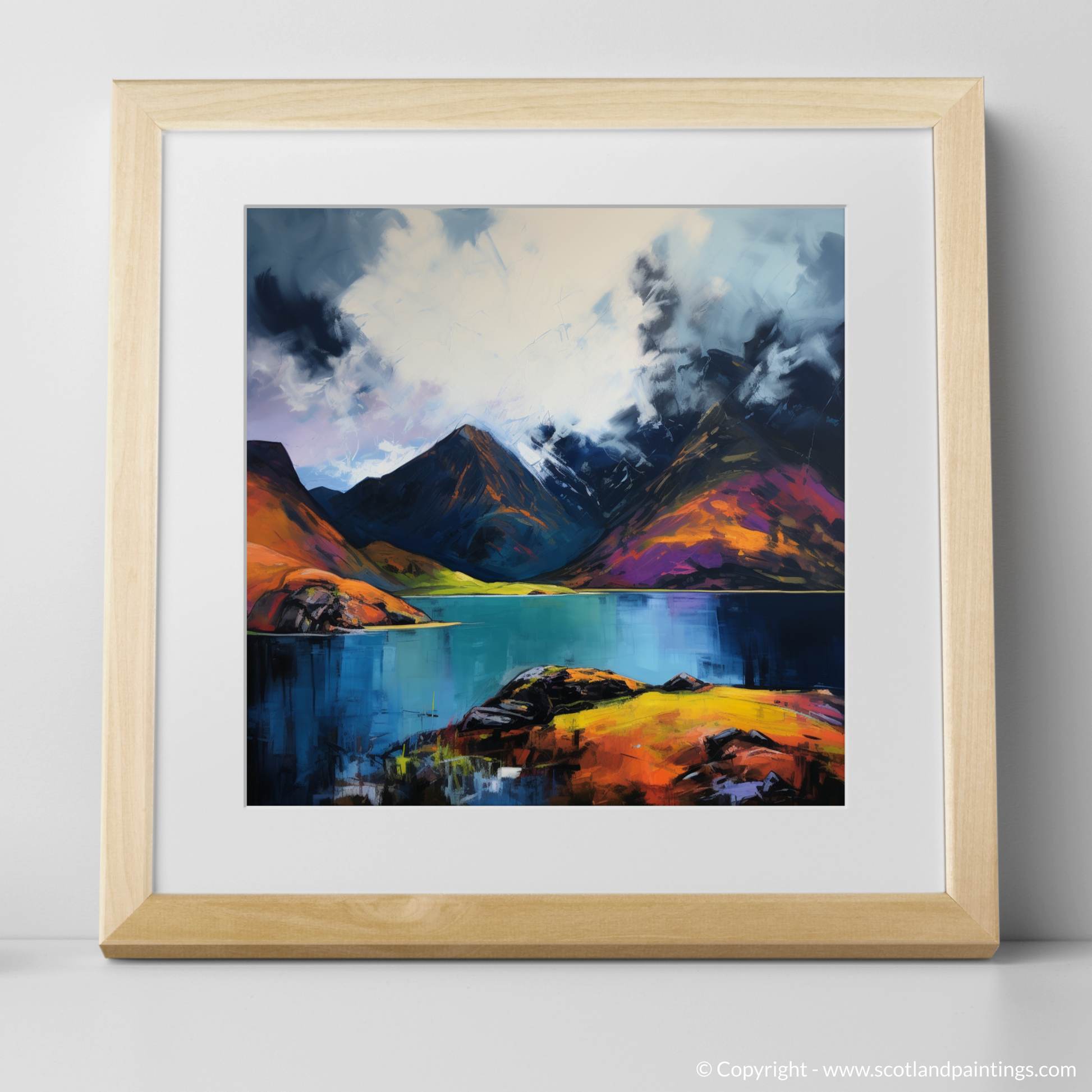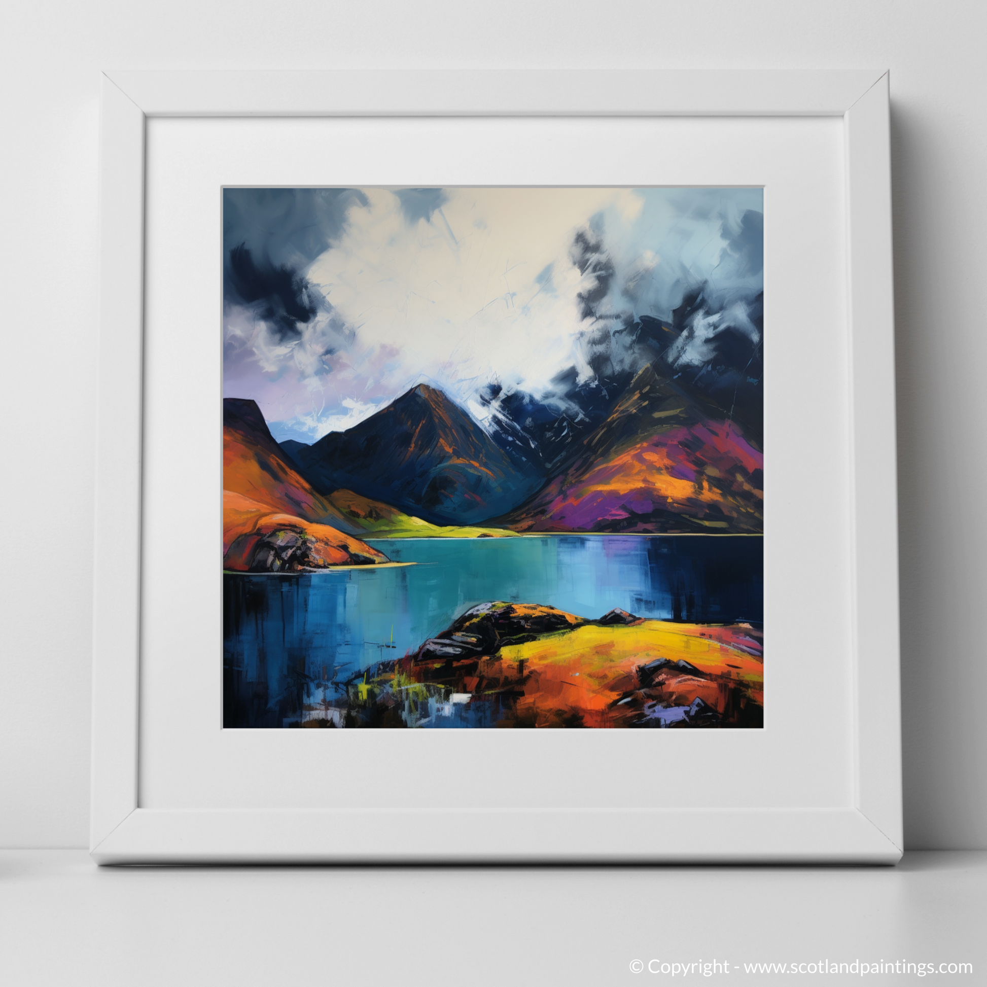 Captivating and tumultuous, this vibrant print brings to life the dramatic scenery of one of Scotland's most secluded natural wonders. Echoing the unbridled spirit of Expressionism, the piece evokes the heightened emotional resonance of Loch Coruisk's wild beauty. The canvas is a riot of colour and movement; stark contrasts and fierce strokes conjure up a stormy sky, brooding with dark, heavy clouds that loom over the imposing mountain peaks.