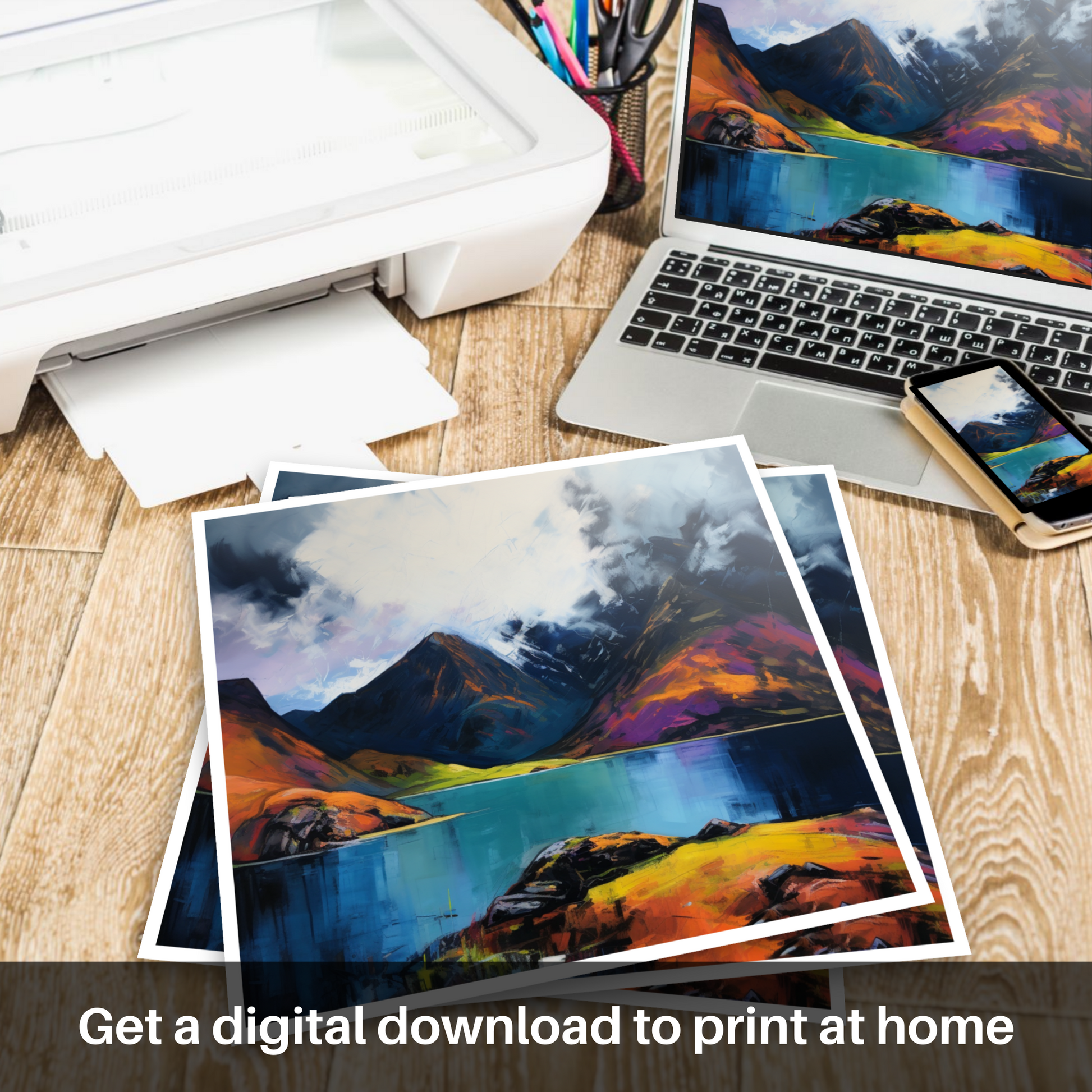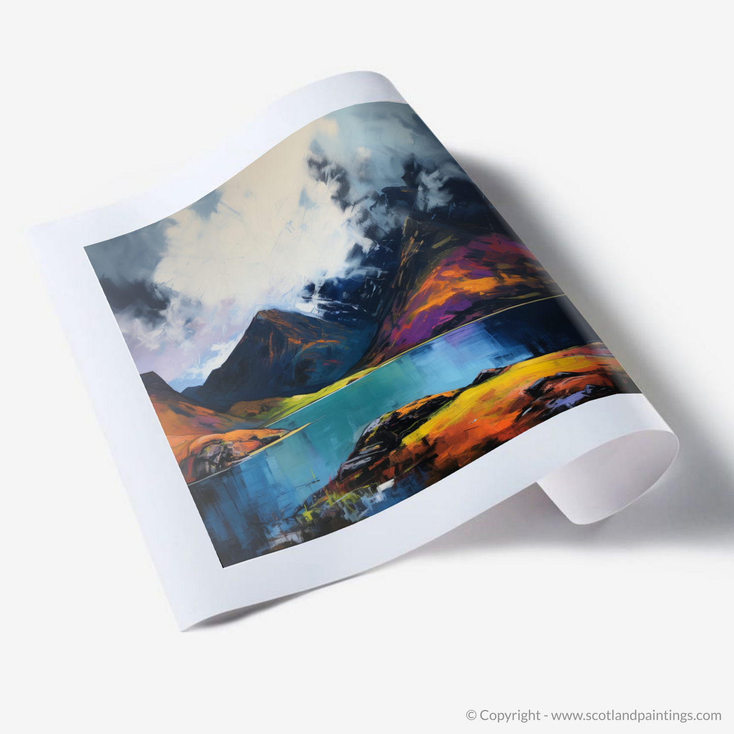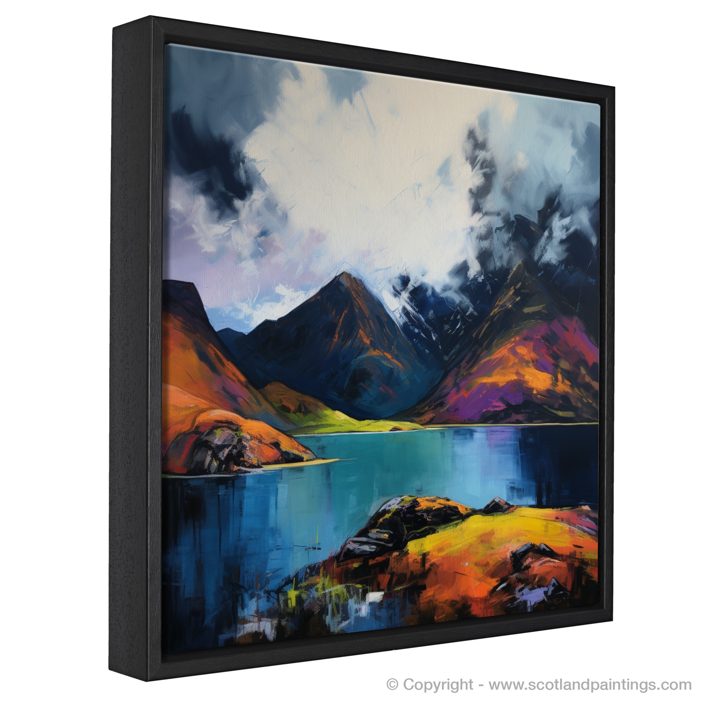 Captivating and tumultuous, this vibrant print brings to life the dramatic scenery of one of Scotland's most secluded natural wonders. Echoing the unbridled spirit of Expressionism, the piece evokes the heightened emotional resonance of Loch Coruisk's wild beauty. The canvas is a riot of colour and movement; stark contrasts and fierce strokes conjure up a stormy sky, brooding with dark, heavy clouds that loom over the imposing mountain peaks.