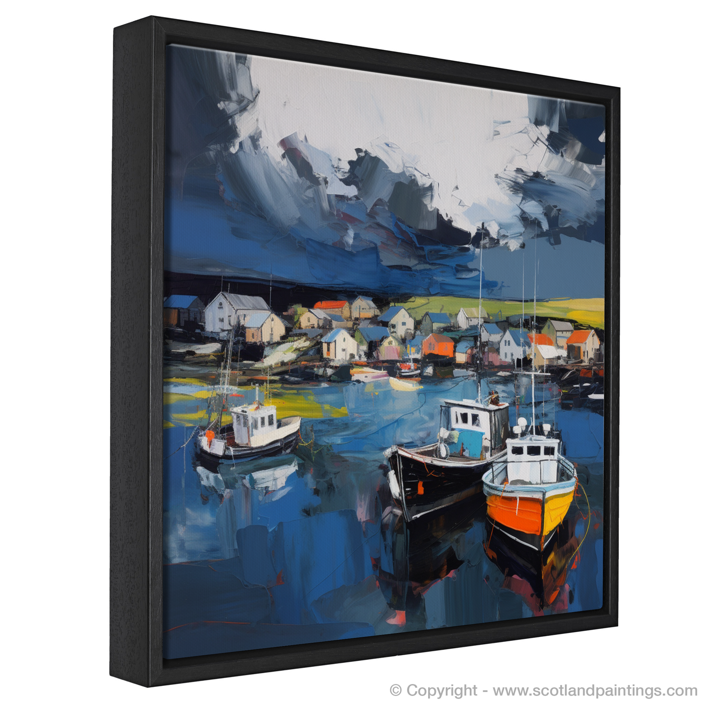 Below, the water lies mirror-calm, reflecting the turmoil above in a symphony of deep navy interspersed with shocks of cobalt. The colourful boats, with their orange and yellow hues, pop against the otherwise muted tones of the harbour, creating focal points that draw the eye.