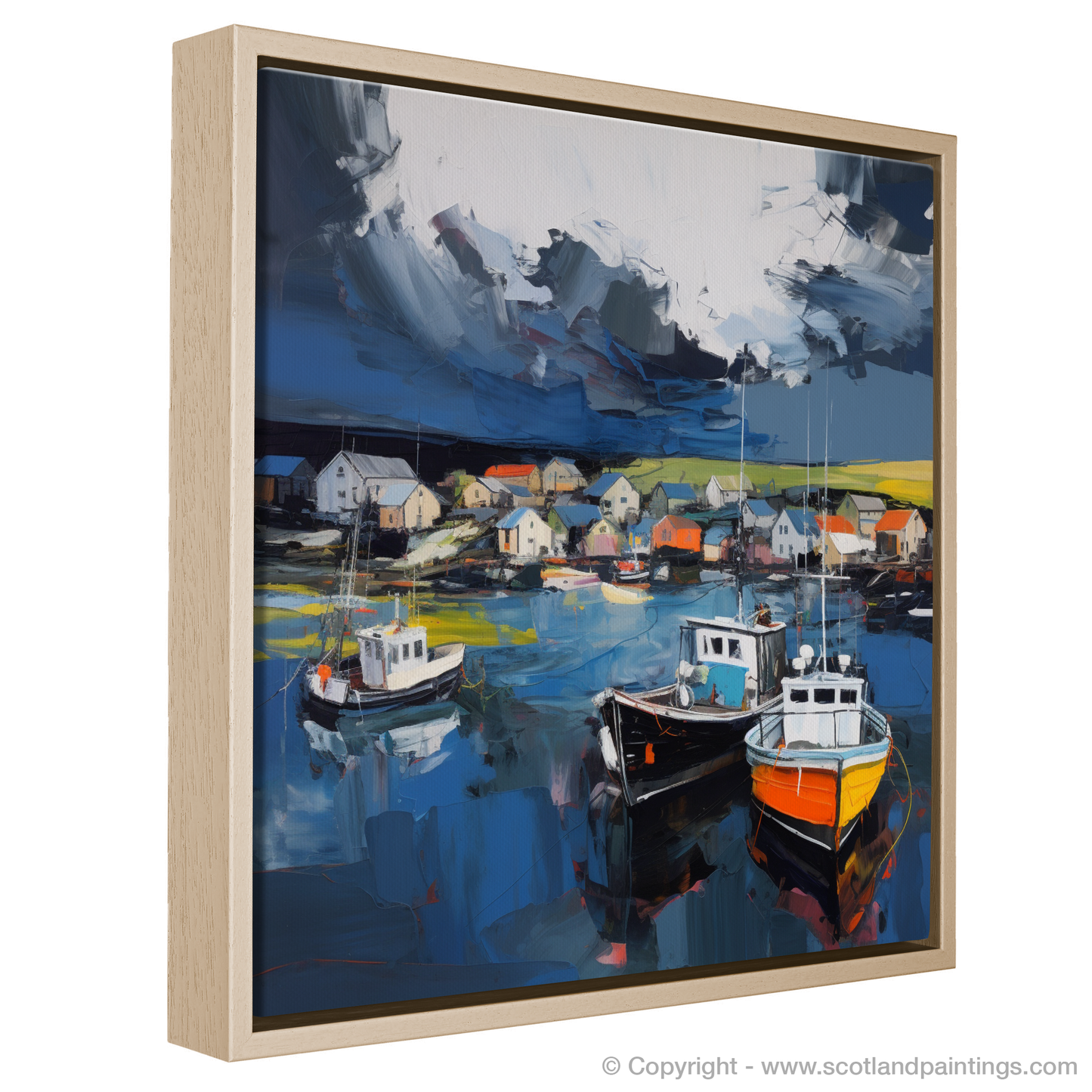 The harbour setting is alive with movement, despite the stillness of the boats. The brooding stormy sky, rendered with sweeping, urgent layers of dark and light blues, looms large over the tranquil village. The stark contrasts between the dark threatening clouds and the pockets of bright, clear sky add to the dramatic atmosphere.