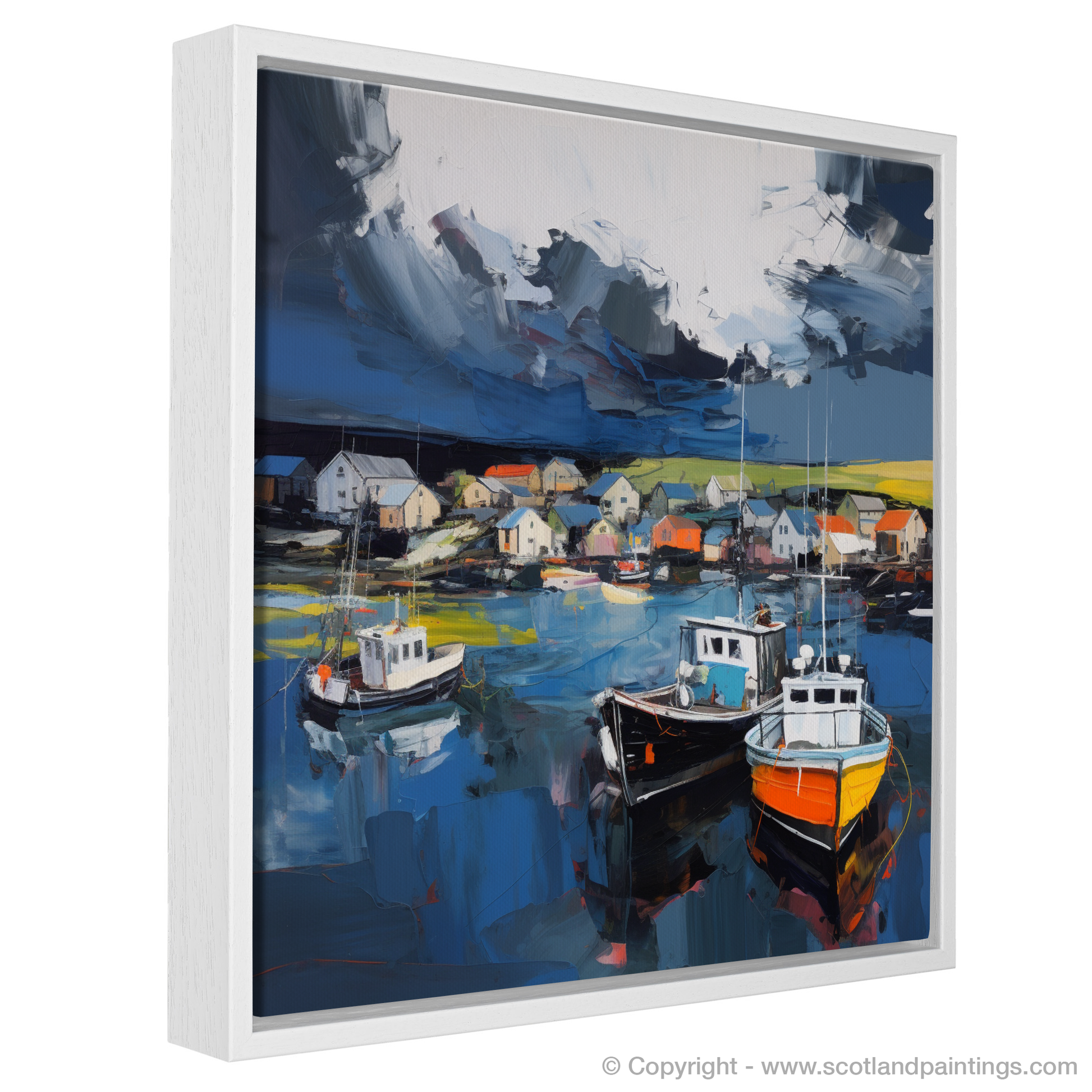 Painting and Art Print of St Abba's Harbour with a stormy sky entitled "Storm Over St Abba's Harbour: An Expressionist Ode to Scottish Resilience".