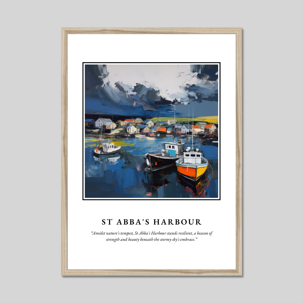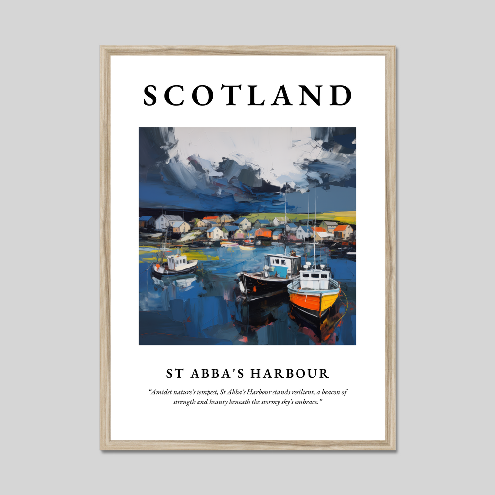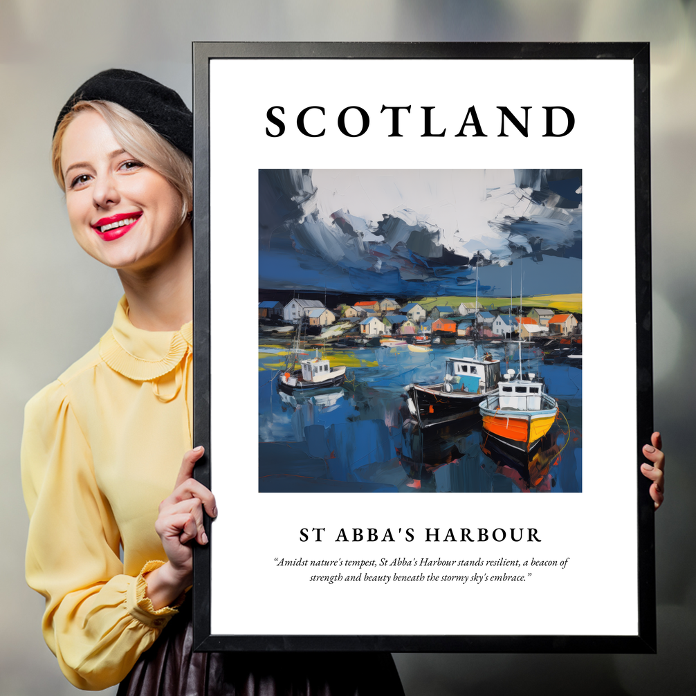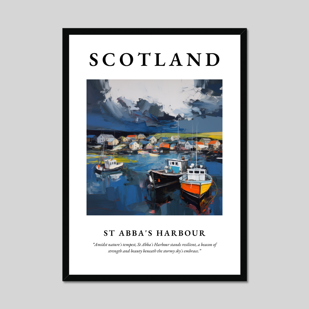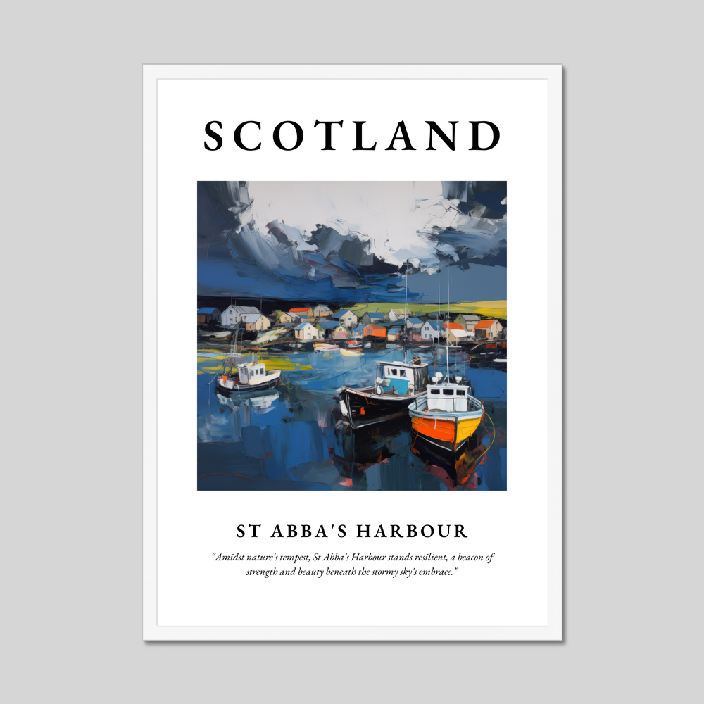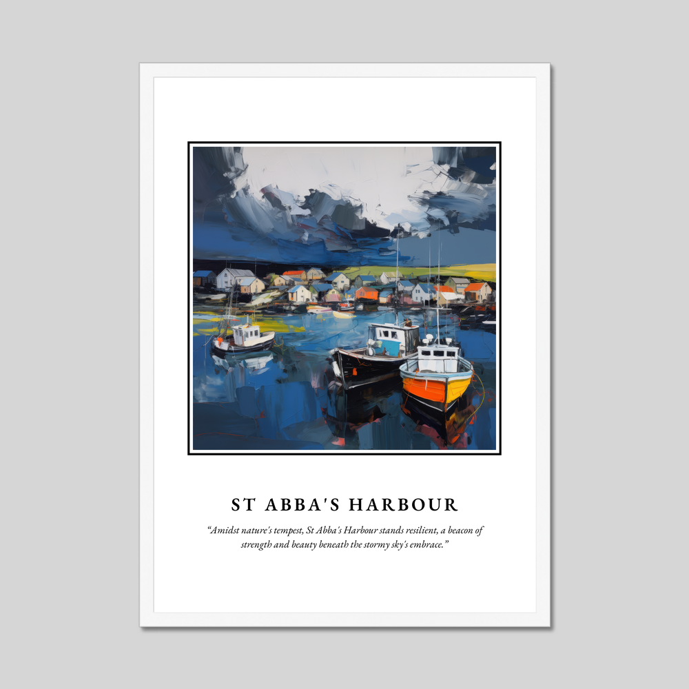 At the heart of this powerful artwork is an expressionist portrayal of St Abba's Harbour, where bold, energetic strokes capture the dynamic interplay of sky and sea. The word "SCOTLAND" crowns the piece in big, bold lettering, setting the stage for the evocative scene below. Beneath the vivid painting, the quote reads: “Amidst nature's tempest, St Abba's Harbour stands resilient, a beacon of strength and beauty beneath the stormy sky's embrace.”
