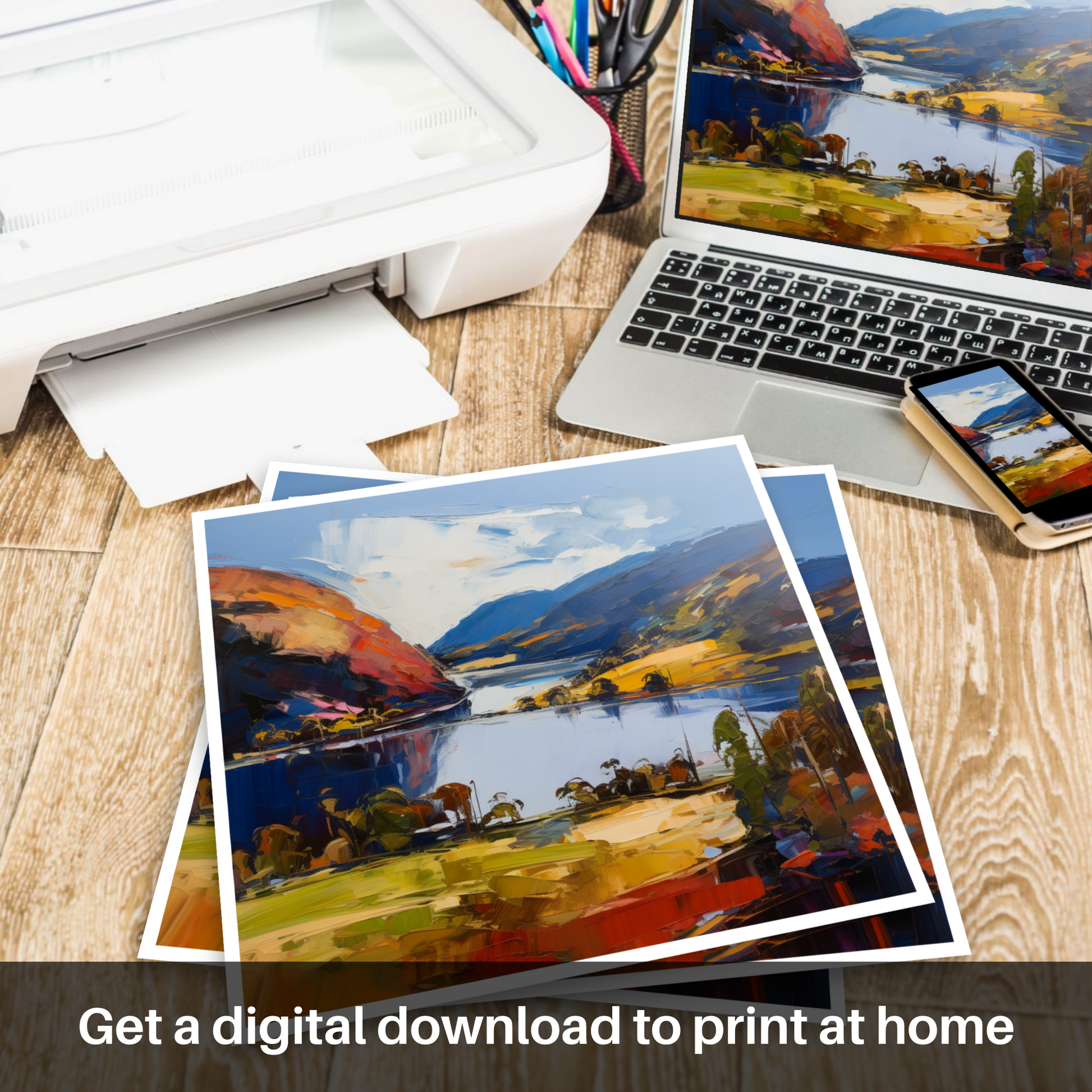 With its rich textures and evocative use of colour, this piece is more than a mere representation; it's an emotional rendering that communicates the soul-stirring magnificence of the Scottish Highlands. Whether you're a lover of expressive art or the untamed beauty of Scotland's landscapes, this print will serve as a striking focal point in any space, inviting contemplation and wanderlust.
