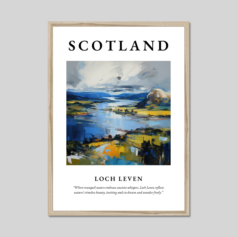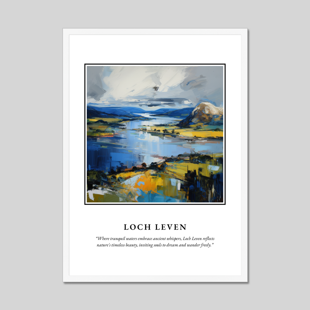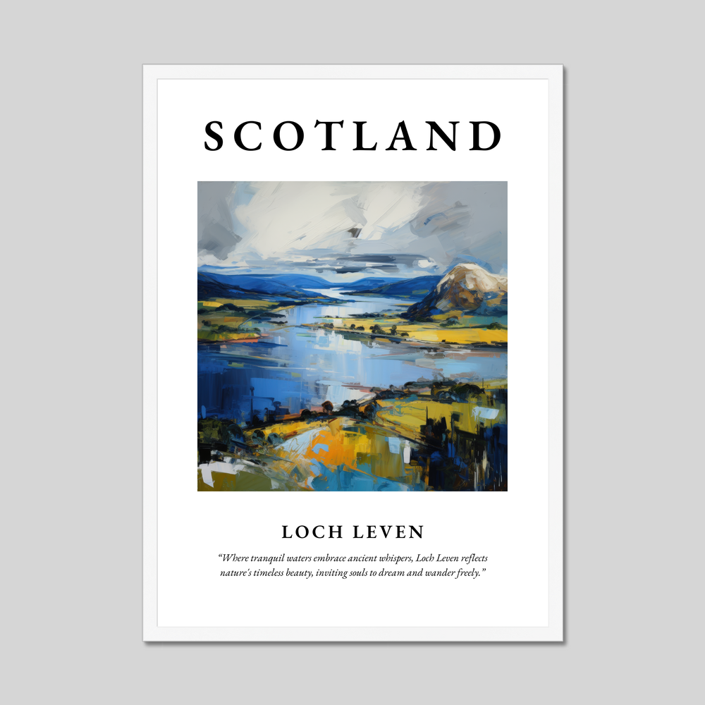 At the heart of this piece is the word “SCOTLAND” emblazoned boldly at the top, setting the stage for a breathtaking expressionist painting of Loch Leven. This artwork is a vivid dance of colours and brushstrokes, portraying the serene waters and rolling landscapes with a dreamlike quality typical of the expressionism style. Beneath this vibrant depiction lies a poetic homage: “Where tranquil waters embrace ancient whispers, Loch Leven reflects nature's timeless beauty, inviting souls to dream and wander freely.” Perfect for art lovers and admirers of expressionism, this poster offers a large window into the enchanting world of the Scottish Highlands without an exorbitant price tag.